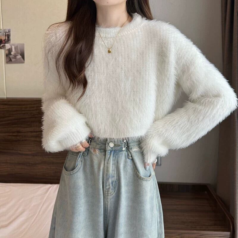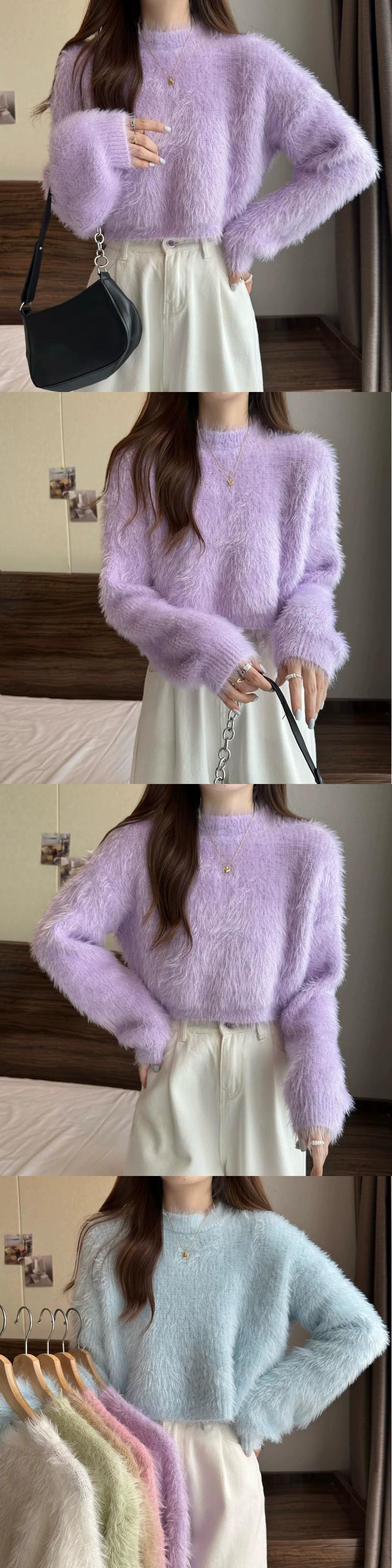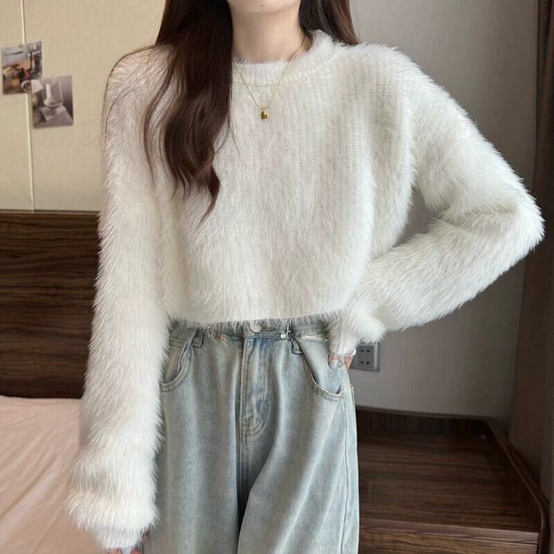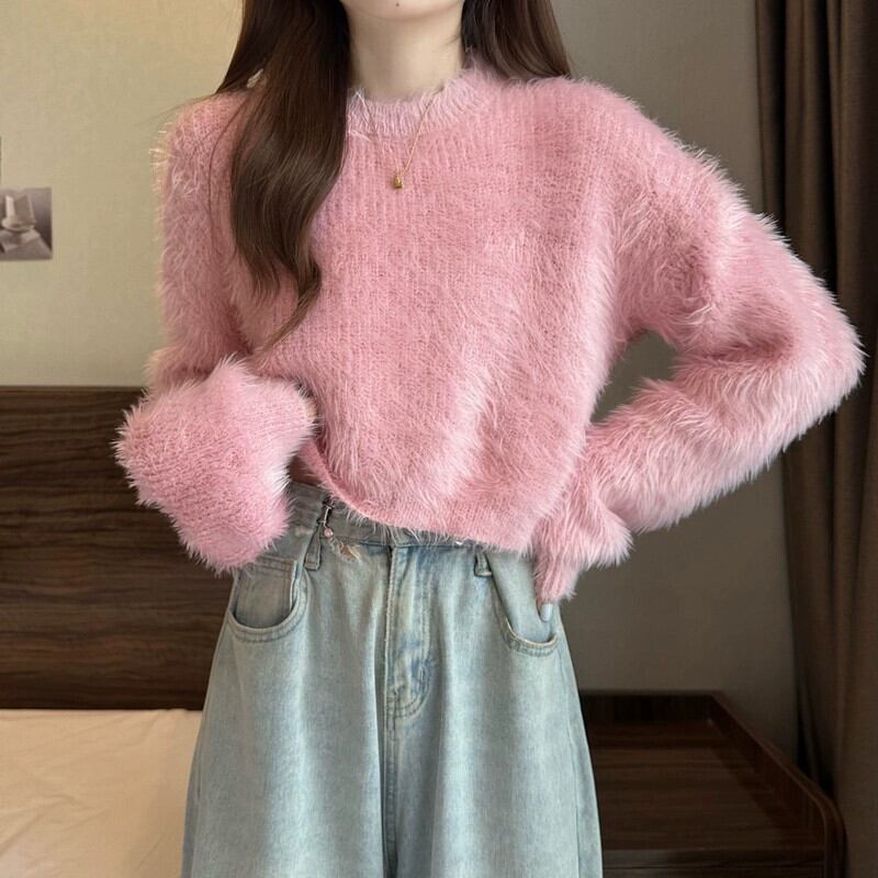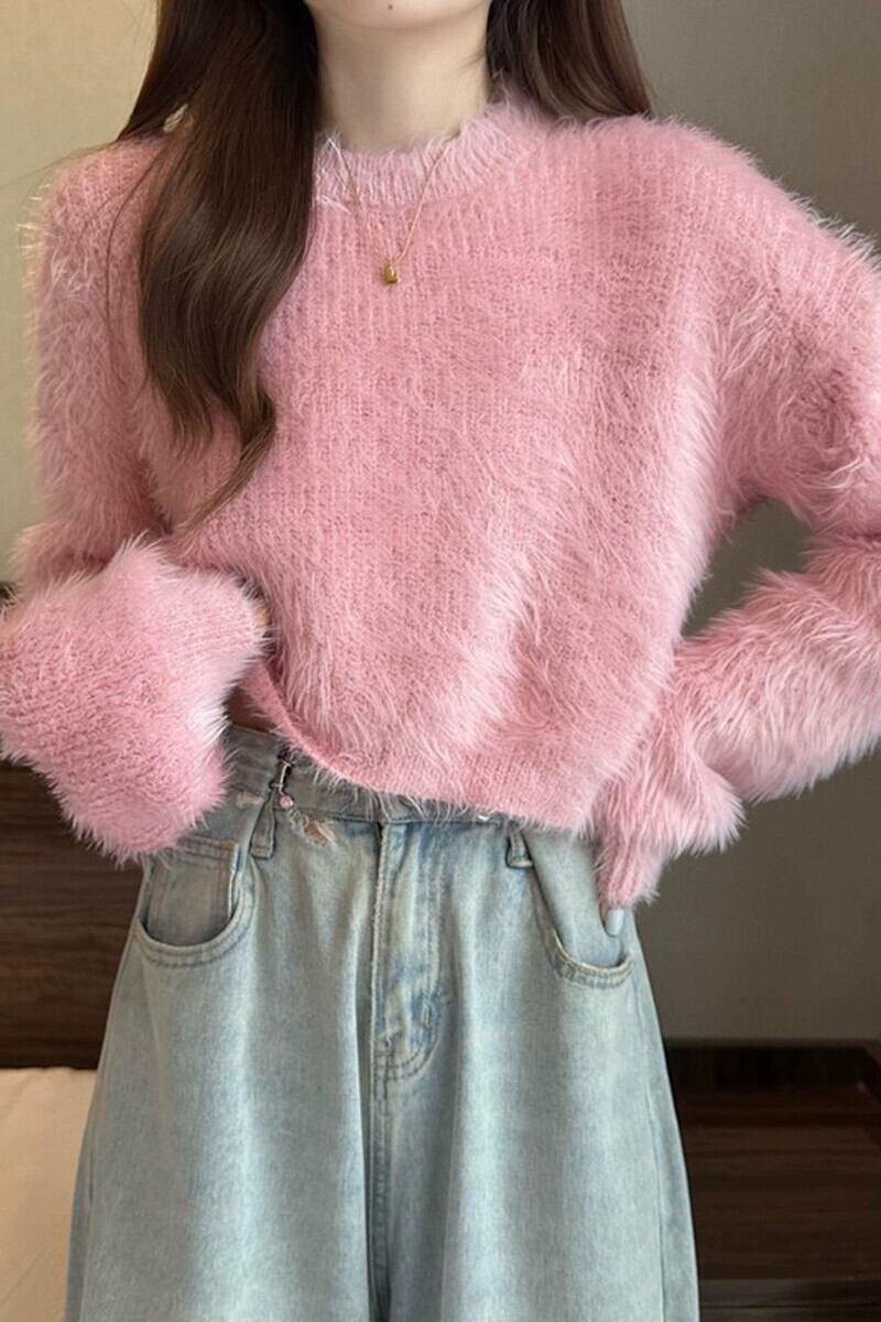 ピンクモヘアセーター女性秋と冬 2023 新しいルーズアウターウェア小さなハイウエストショートニットトップ ハイウェスト オータム 秋物 ウィンター 冬物 7460022510721865 | framboise21