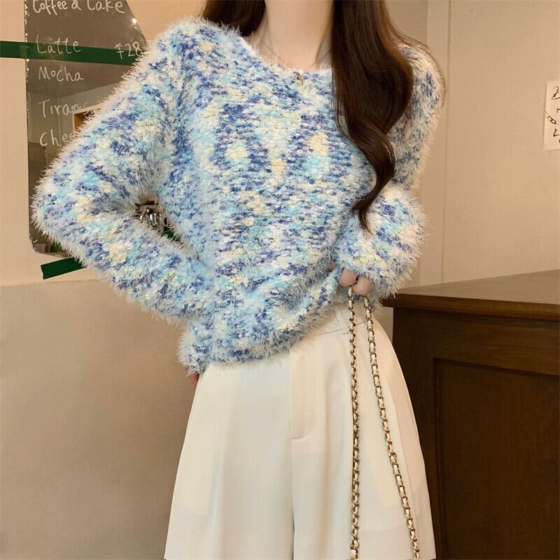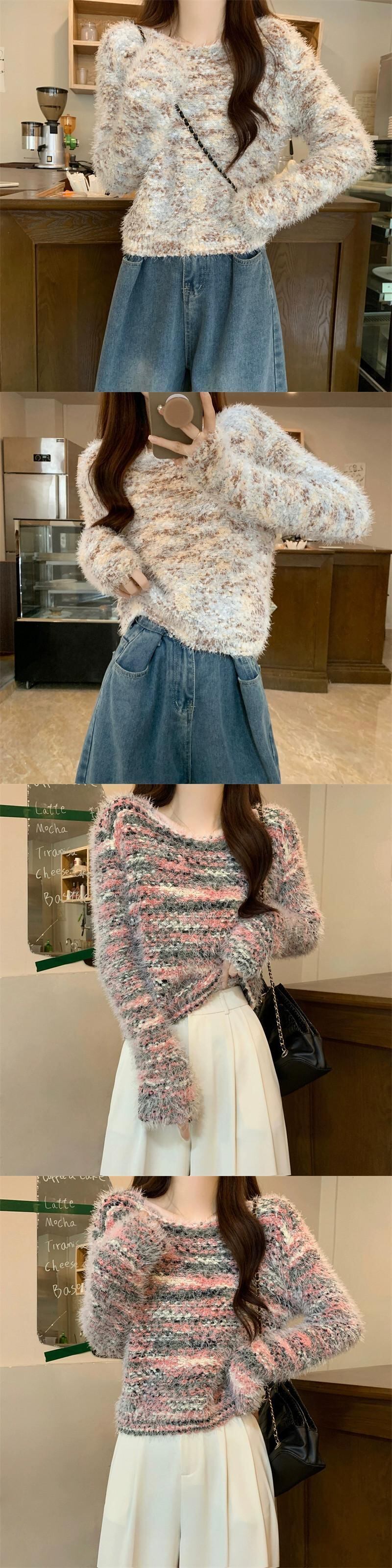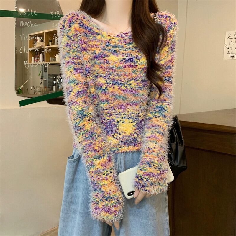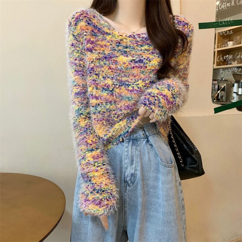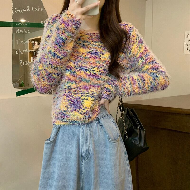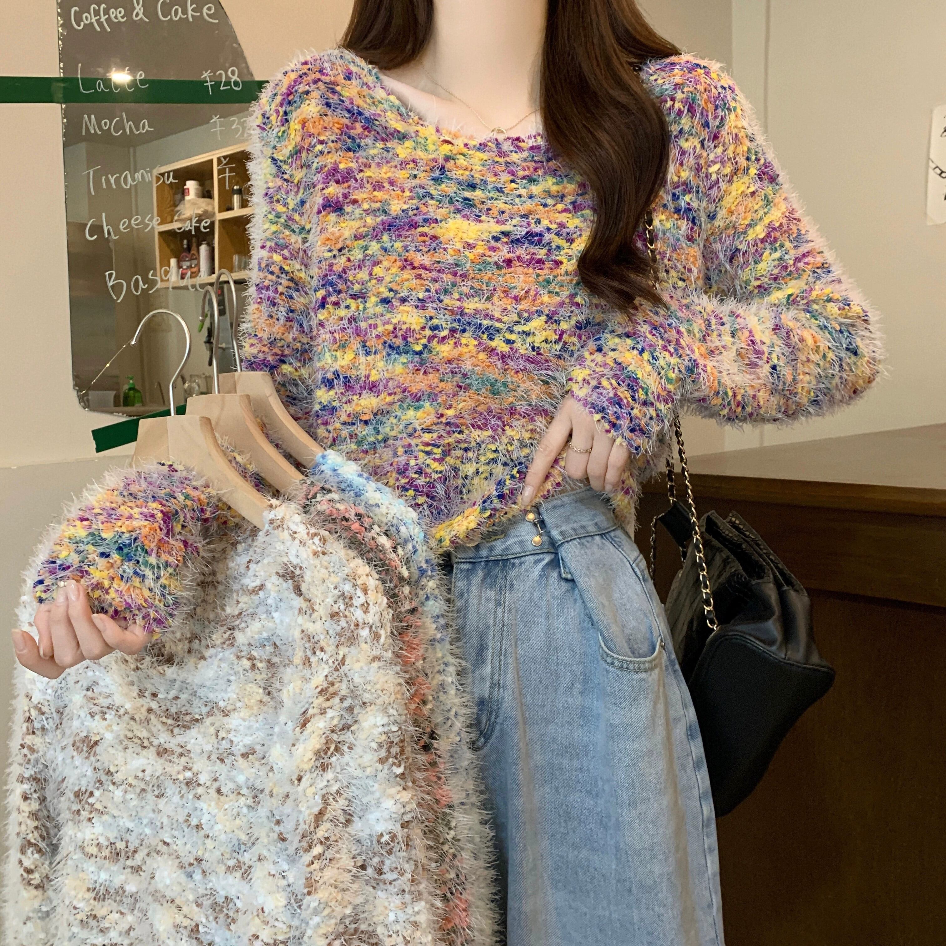 カラフルなモヘアの柔らかいワックス状のセーターの女性、秋と冬のレトロなデザイン、ゆったりとしたアウターウェア、スリムなプルオーバー長袖セーター ロング オータム 秋物 ウィンター 冬物 7460012075090255 | framboise21