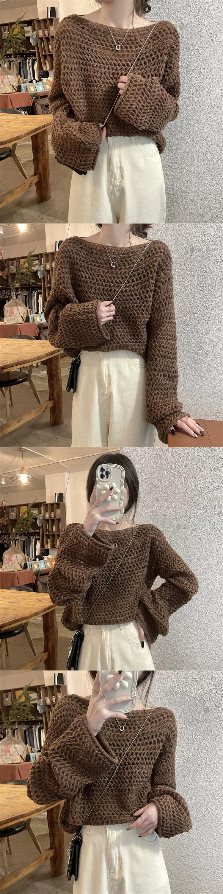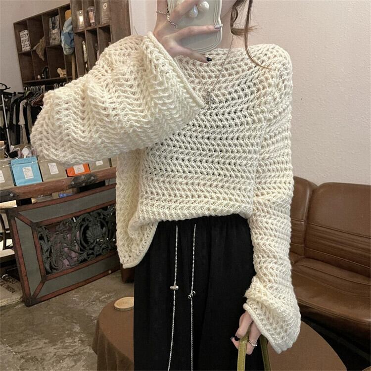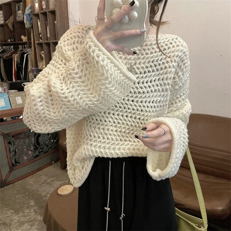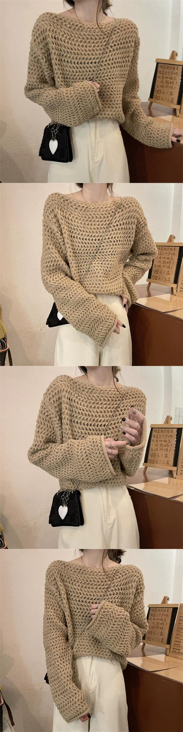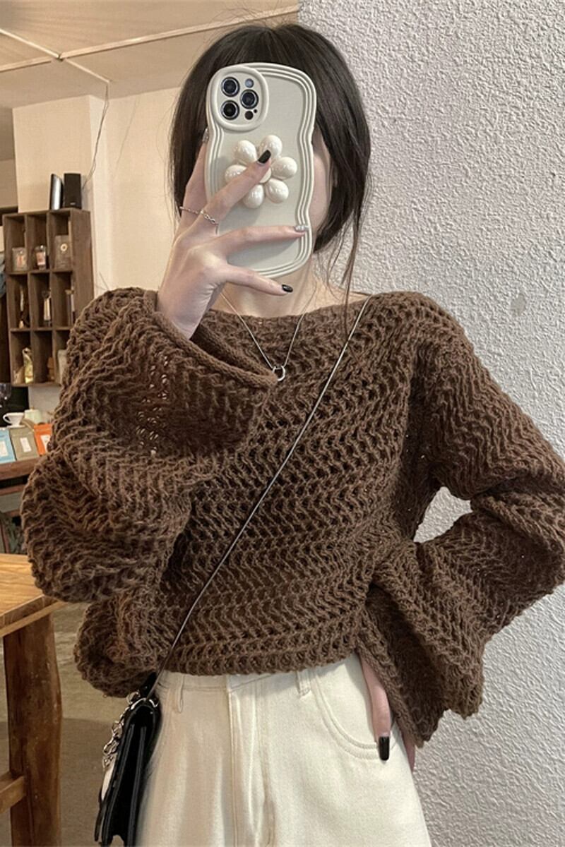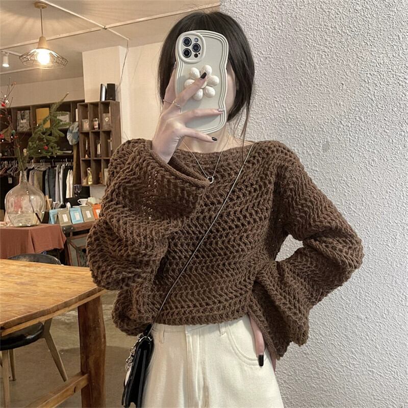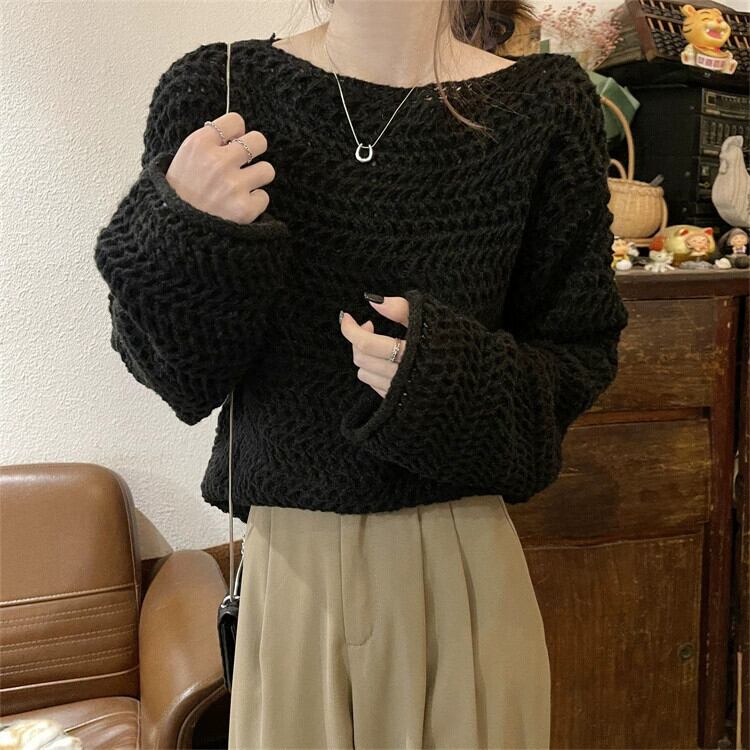 中空ニットセーター女性の秋冬 2023 新しいレトロ怠惰なスタイルルーズアウターウェアワンショルダーリッピングトップ オータム 秋物 ウィンター 冬物 7460027051952755 | framboise21