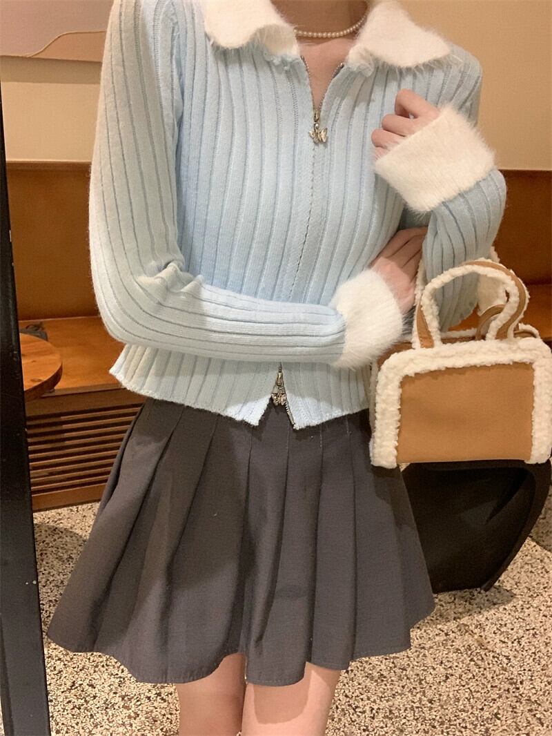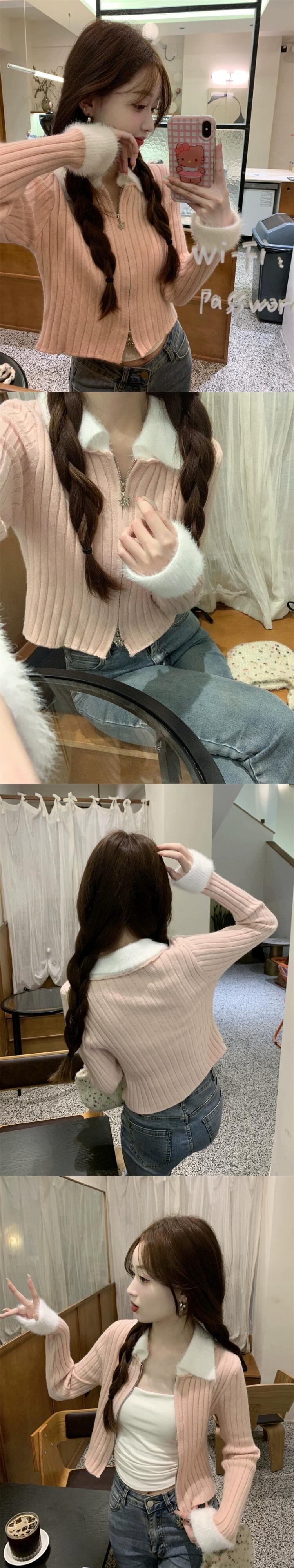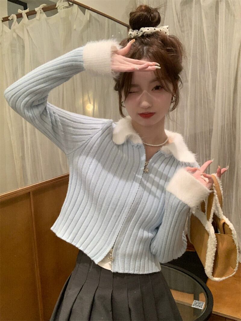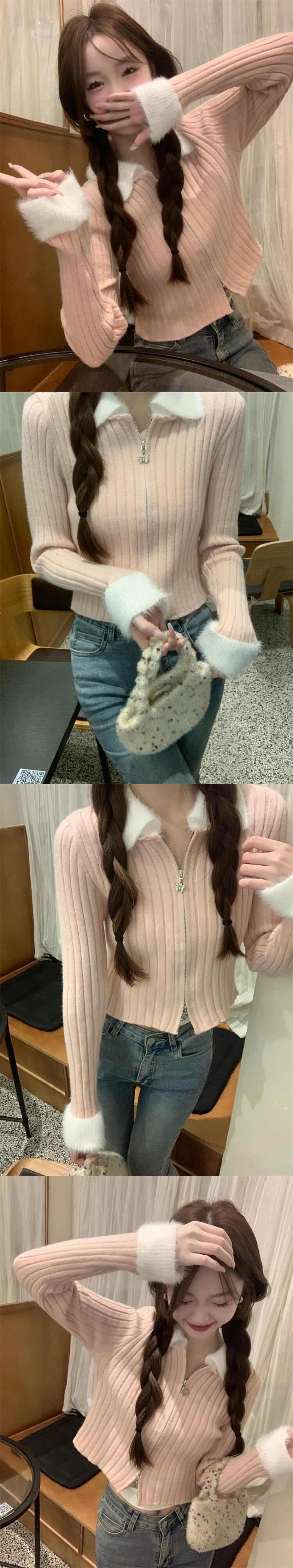 秋と冬のジッパー付きショートニットカーディガンジャケットレディース、小さなスリムフィットとスリムなアウターポロカラー長袖セーター ロング レッド オータム 秋物 ウィンター 冬物 7460084222125150 | framboise21