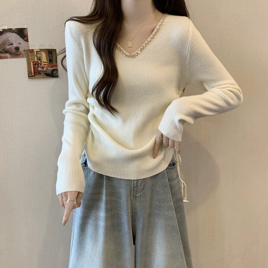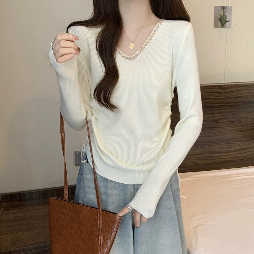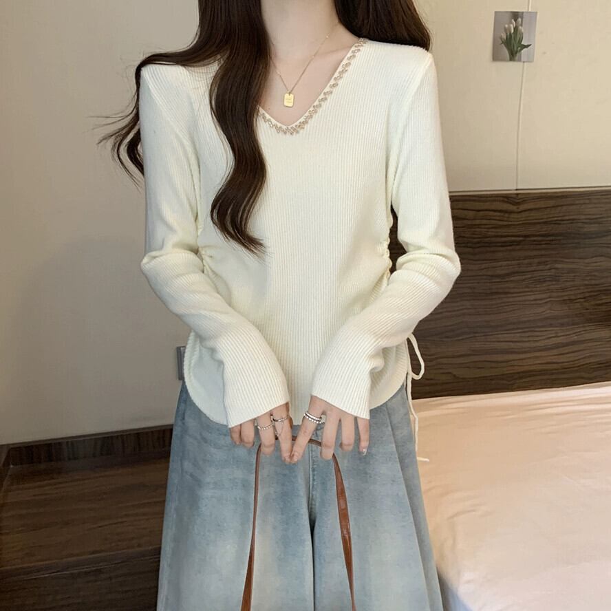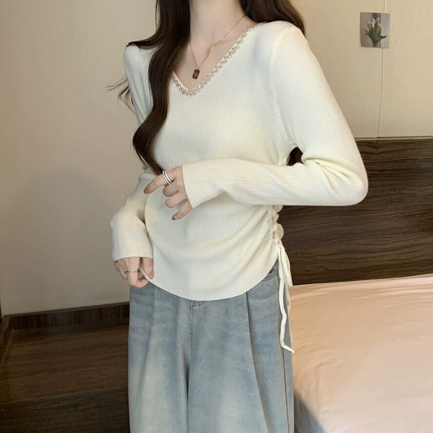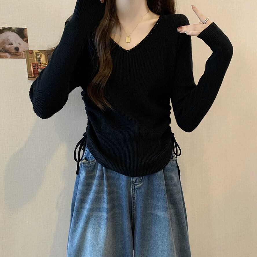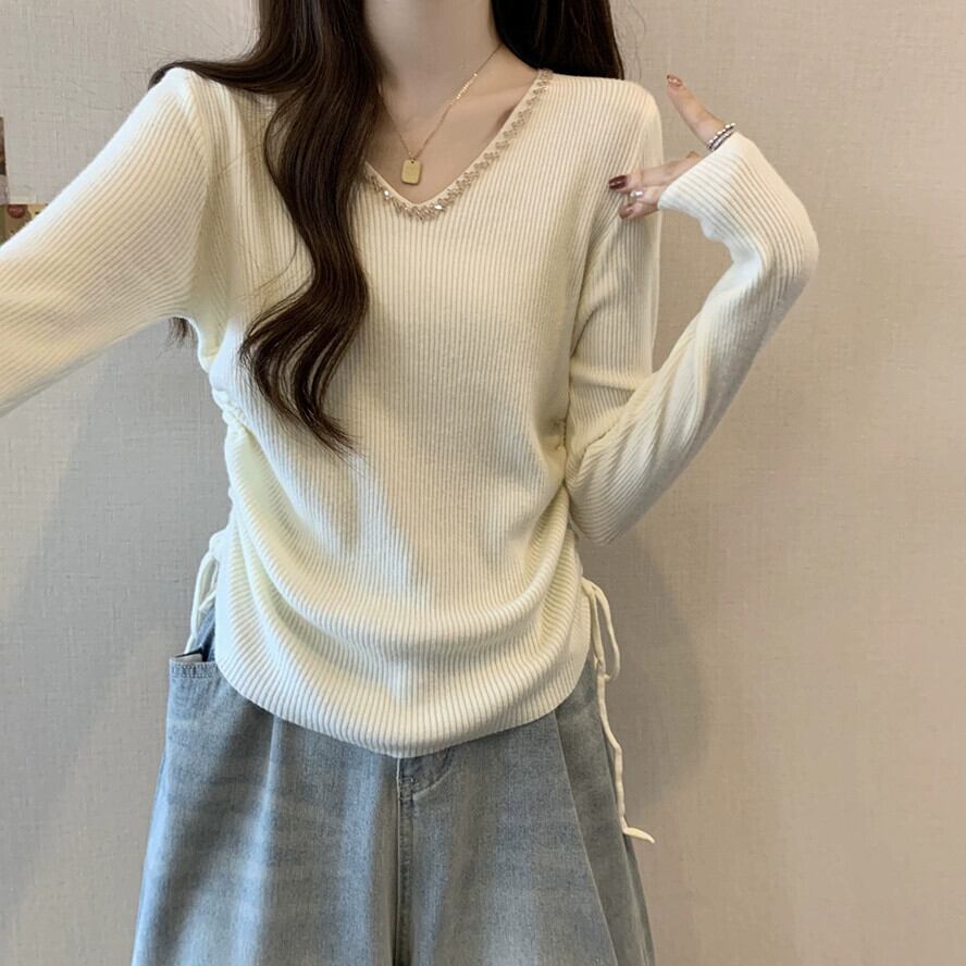 秋冬の不規則なプリーツニットボトムシャツ女性、ファッショナブルでスリム、Vネック長袖セーター付き ロング オータム 秋物 ウィンター 冬物 7460067345955730 | framboise21