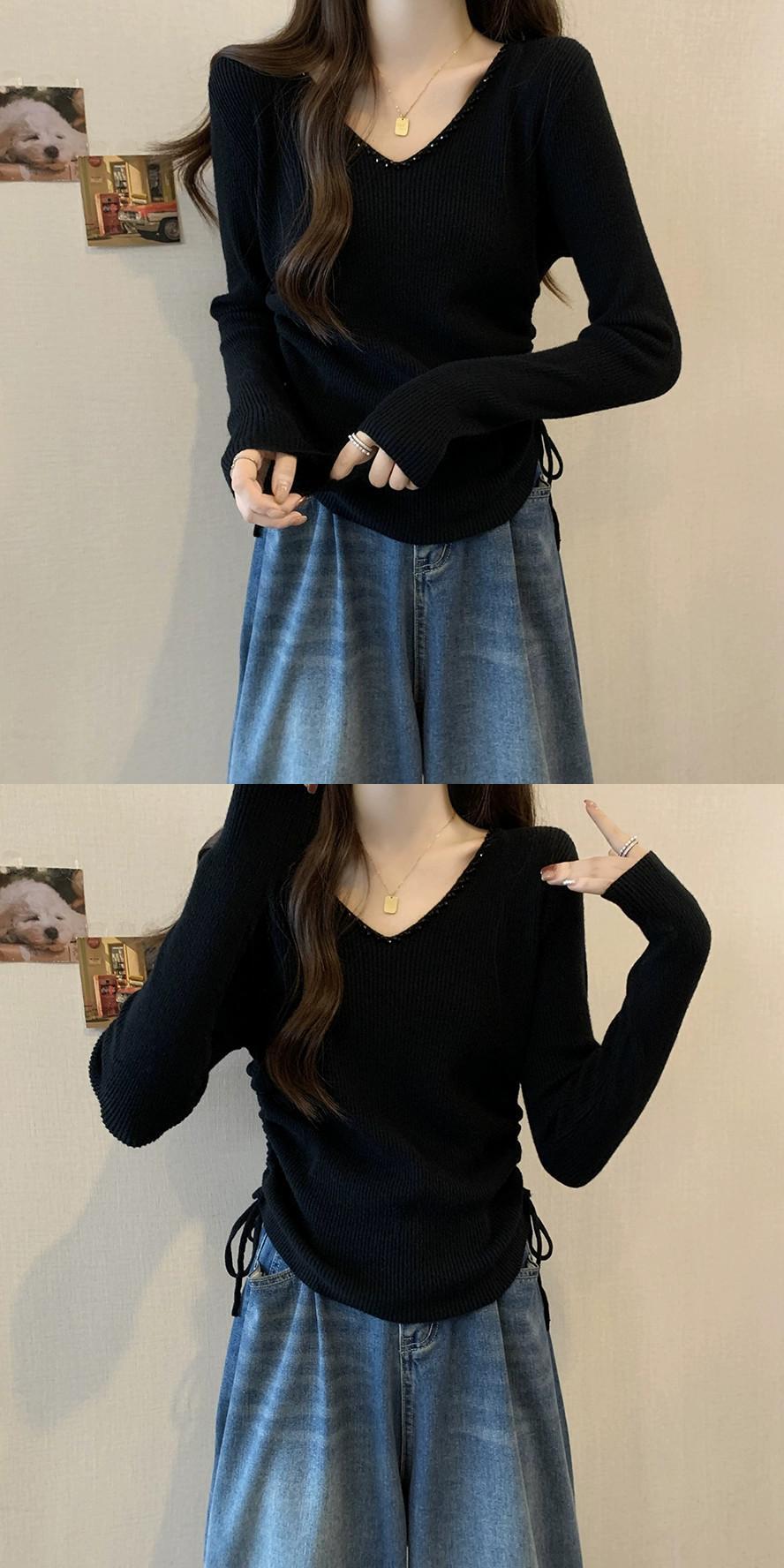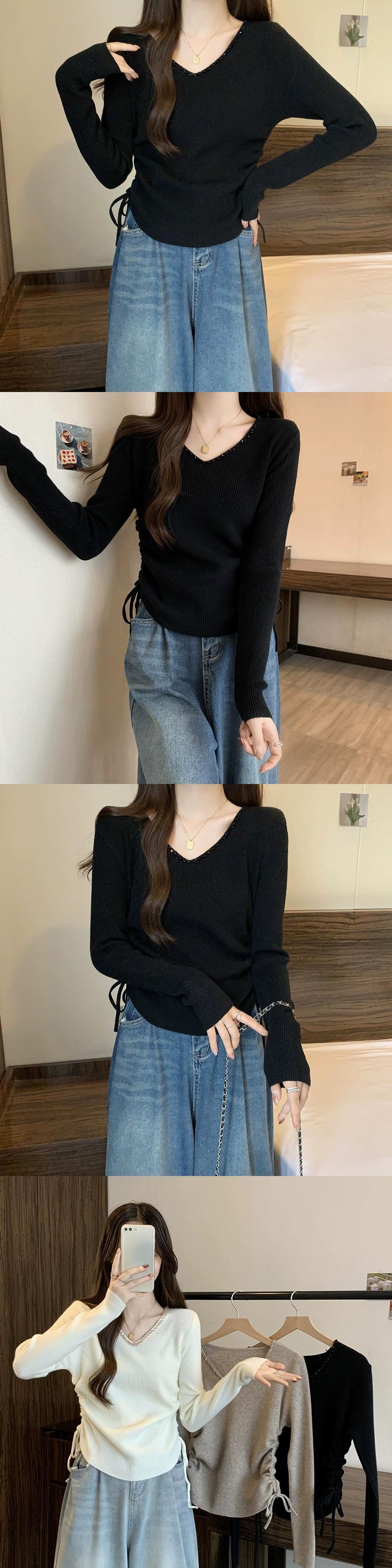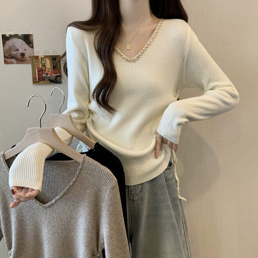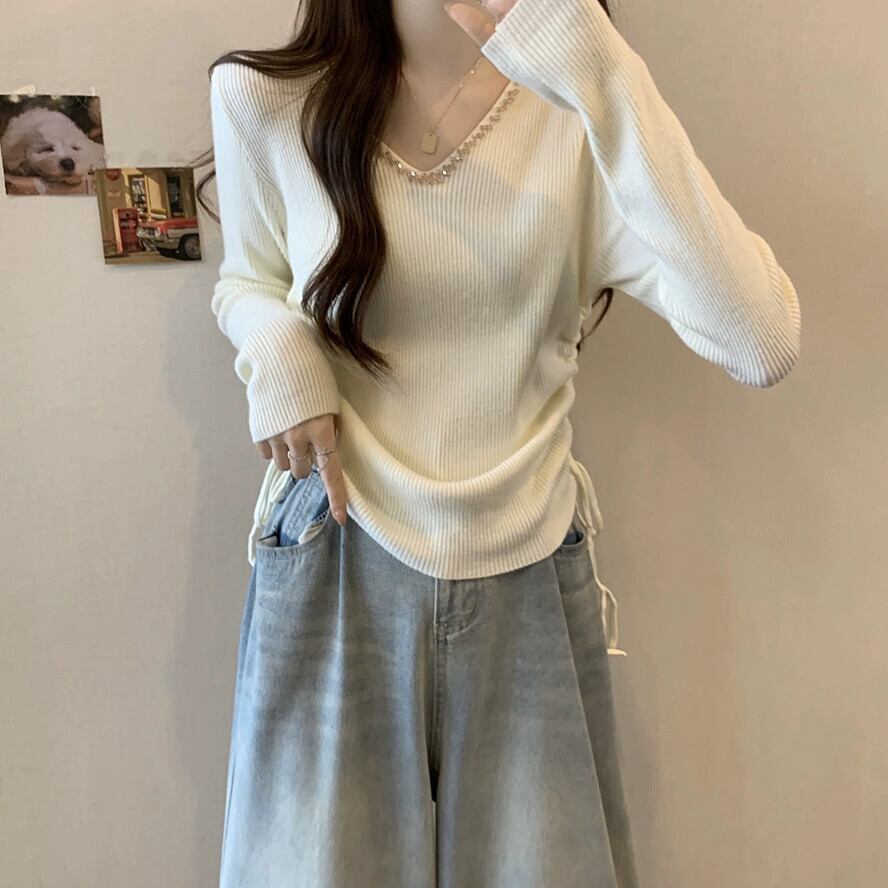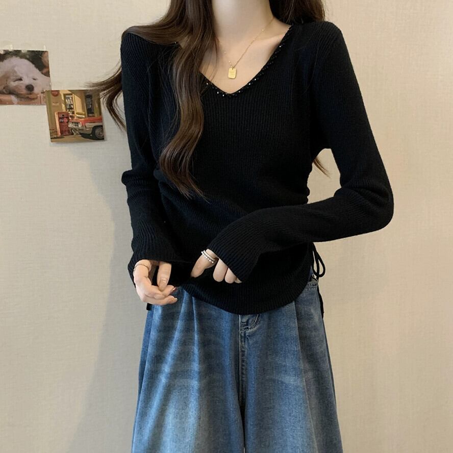 秋冬の不規則なプリーツニットボトムシャツ女性、ファッショナブルでスリム、Vネック長袖セーター付き ロング オータム 秋物 ウィンター 冬物 7460067345955730 | framboise21