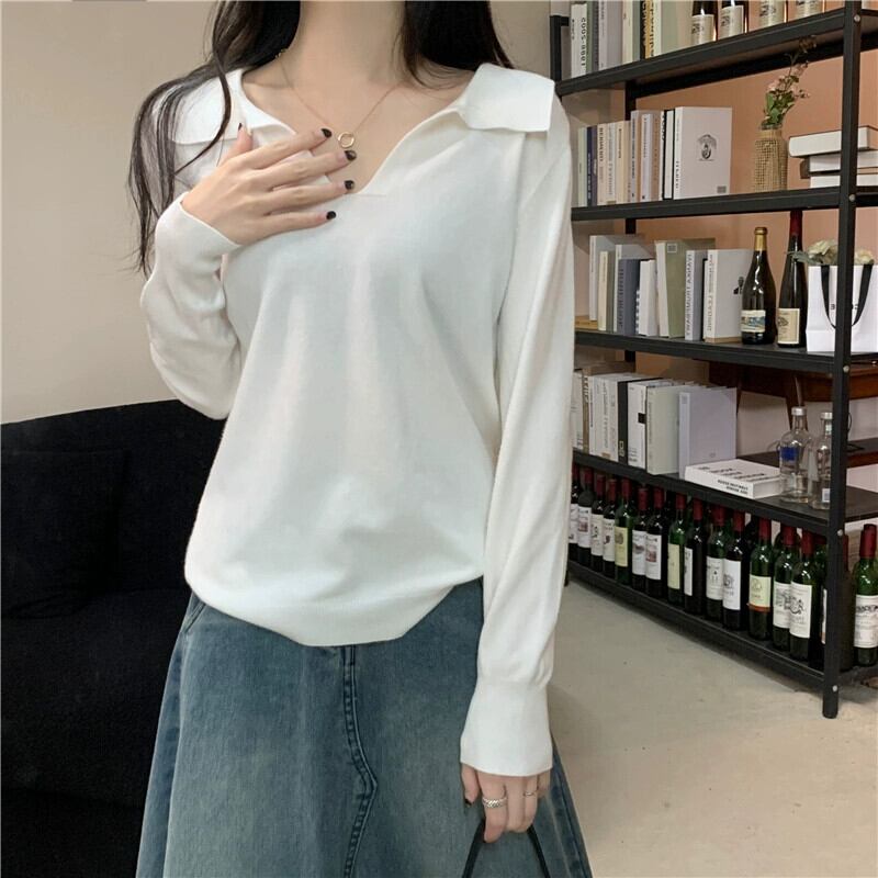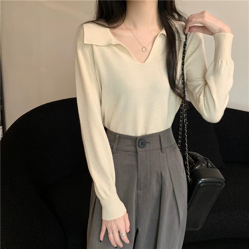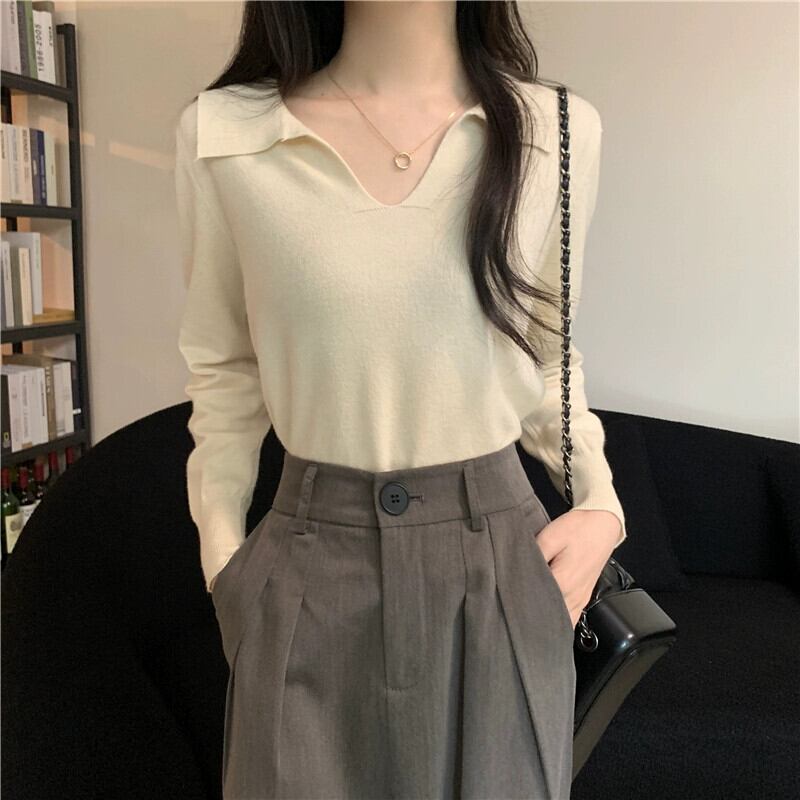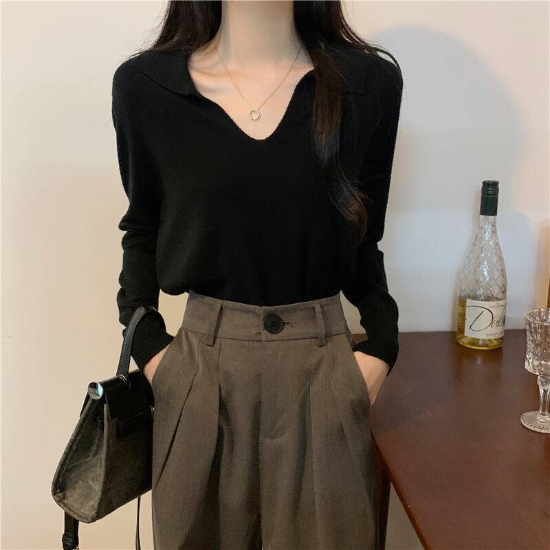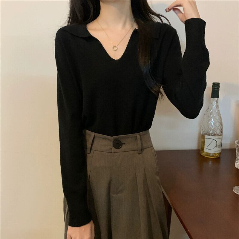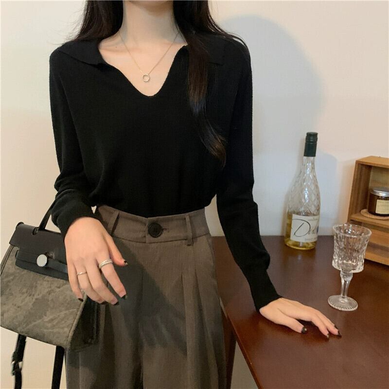 ロー V ネックニットボトムシャツ女性の秋冬 2023 新しいスタイルフレンチルーズ痩身インナーポロ襟長袖トップ ロング オータム 秋物 ウィンター 冬物 Vネック 7460010407269364 | framboise21
