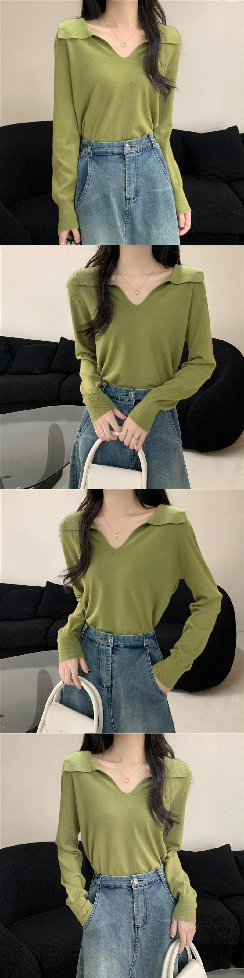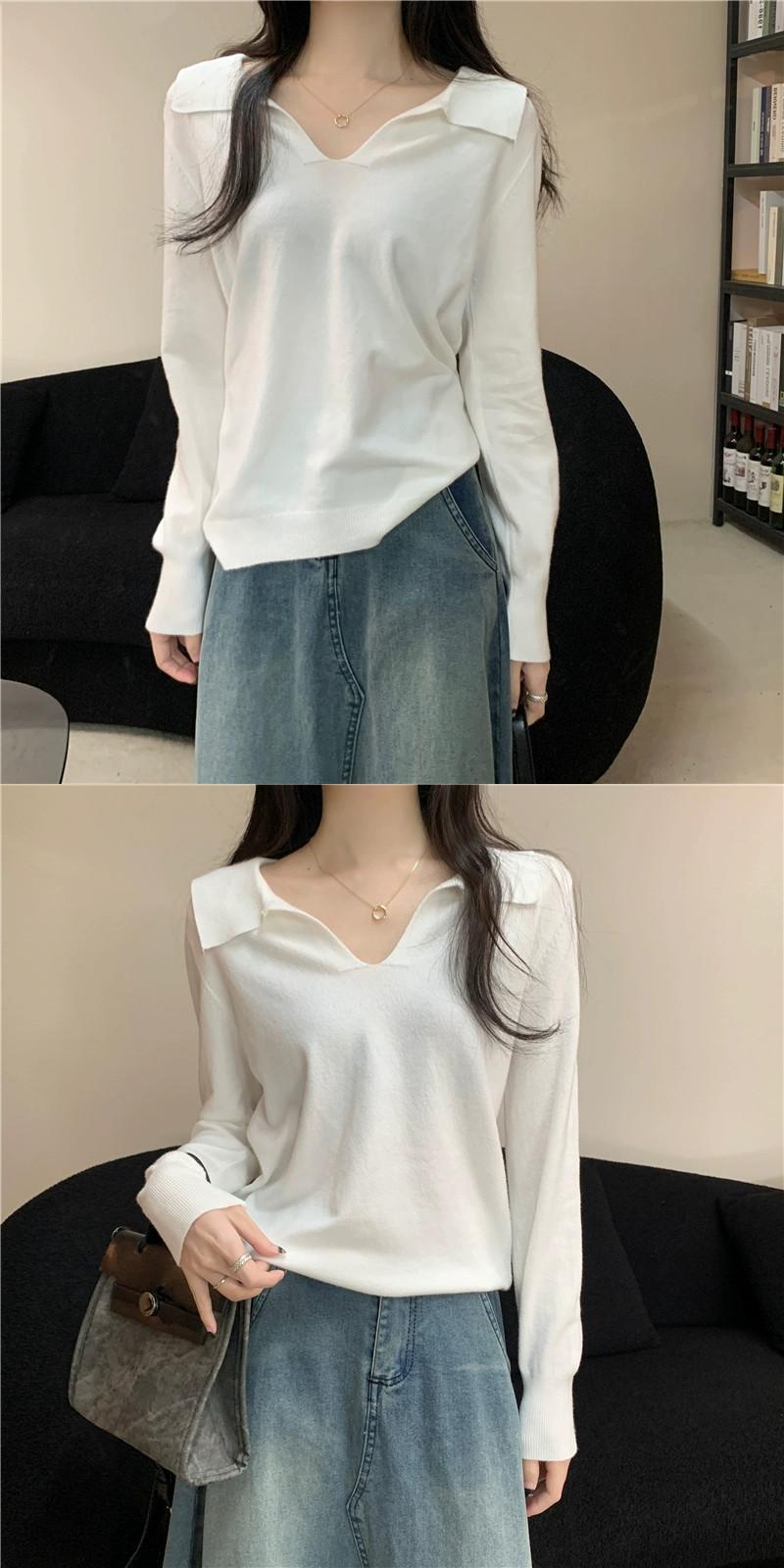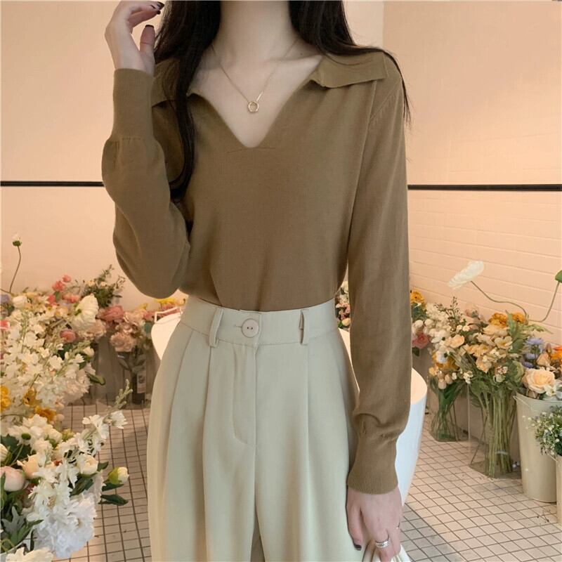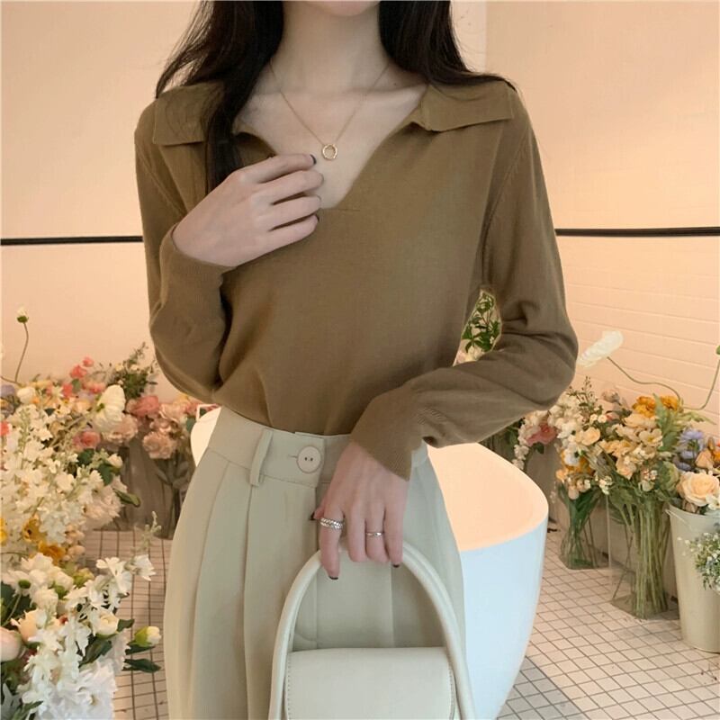 ロー V ネックニットボトムシャツ女性の秋冬 2023 新しいスタイルフレンチルーズ痩身インナーポロ襟長袖トップ ロング オータム 秋物 ウィンター 冬物 Vネック 7460010407269364 | framboise21