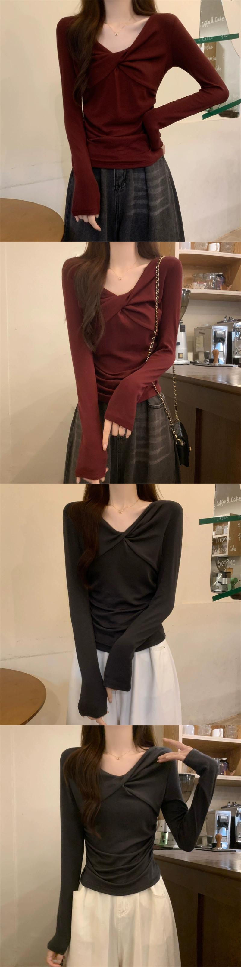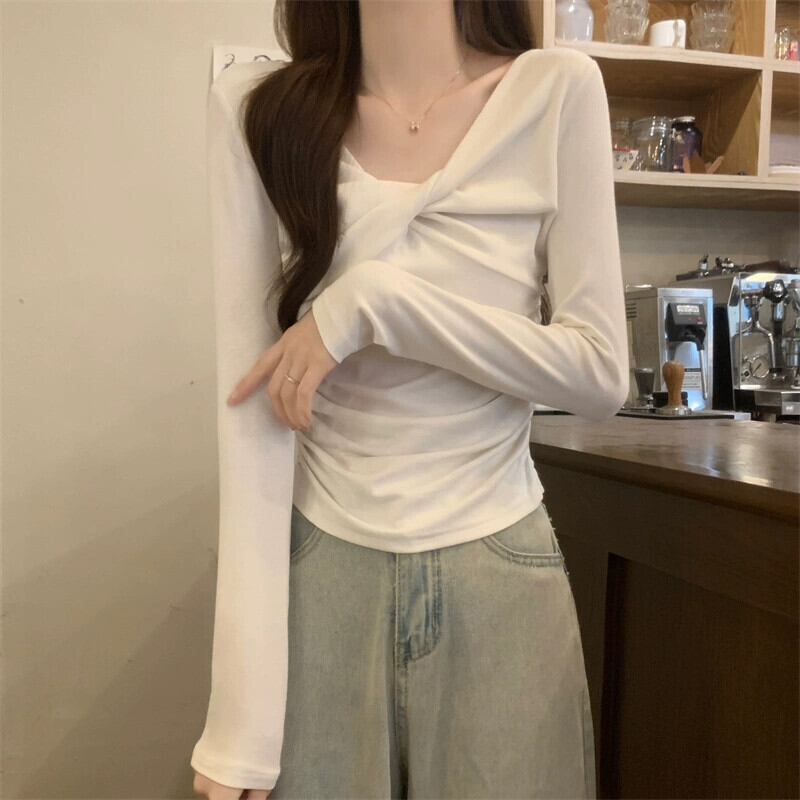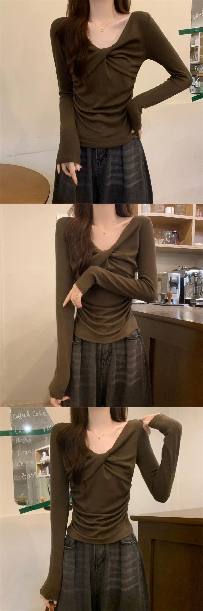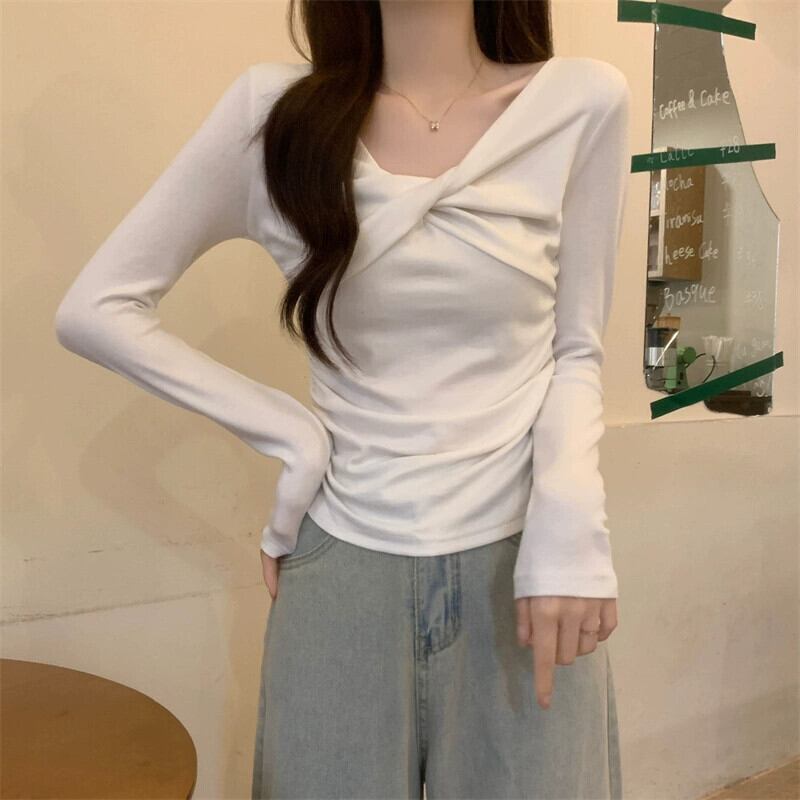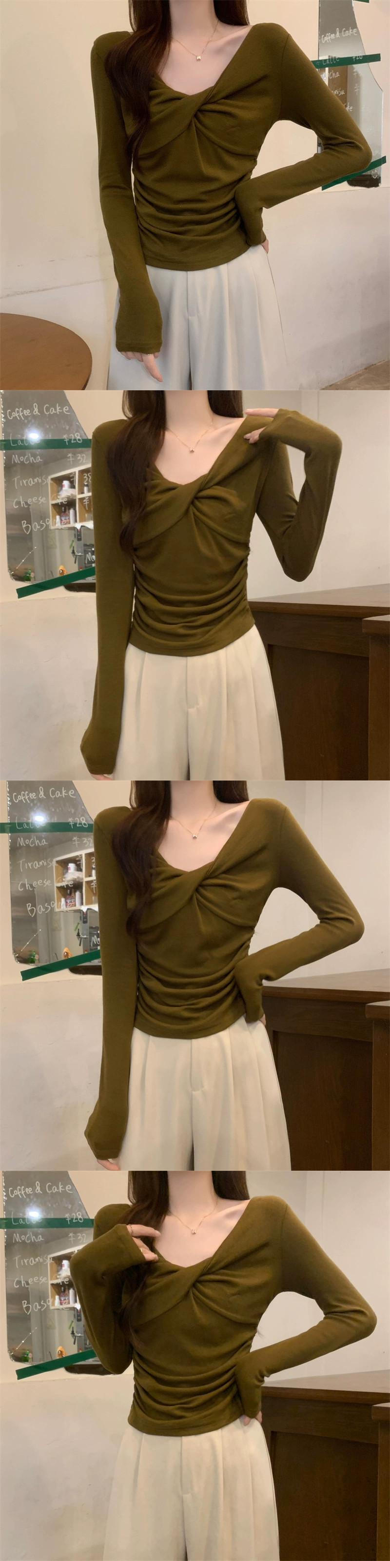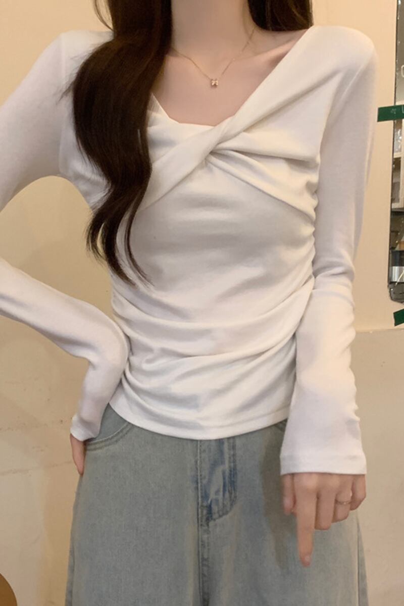 スタイリッシュでスリムフィットのインナーツイストVネックボトムTシャツを備えた秋冬の不規則プリーツショート長袖トップ女性 ロング オータム 秋物 ウィンター 冬物 746006958279647 | framboise21