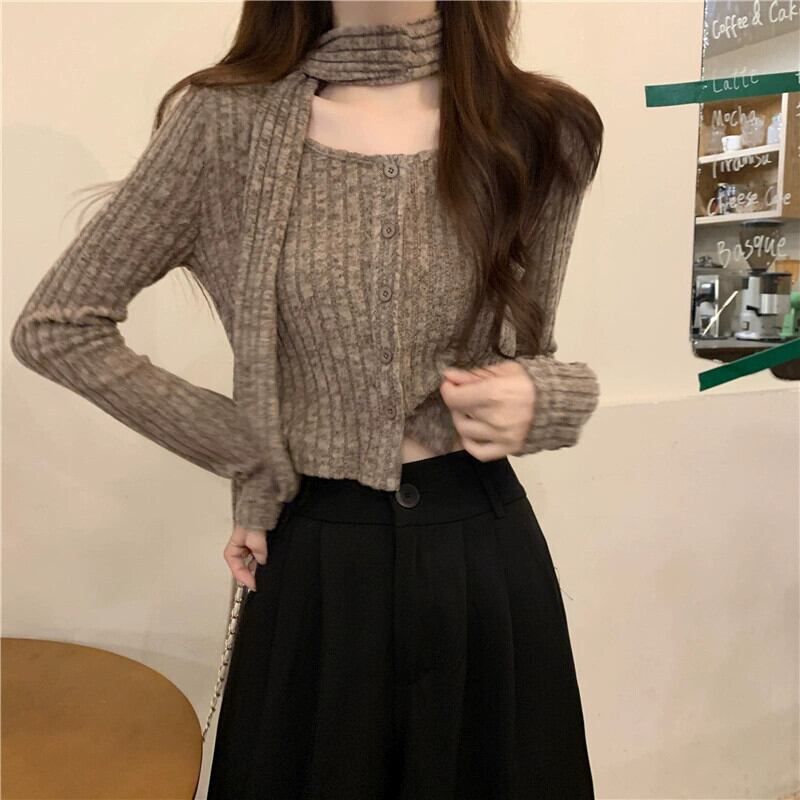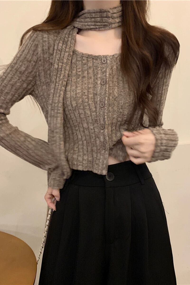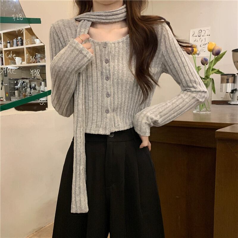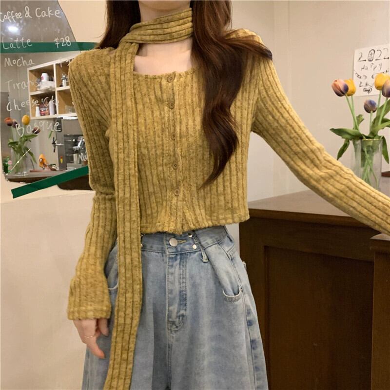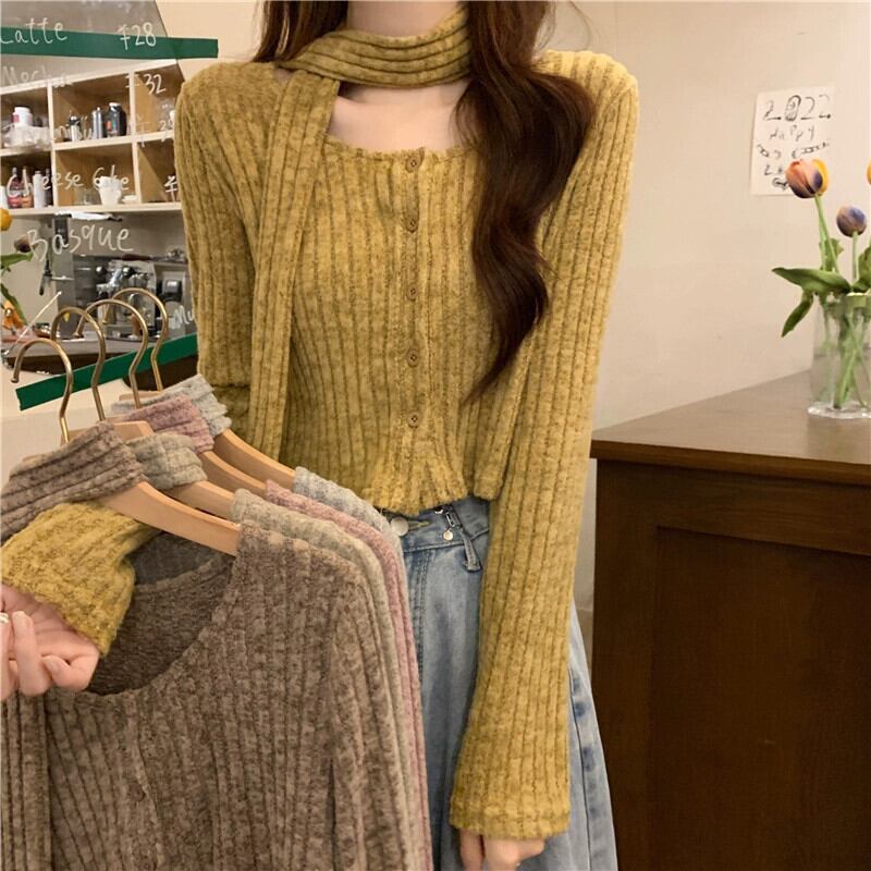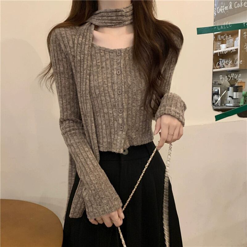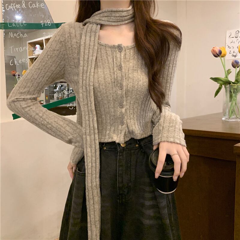 スカーフショートニットカーディガンジャケット女性の秋と冬のフレンチスタイルの小さなスリムスリムアウターウェア長袖スクエアネックセーター ロング オータム 秋物 ウィンター 冬物 スクウェア 7460046806401320 | framboise21