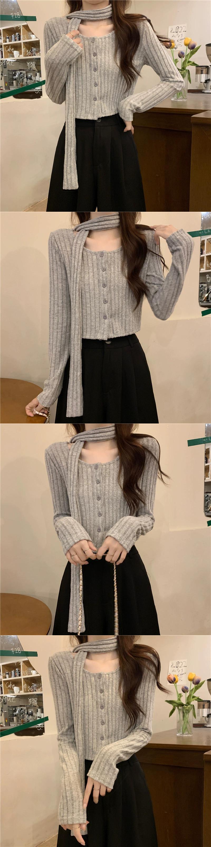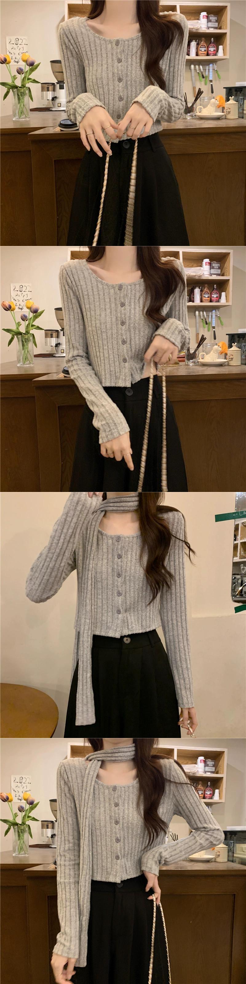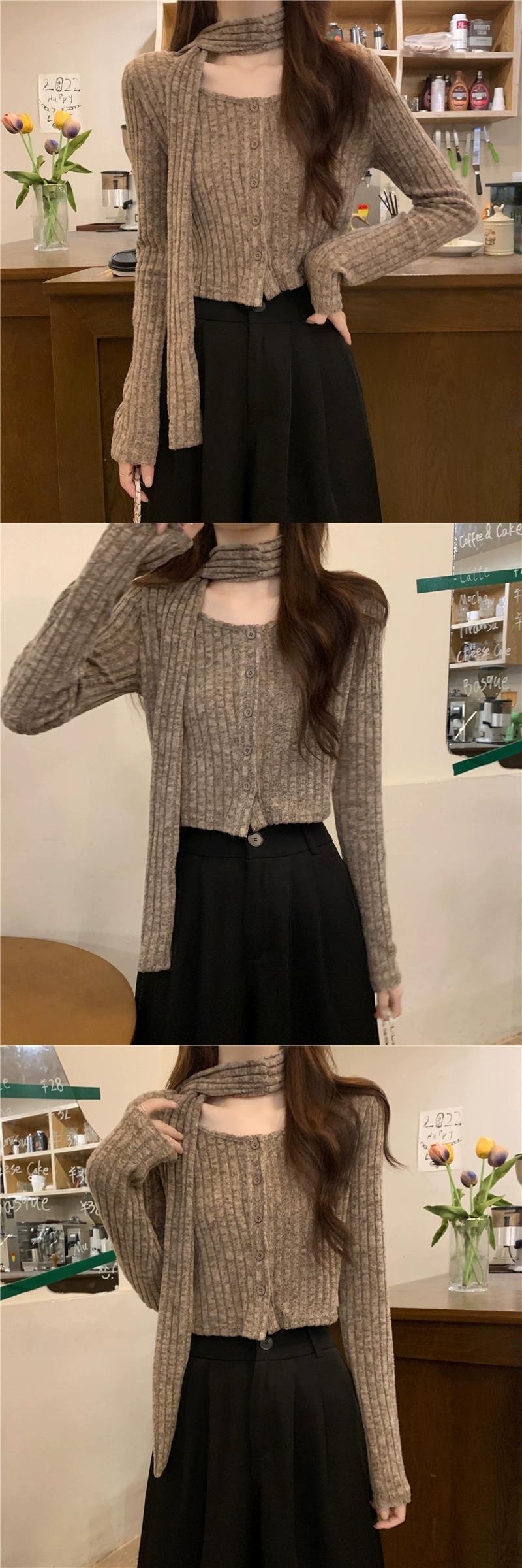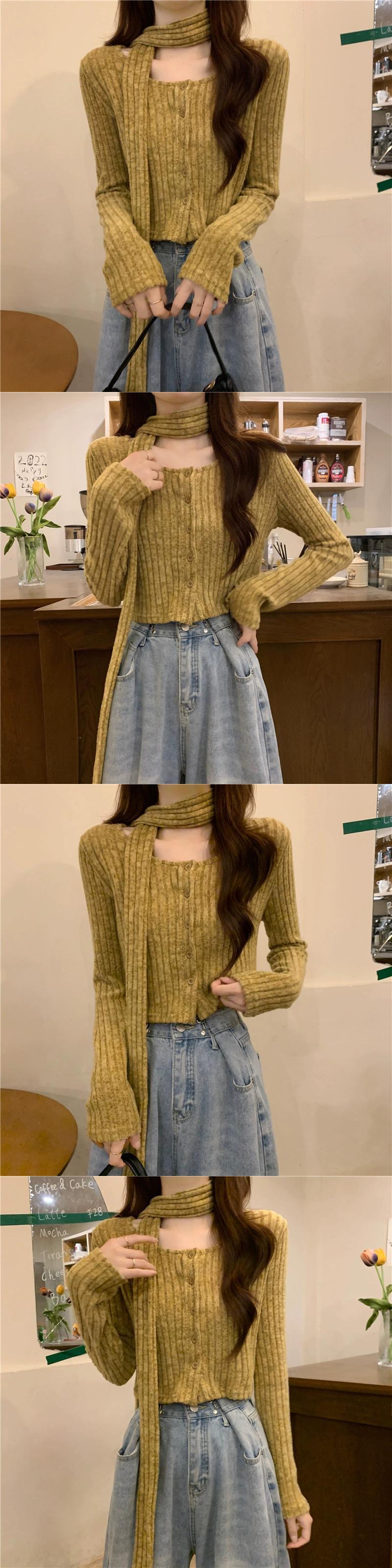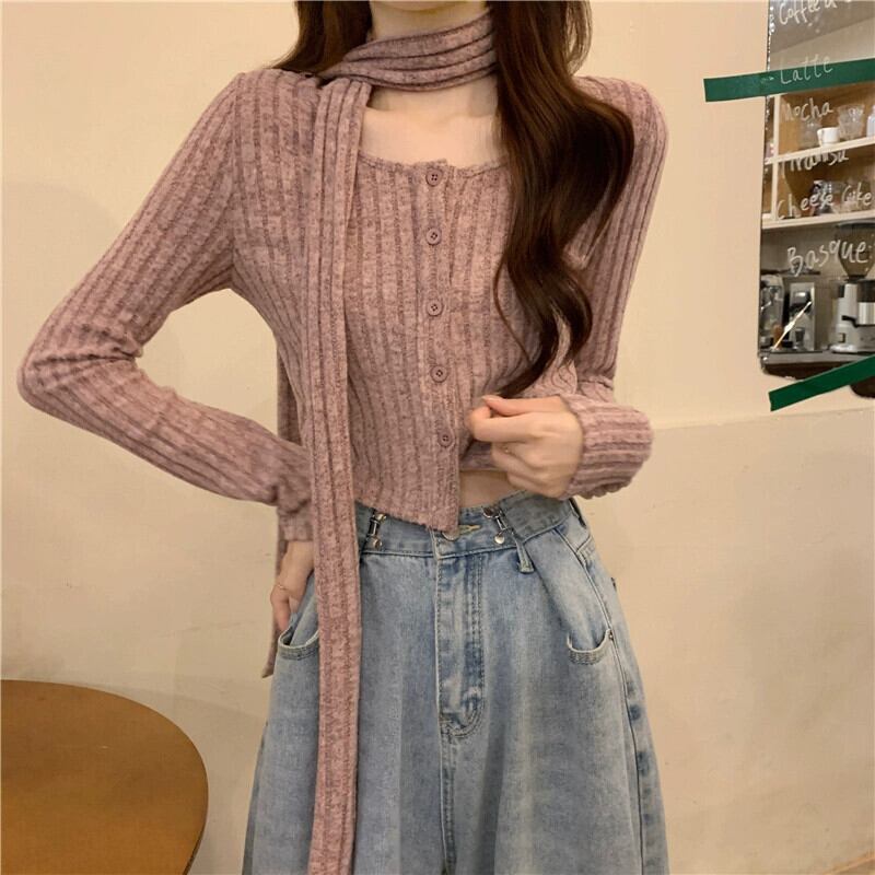 スカーフショートニットカーディガンジャケット女性の秋と冬のフレンチスタイルの小さなスリムスリムアウターウェア長袖スクエアネックセーター ロング オータム 秋物 ウィンター 冬物 スクウェア 7460046806401320 | framboise21