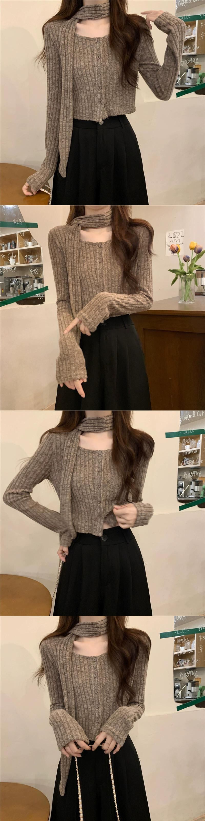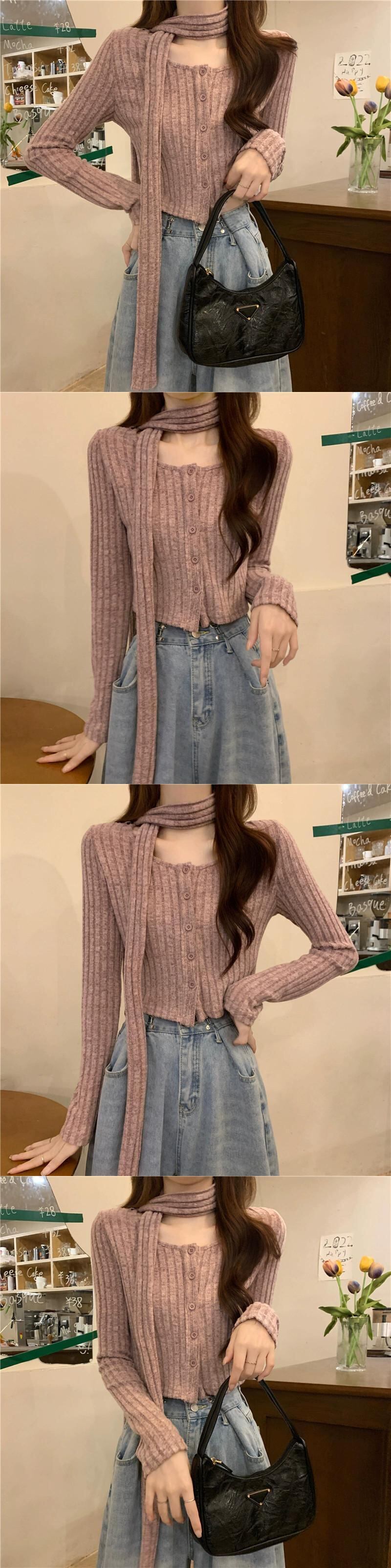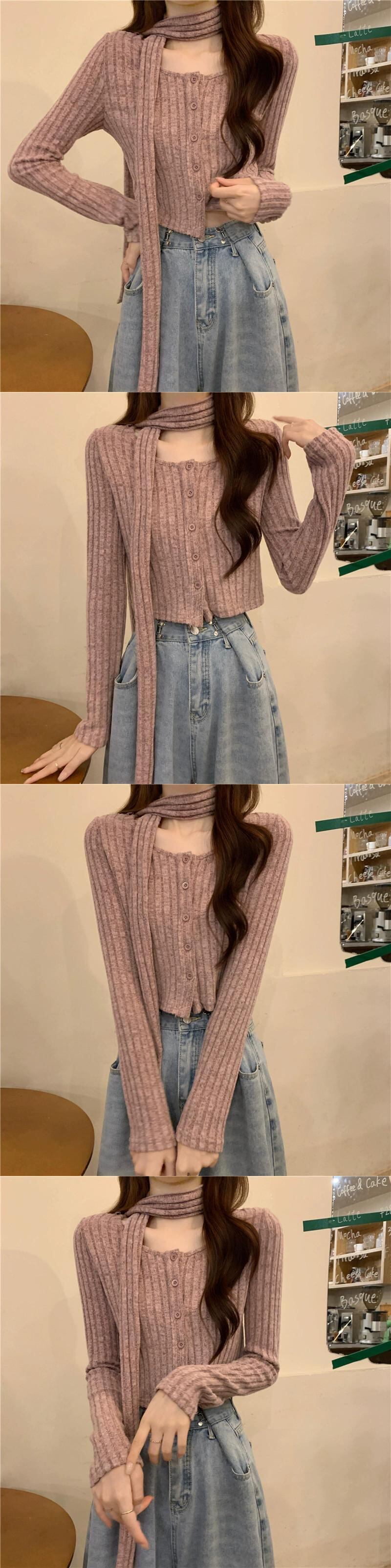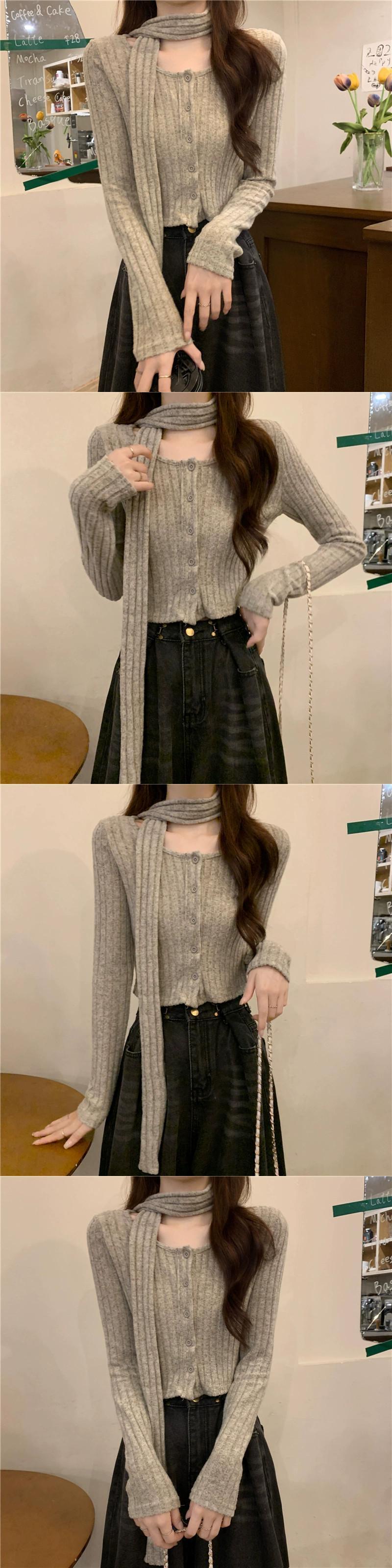 スカーフショートニットカーディガンジャケット女性の秋と冬のフレンチスタイルの小さなスリムスリムアウターウェア長袖スクエアネックセーター ロング オータム 秋物 ウィンター 冬物 スクウェア 7460046806401320 | framboise21