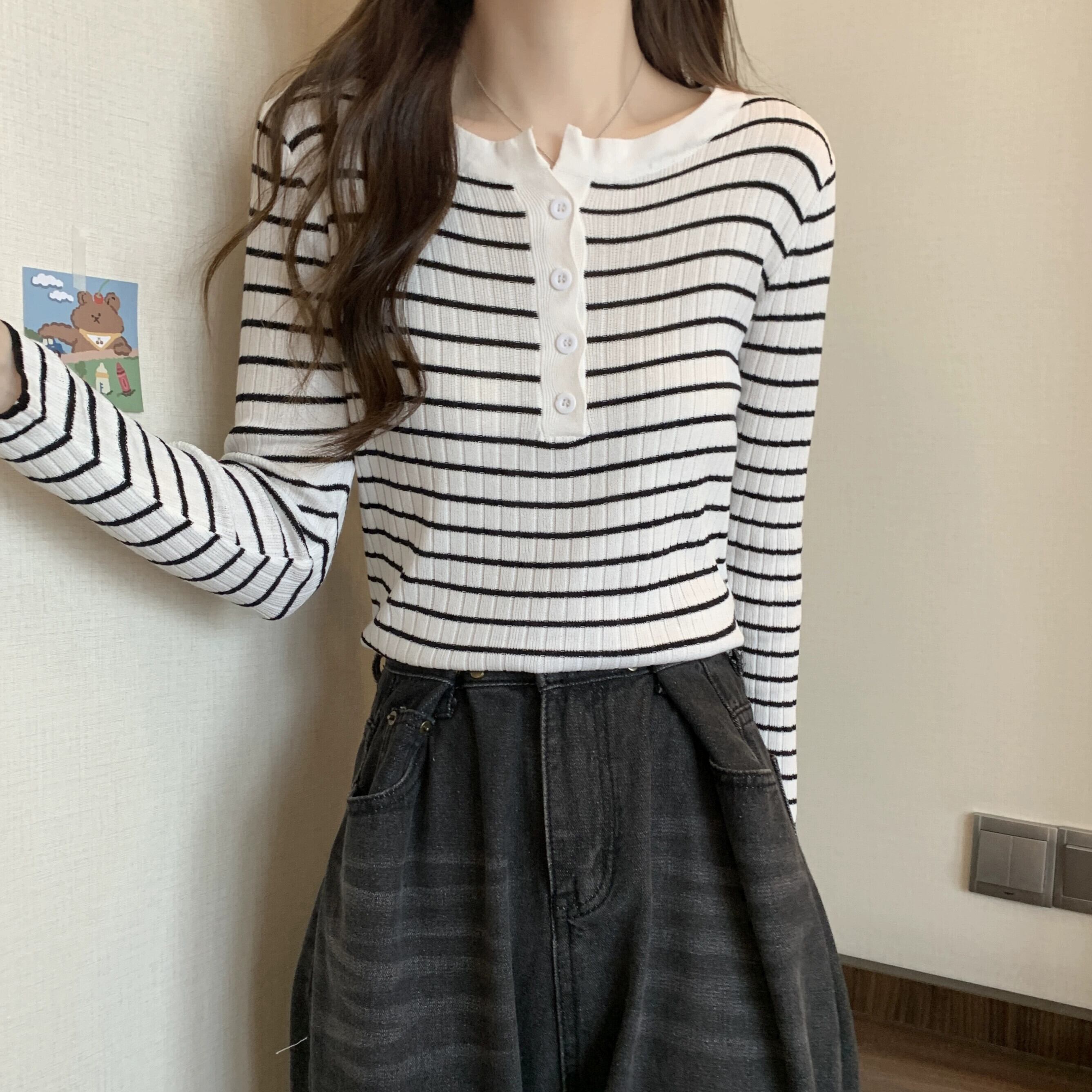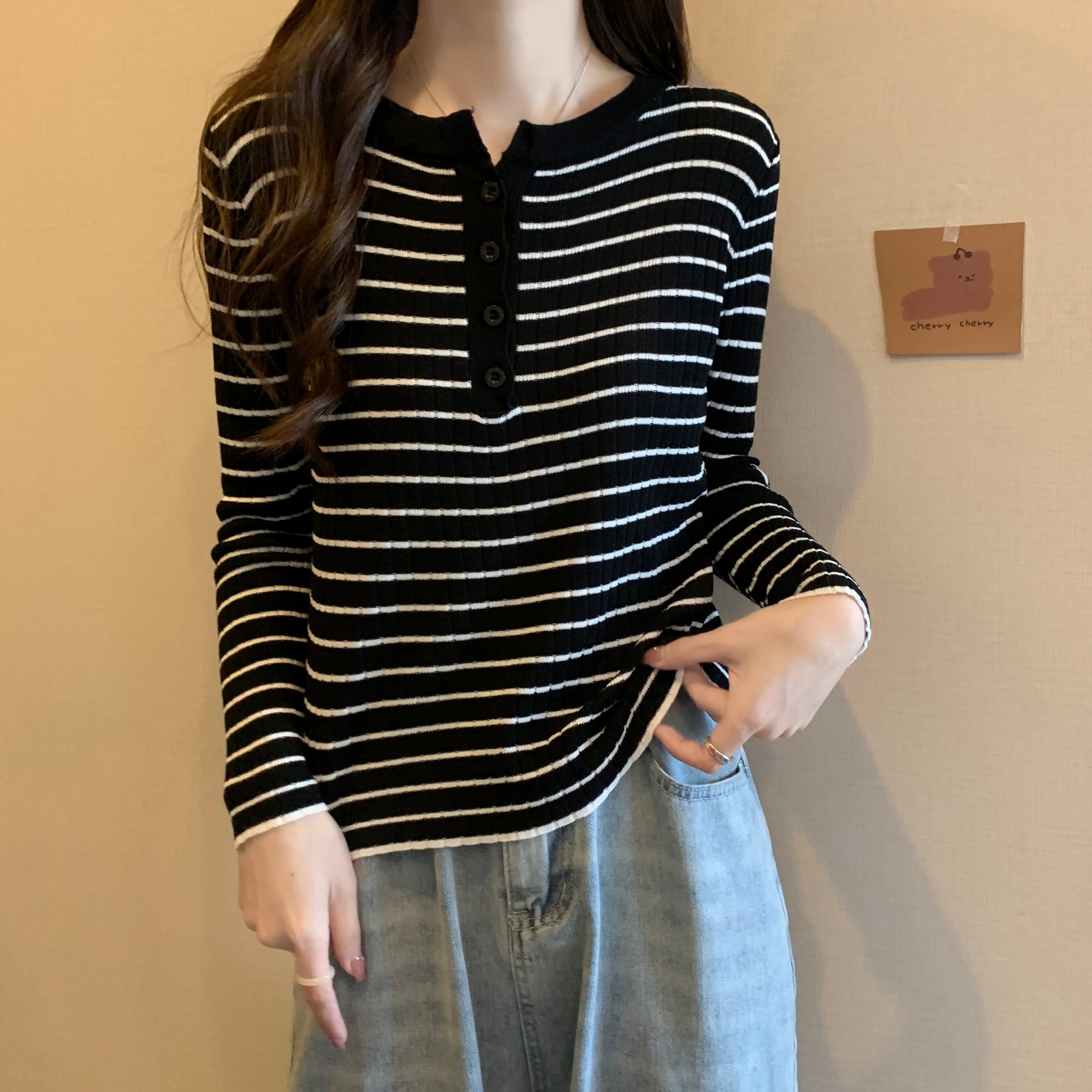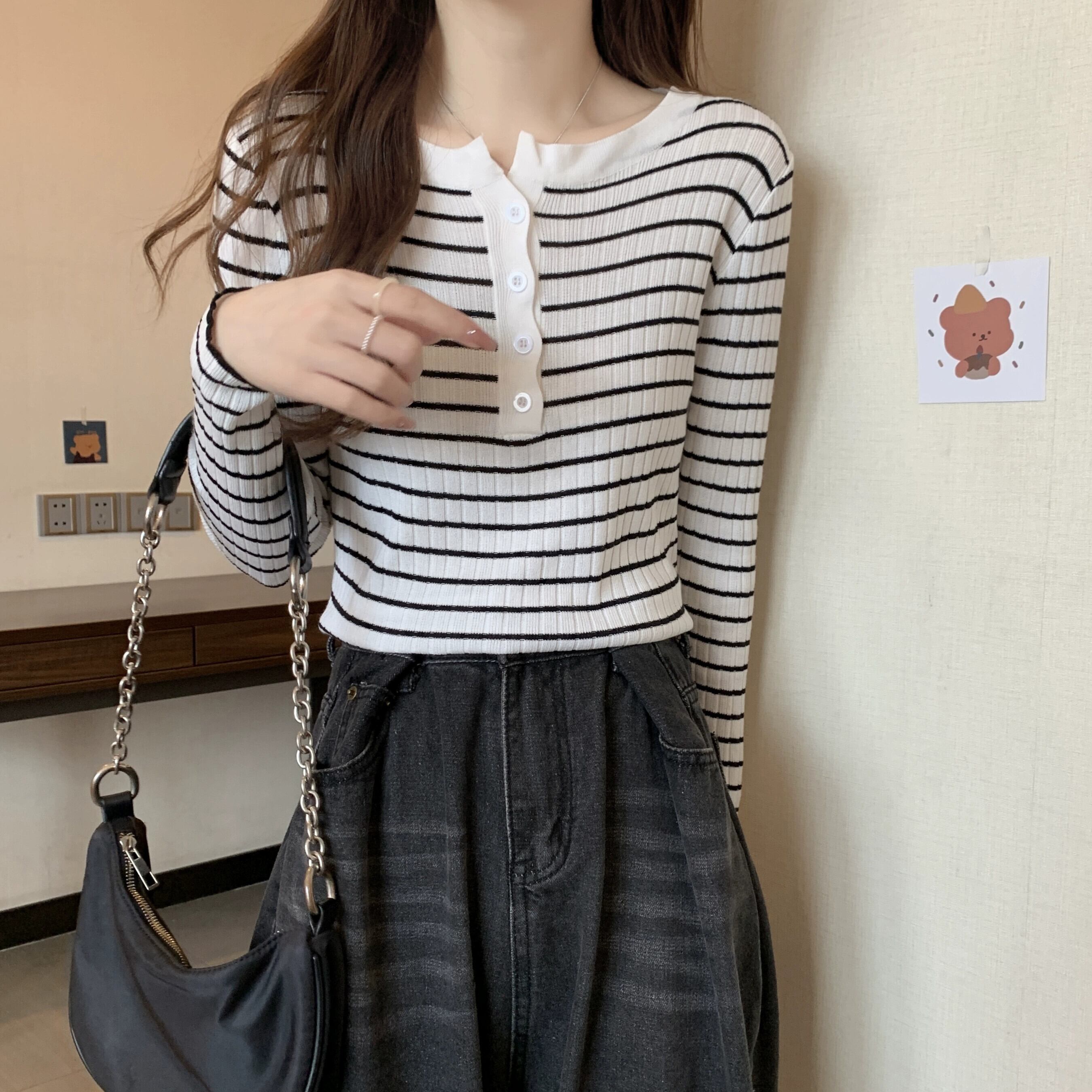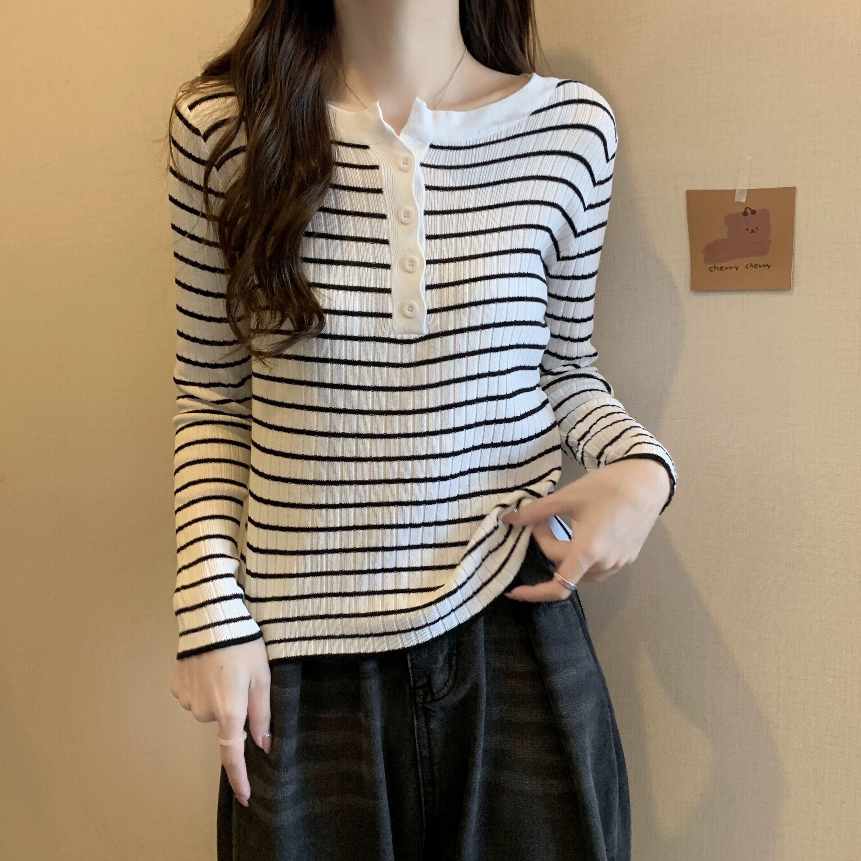 黒と白のストライプのボトムシャツ女性 2023 秋と冬の新しいスタイルのファッショナブルでルーズな痩身インナー長袖セーター ロング ホワイト ブラック オータム 秋物 ウィンター 冬物 7460040567718617 | framboise21