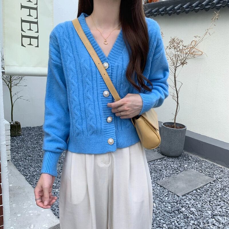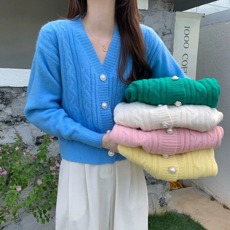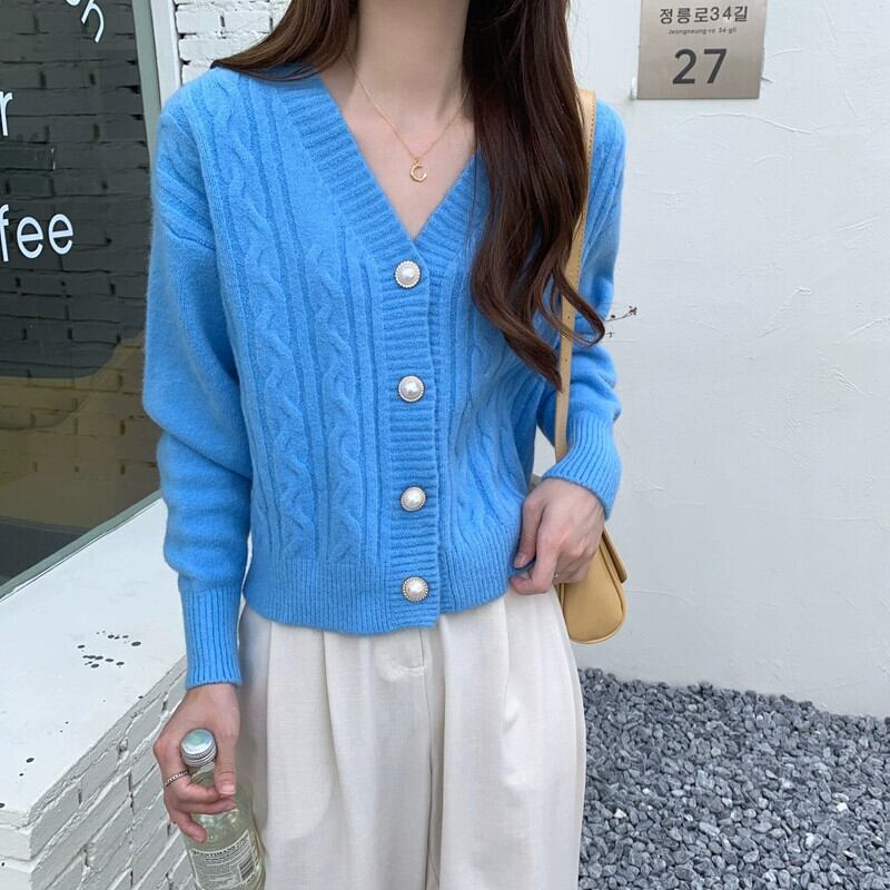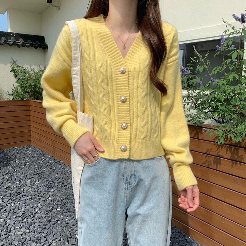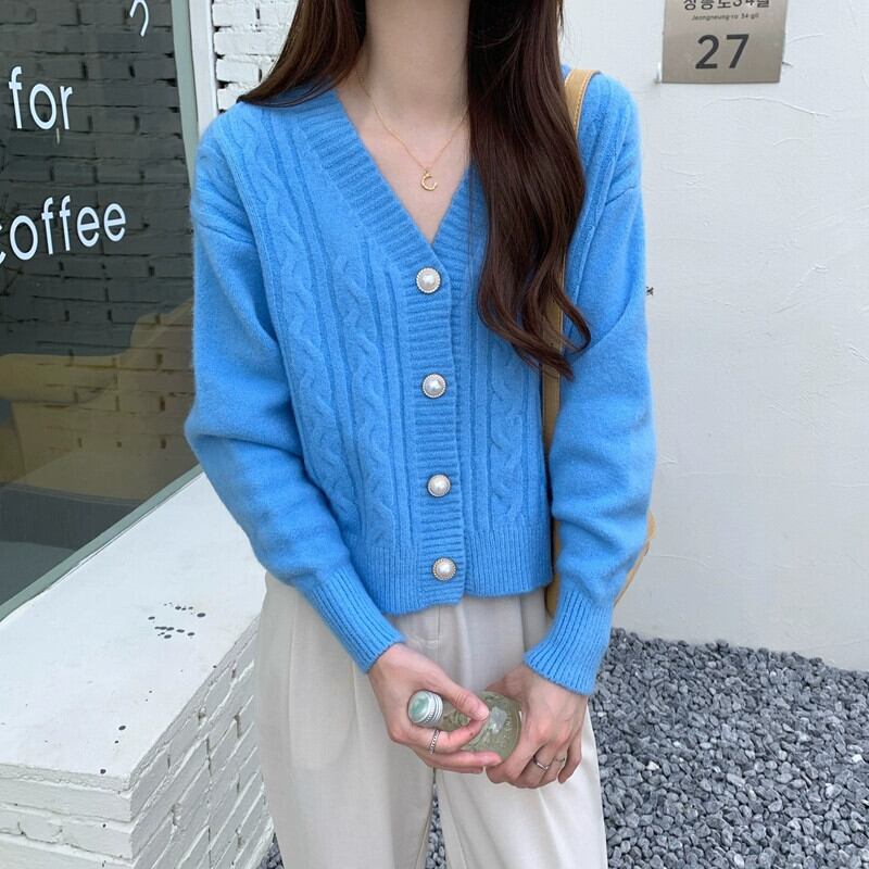 ピンクツイストカーディガンセータージャケット女性秋と冬2023新しいルーズアウターウェア肥厚ショートvネックセーター オータム 秋物 ウィンター 冬物 7460079404807097 | framboise21