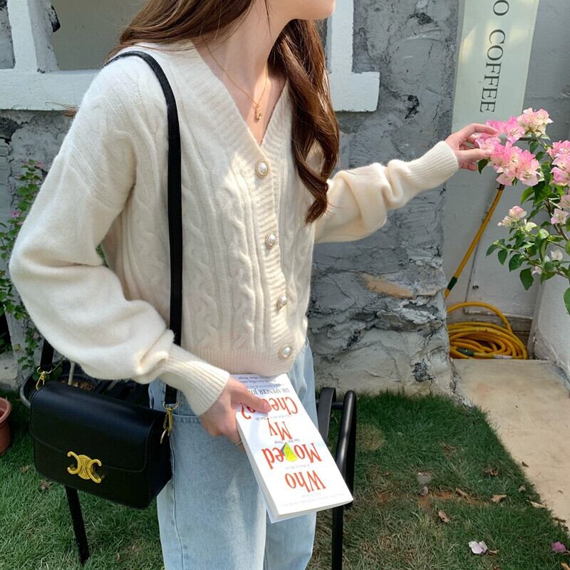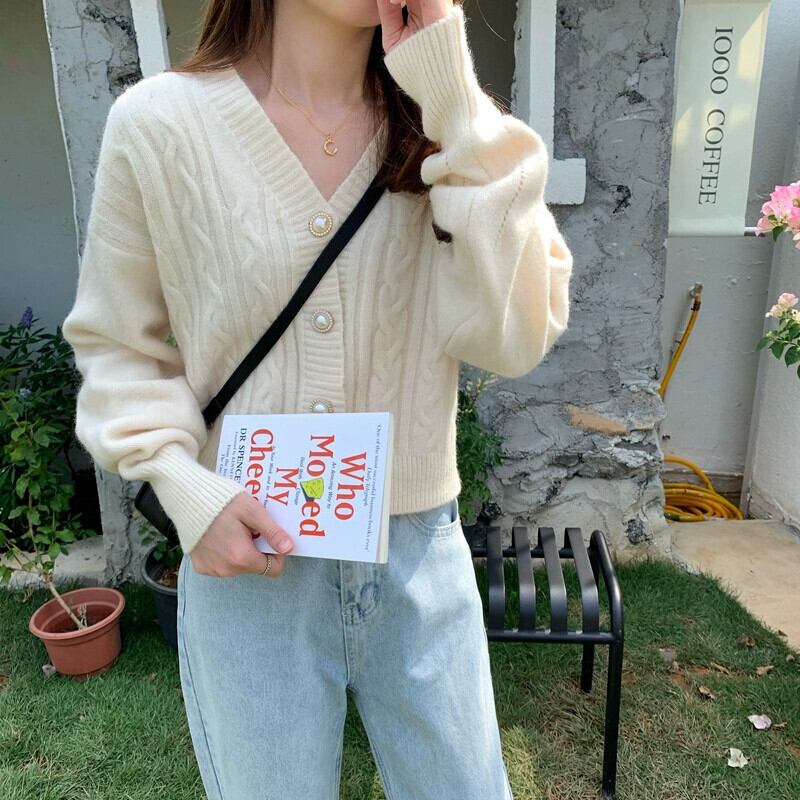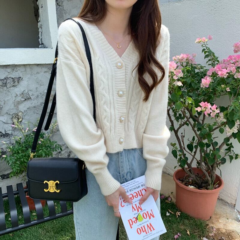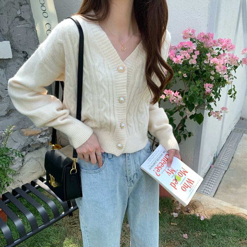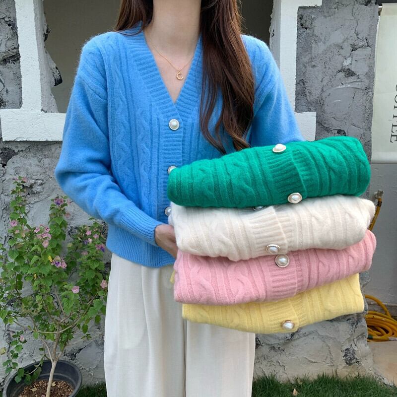 ピンクツイストカーディガンセータージャケット女性秋と冬2023新しいルーズアウターウェア肥厚ショートvネックセーター オータム 秋物 ウィンター 冬物 7460079404807097 | framboise21