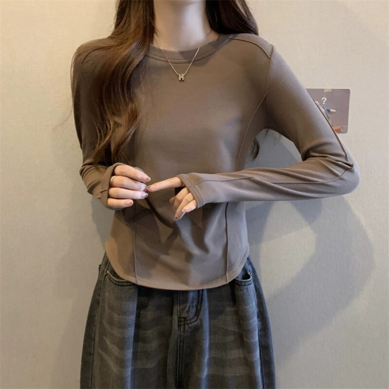秋と冬の茶色の厚い起毛底シャツの女性、スリムで不規則な長袖Tシャツ、内側に短いトップが付いています ショート ロング オータム 秋物 ウィンター 冬物 7460089710394027