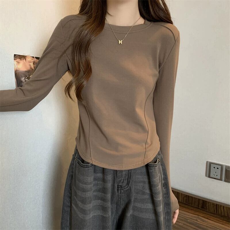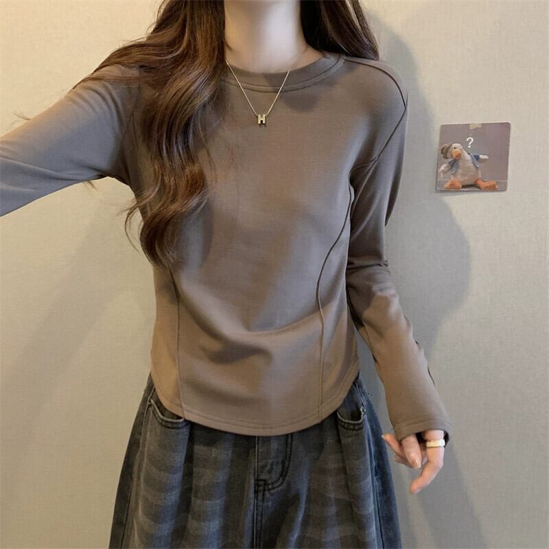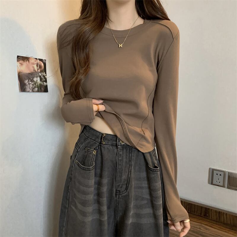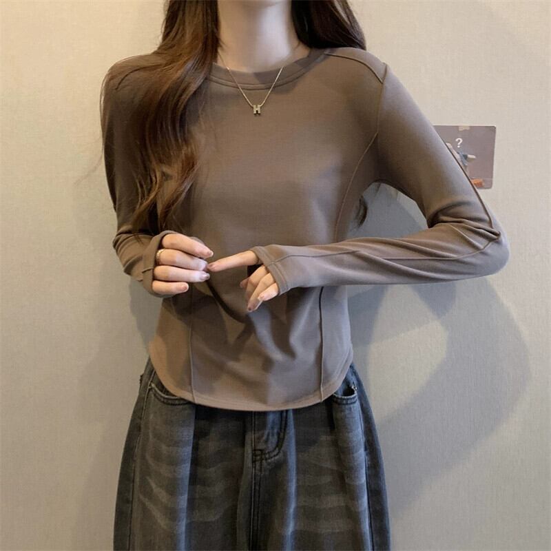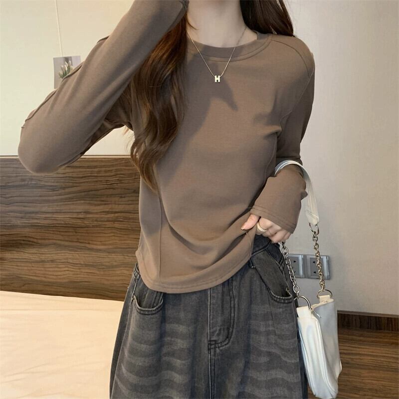 秋と冬の茶色の厚い起毛底シャツの女性、スリムで不規則な長袖Tシャツ、内側に短いトップが付いています ショート ロング オータム 秋物 ウィンター 冬物 7460089710394027 | framboise21