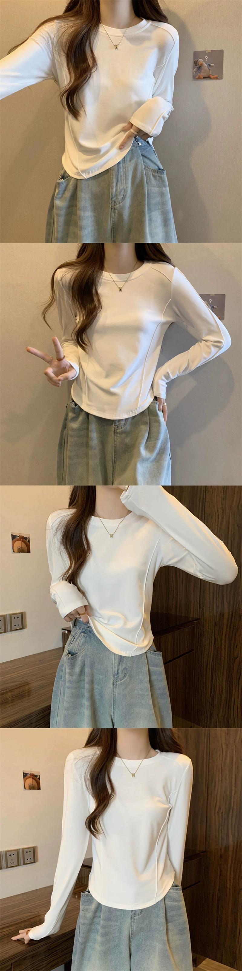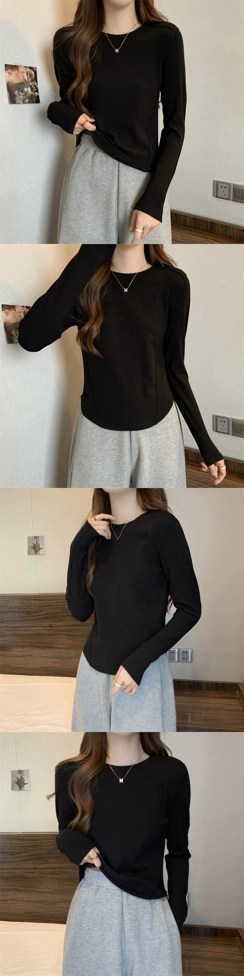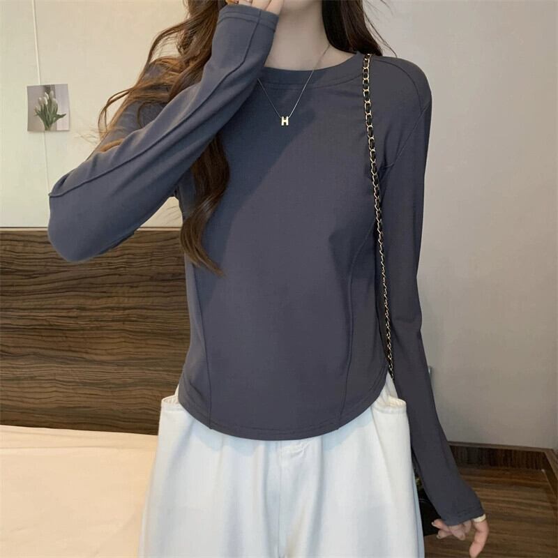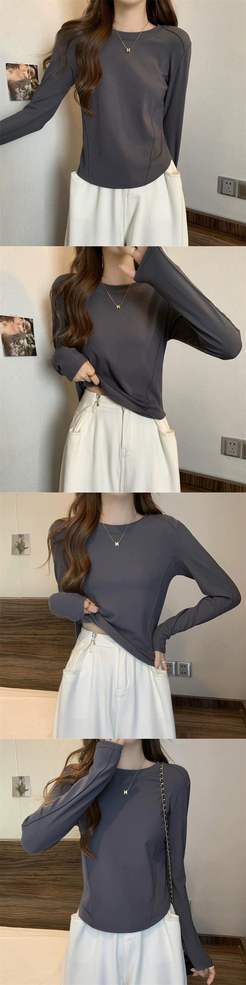 秋と冬の茶色の厚い起毛底シャツの女性、スリムで不規則な長袖Tシャツ、内側に短いトップが付いています ショート ロング オータム 秋物 ウィンター 冬物 7460089710394027 | framboise21