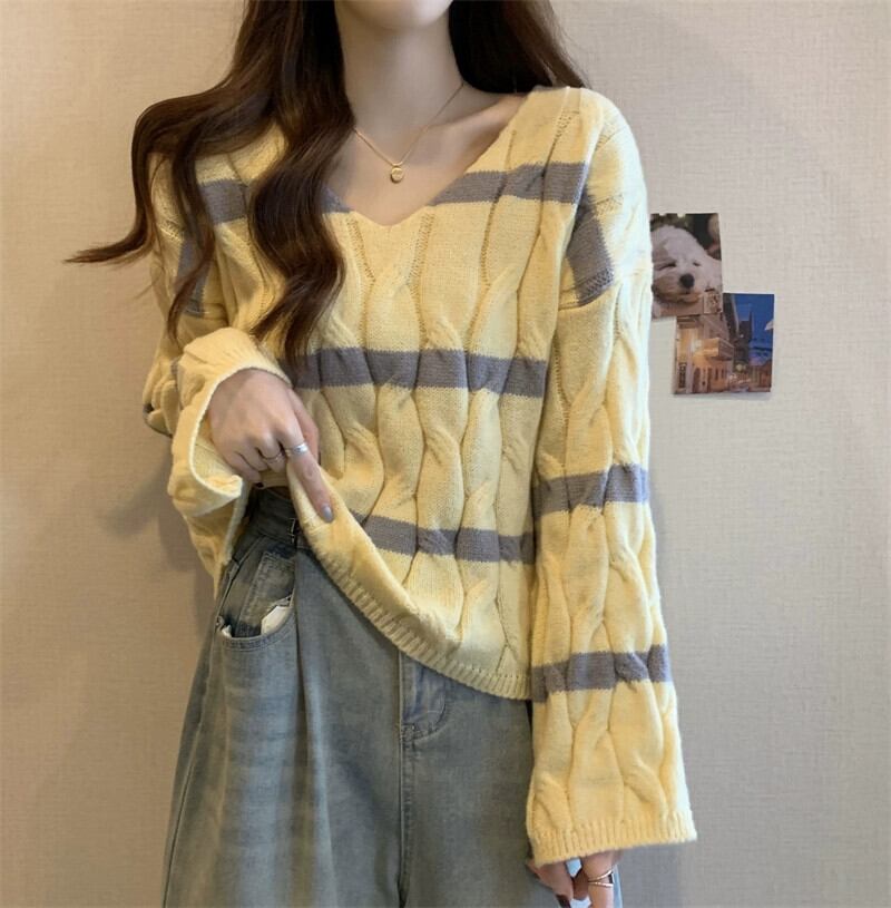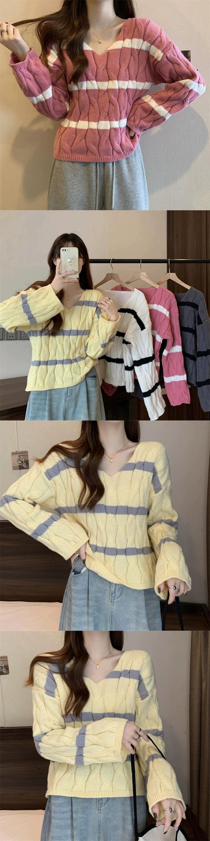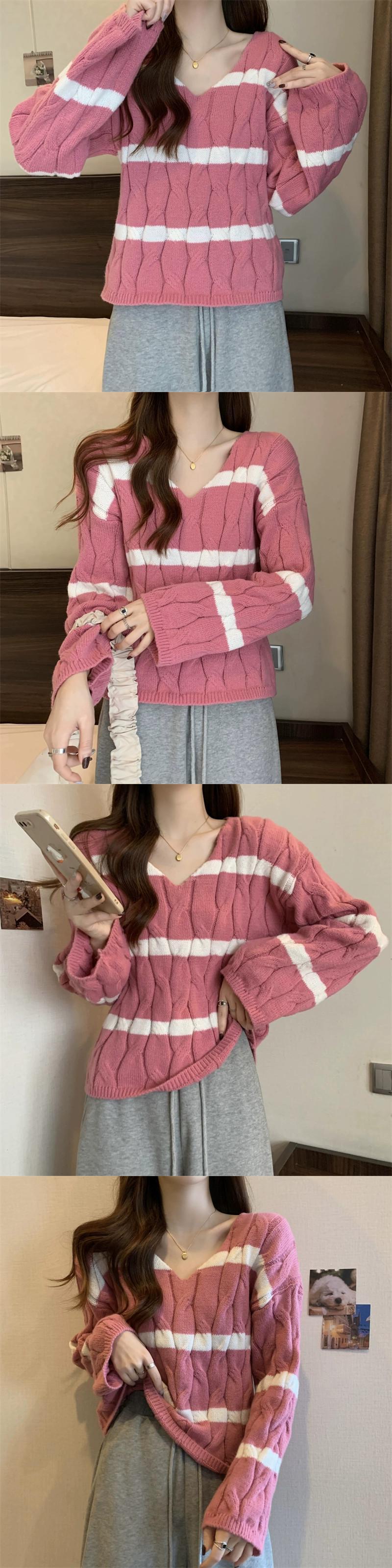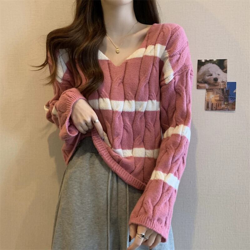 ピンクのストライプのショートツイストセーターレディース、秋と冬のレトロなデザイン、ルーズなアウターウェアプルオーバーVネックニットトップ オータム 秋物 ウィンター 冬物 7460072927455698 | framboise21
