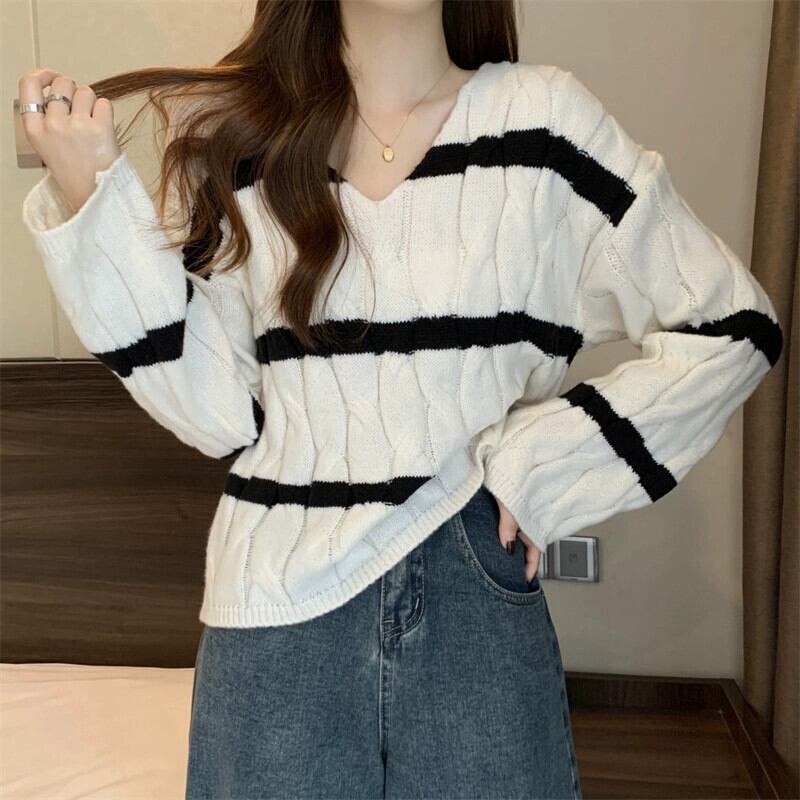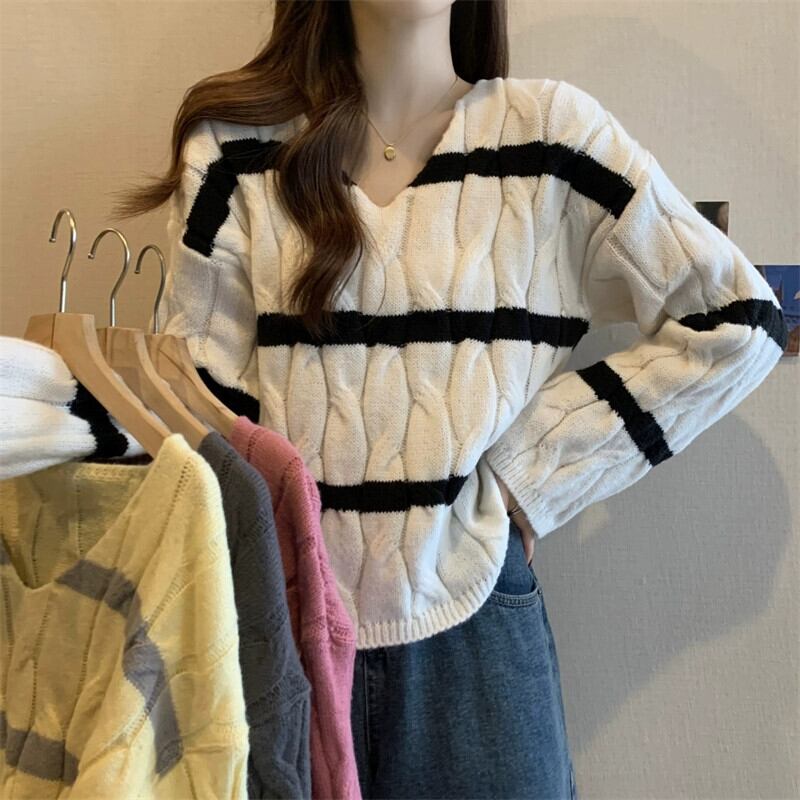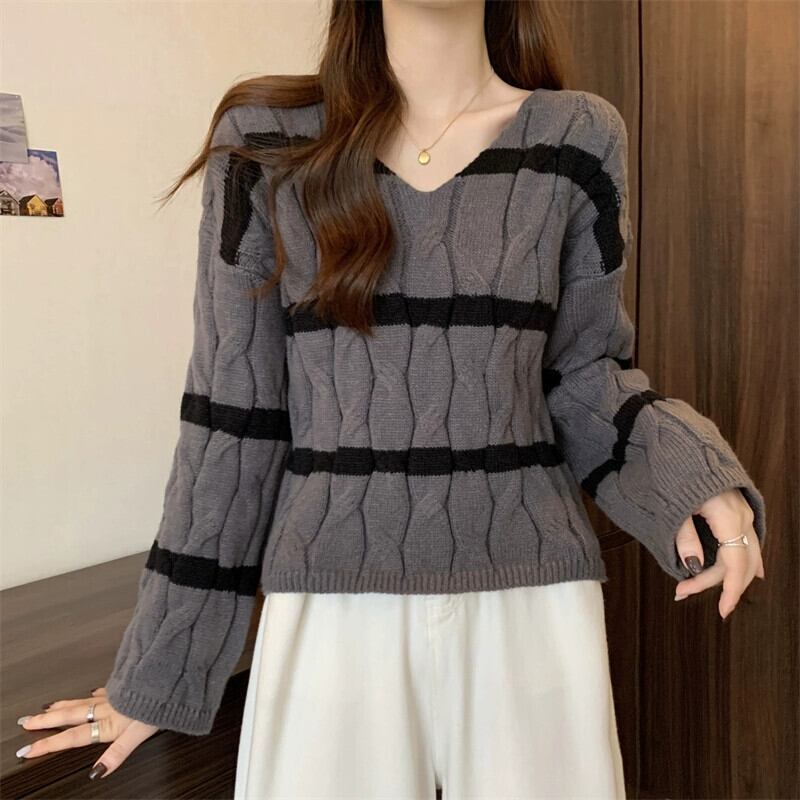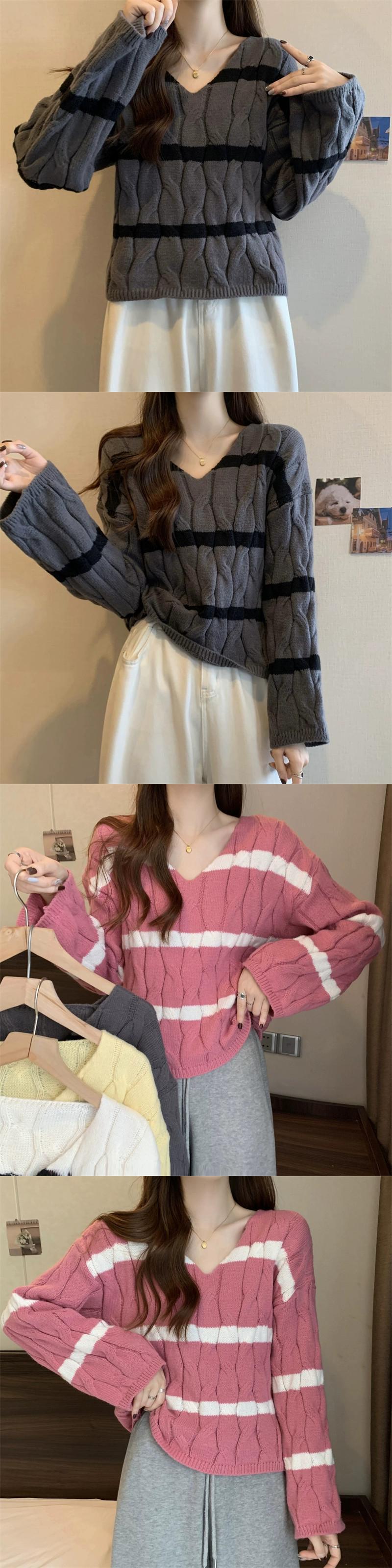 ピンクのストライプのショートツイストセーターレディース、秋と冬のレトロなデザイン、ルーズなアウターウェアプルオーバーVネックニットトップ オータム 秋物 ウィンター 冬物 7460072927455698 | framboise21
