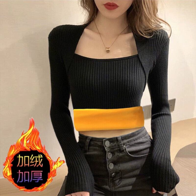 秋と冬の厚いベルベットの底シャツの女性、ハイエンド、スタイリッシュ、スリムフィットインナーレイヤー、暖かい露出鎖骨スクエアネックニットセーター オータム 秋物 ウィンター 冬物 スクウェア 7460023917075132 | framboise21