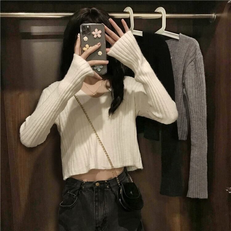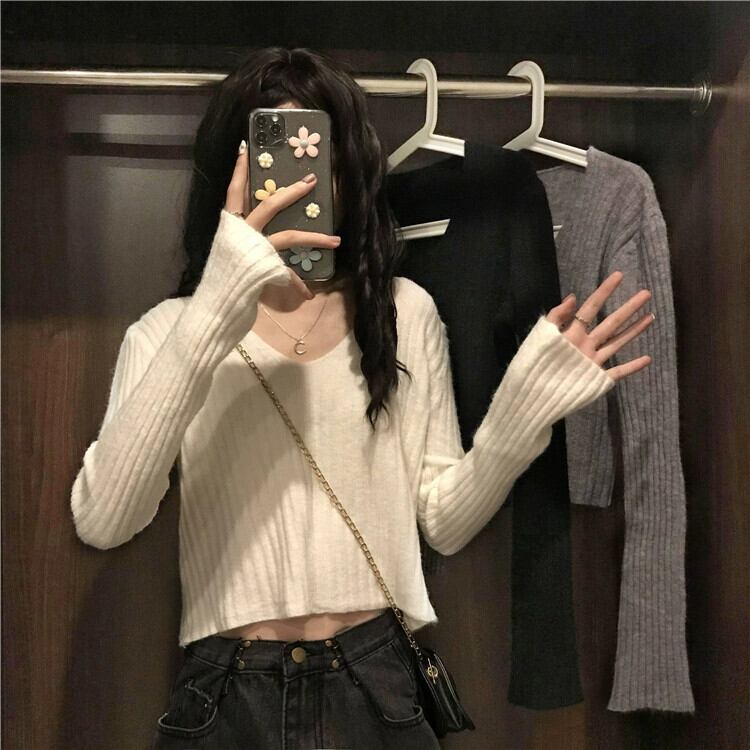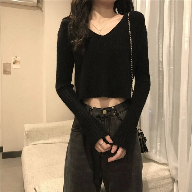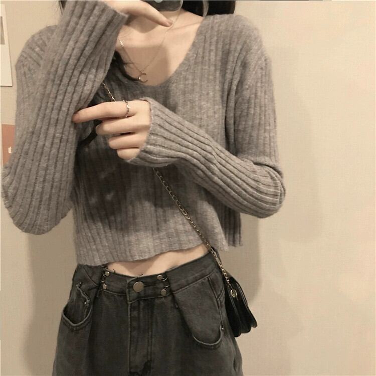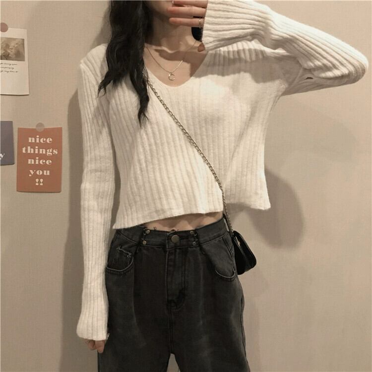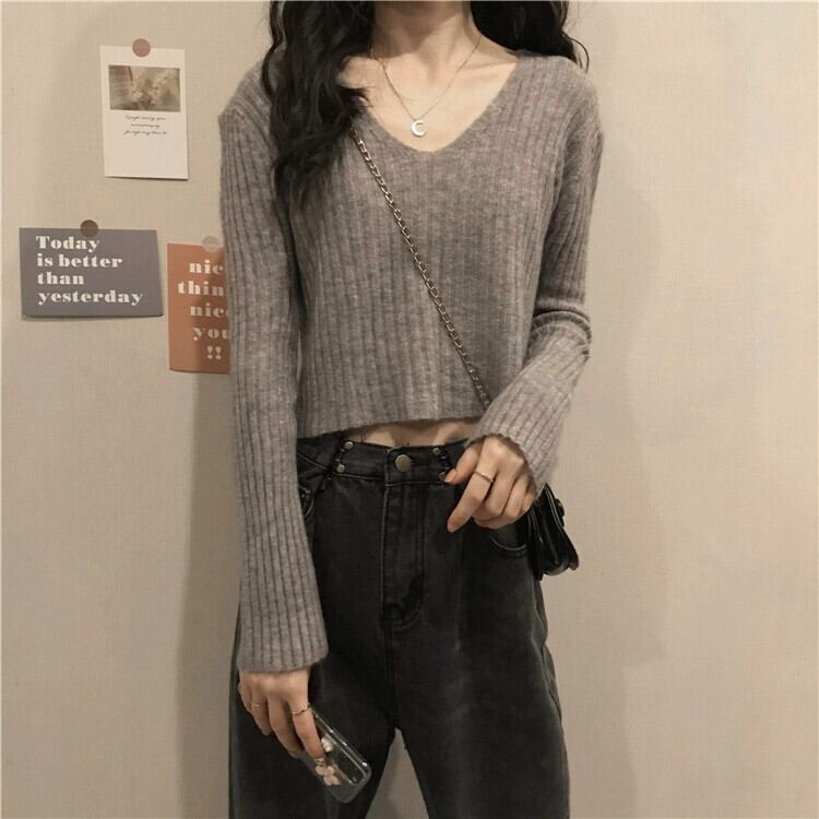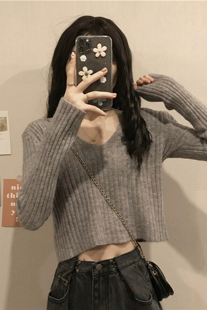 小さなハイウエストショートボトミングセーター女性秋と冬のフランスのルーズ痩身インナー層厚くなった V ネックニットトップ オータム 秋物 ウィンター 冬物 Vネック 746001969120013 | framboise21
