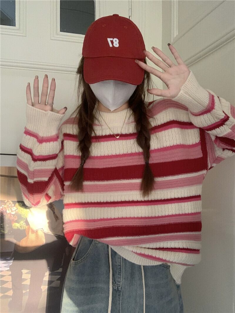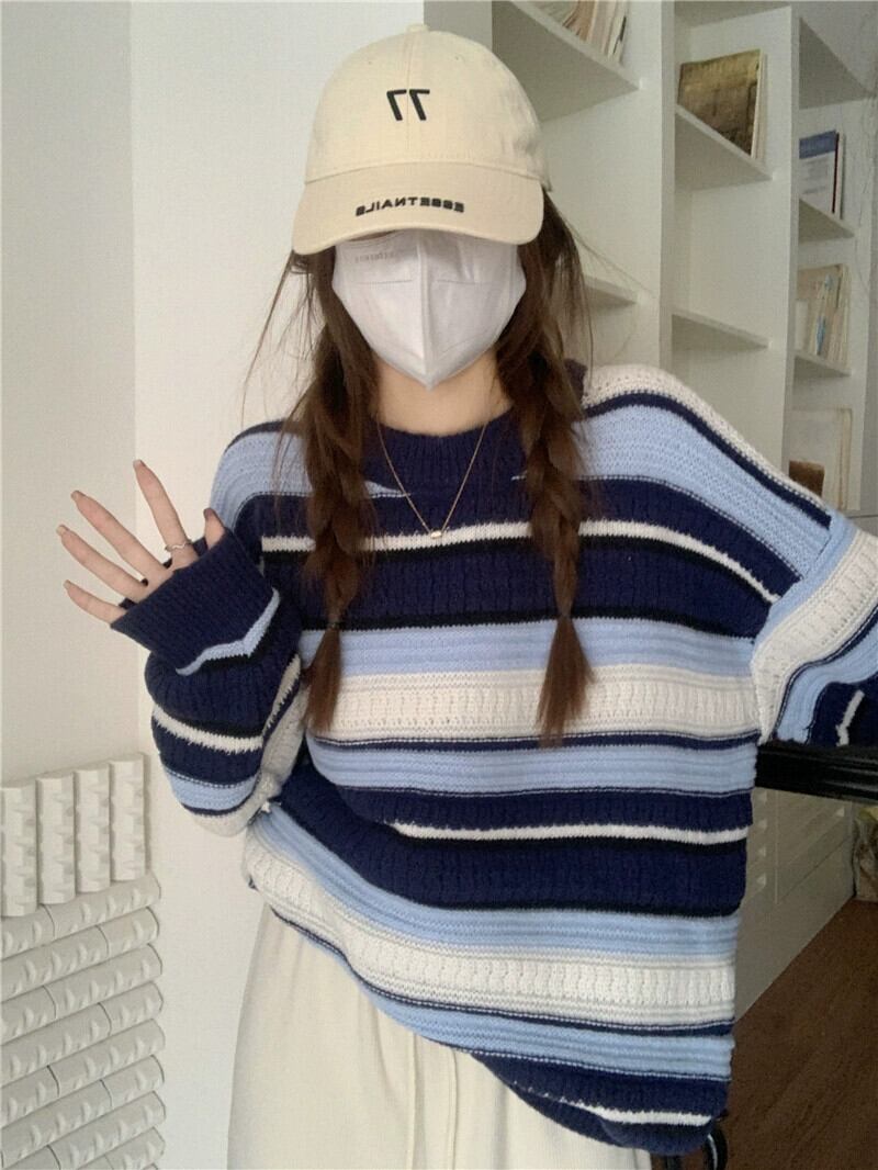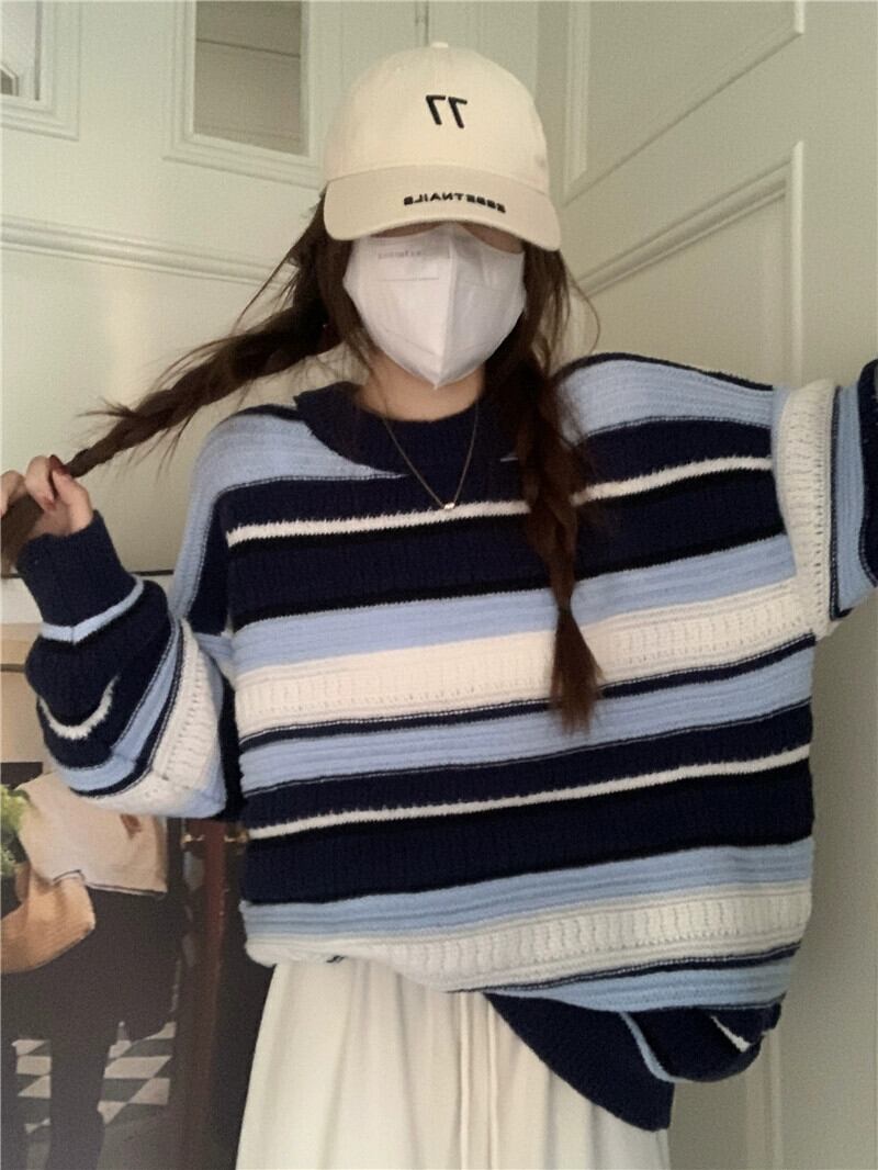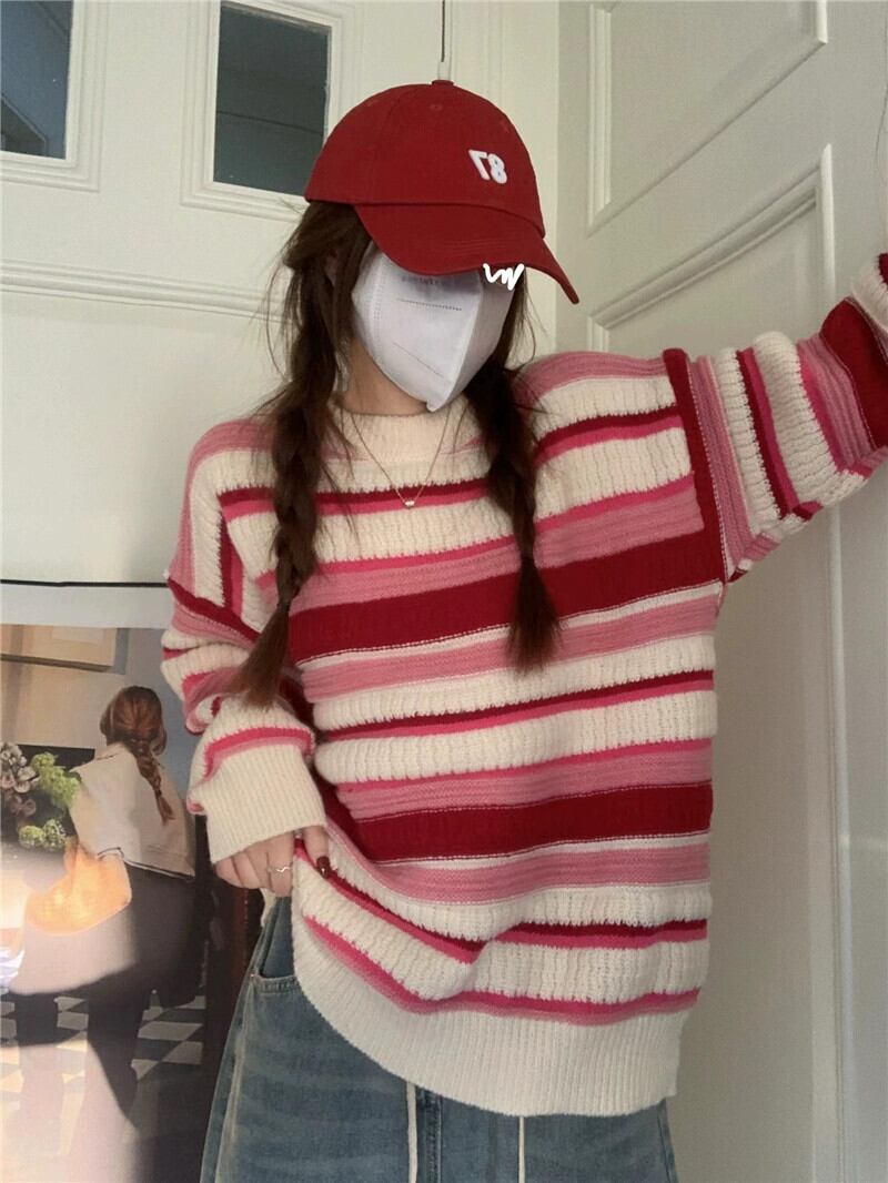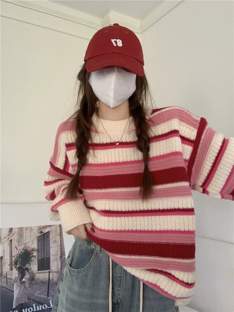 秋冬の厚みのあるストライプのセーターの女性、ファッショナブルなルーズなアウターウェア、怠惰なスタイル、痩身、多用途のプルオーバー長袖セーター ロング オータム 秋物 ウィンター 冬物 7460070531245070 | framboise21
