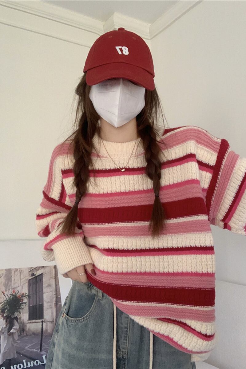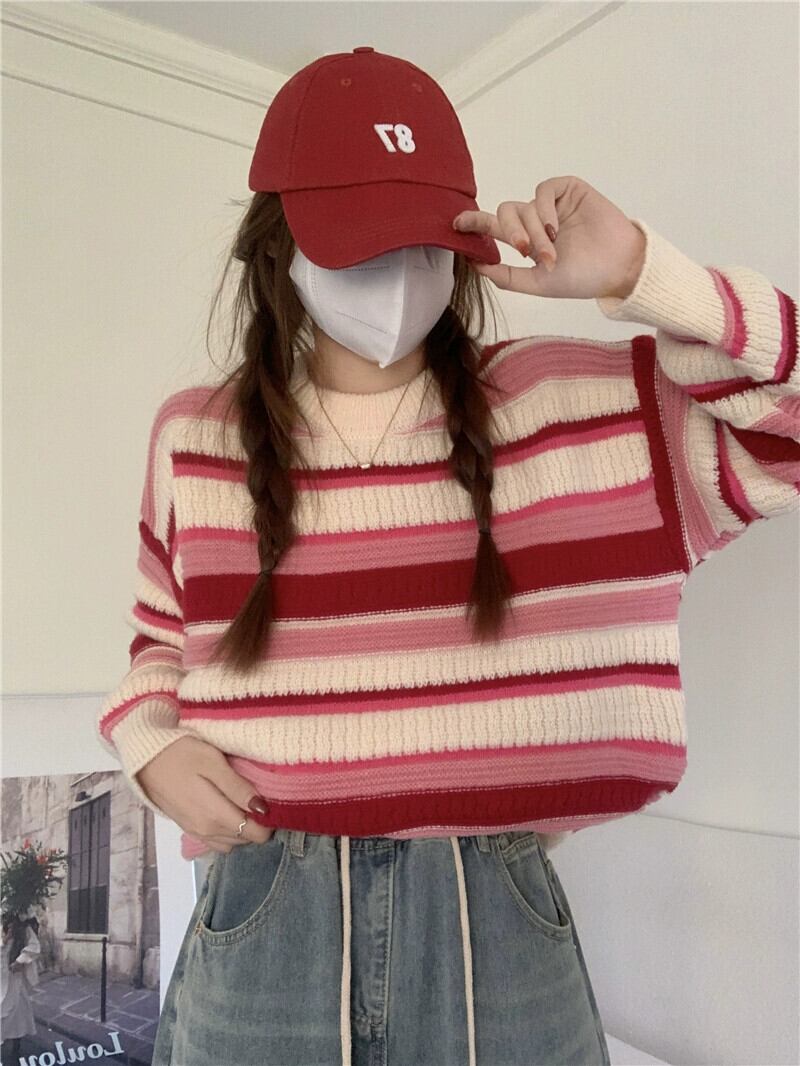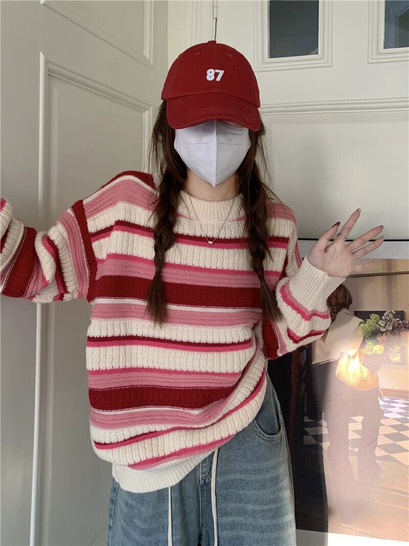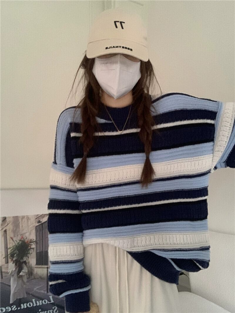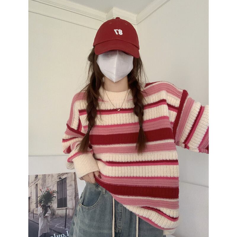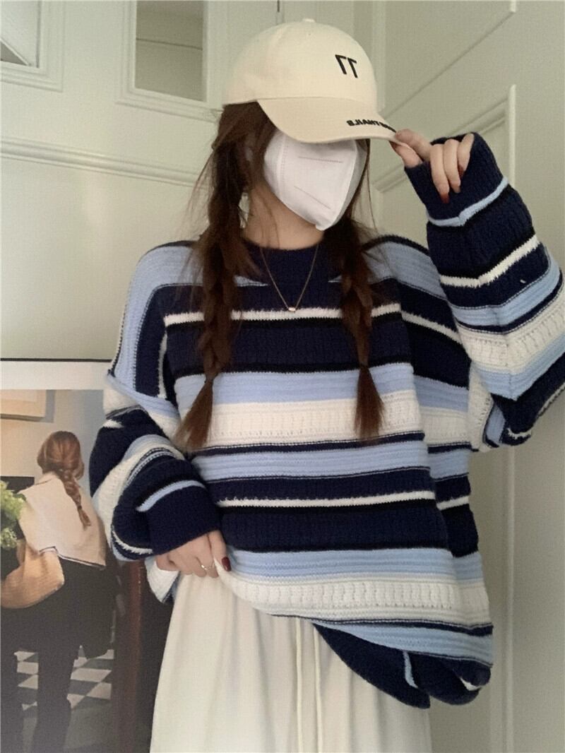秋冬の厚みのあるストライプのセーターの女性、ファッショナブルなルーズなアウターウェア、怠惰なスタイル、痩身、多用途のプルオーバー長袖セーター ロング オータム 秋物 ウィンター 冬物 7460070531245070 | framboise21