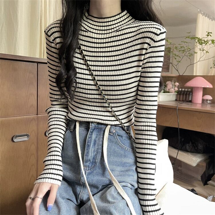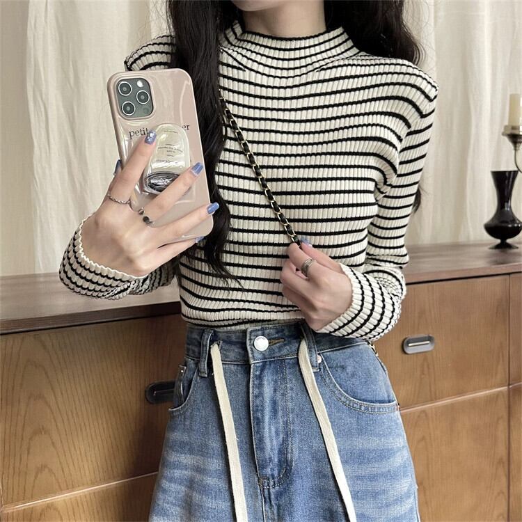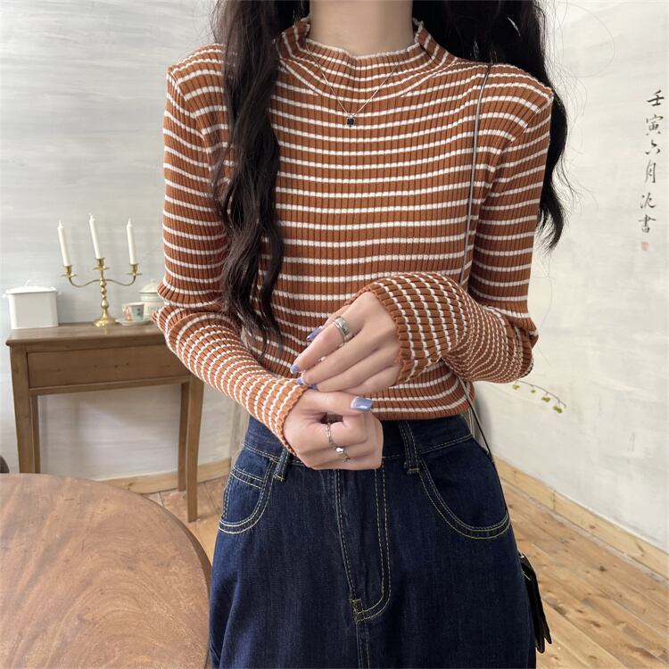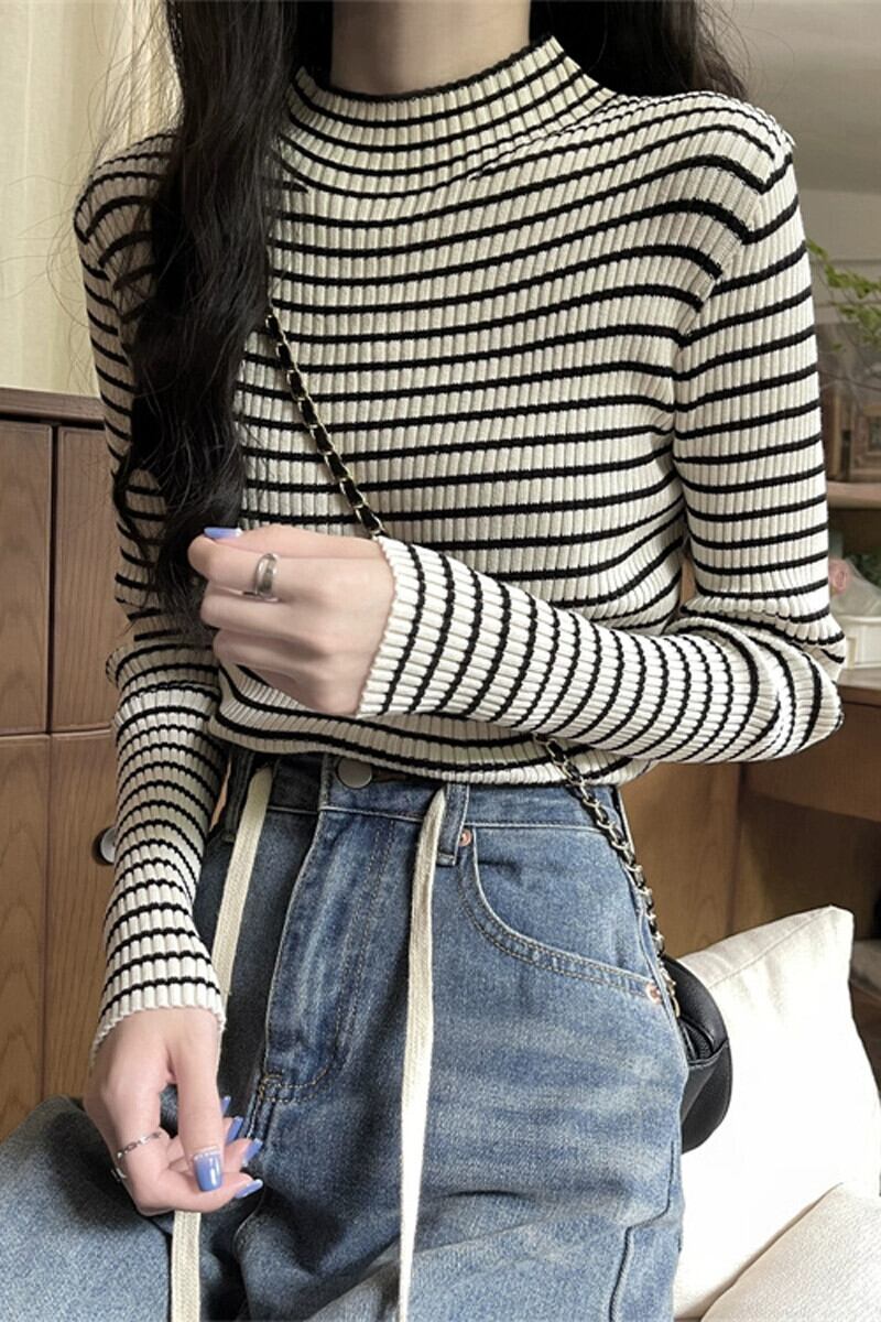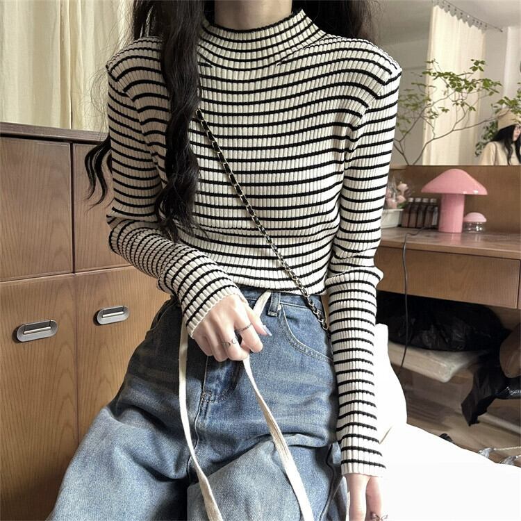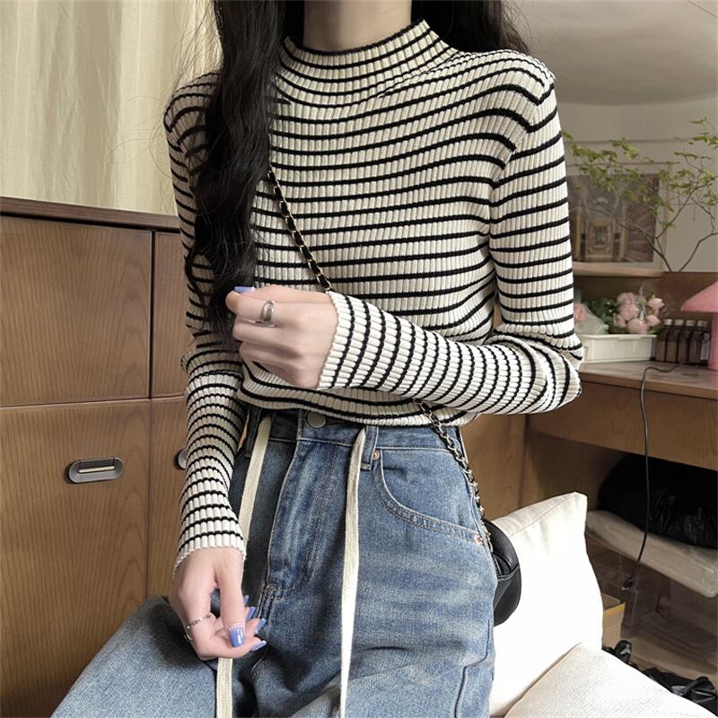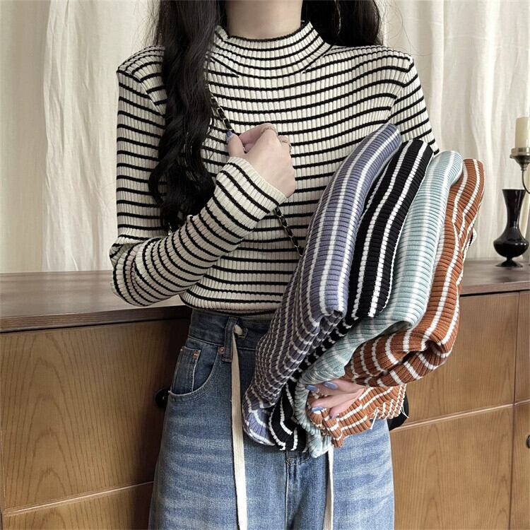秋冬の厚みのあるストライプハーフタートルネックボトムシャツレディース、ファッショナブルで西洋風のインナーニットセーター、スリムでスリムなミッドカラーセーター オータム 秋物 ウィンター 冬物 7460015254226102 | framboise21