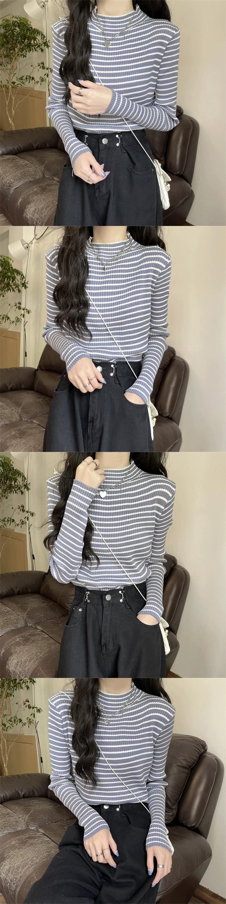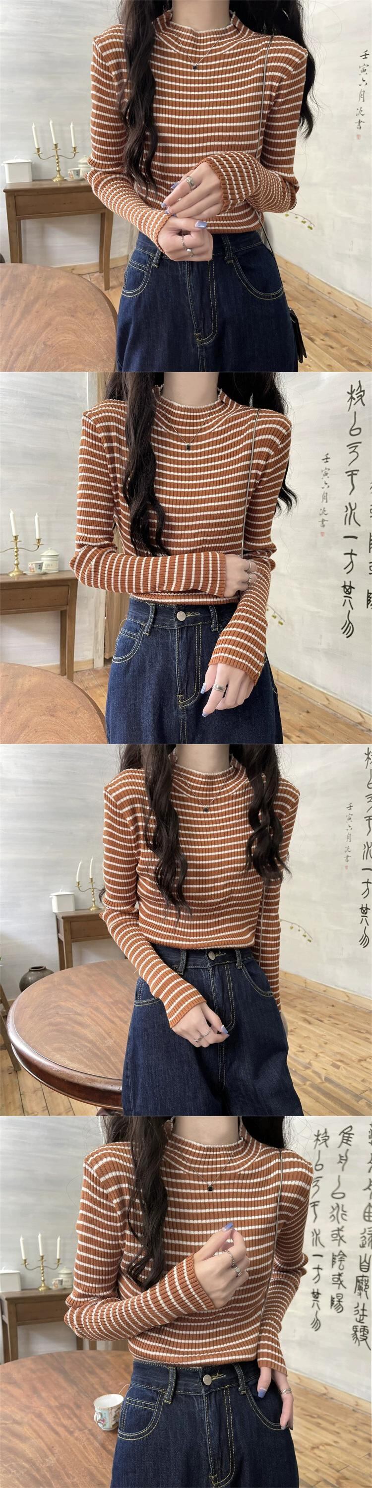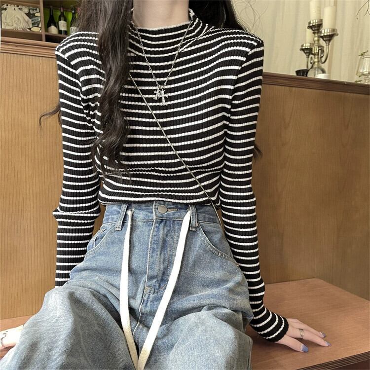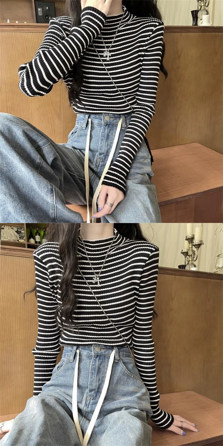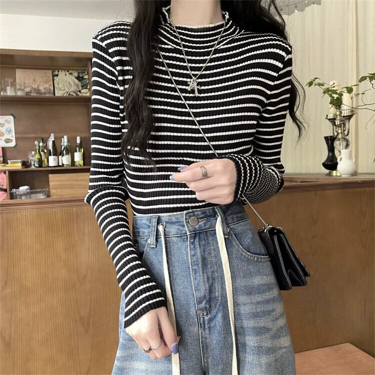 秋冬の厚みのあるストライプハーフタートルネックボトムシャツレディース、ファッショナブルで西洋風のインナーニットセーター、スリムでスリムなミッドカラーセーター オータム 秋物 ウィンター 冬物 7460015254226102 | framboise21