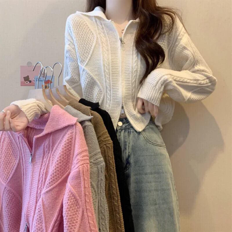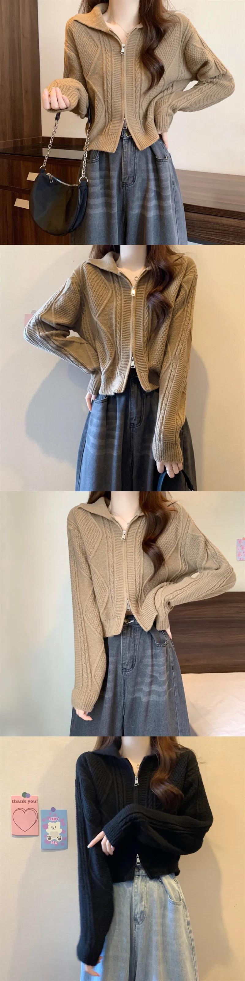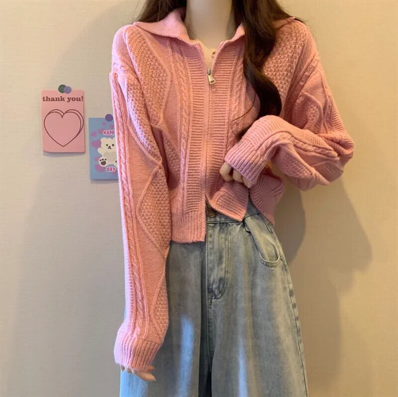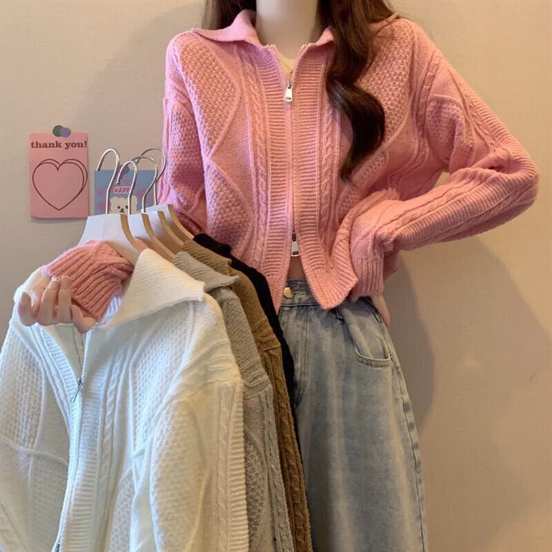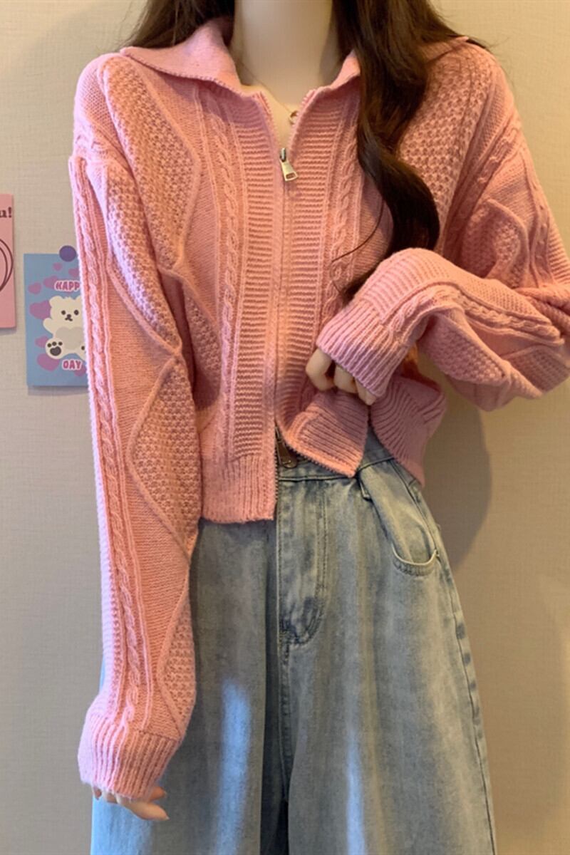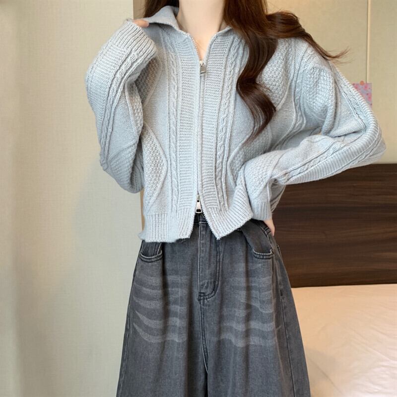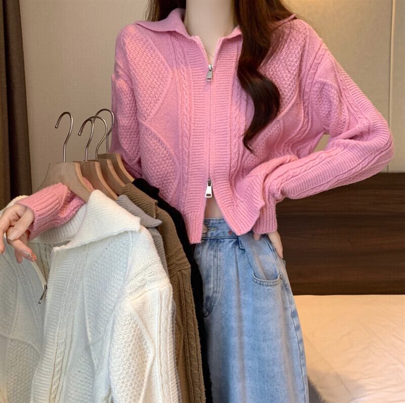 ジッパーショートポロカラーツイストセータージャケット女性の秋と冬のルーズアウターウェア痩身肥厚長袖ニットカーディガン ロング オータム 秋物 ウィンター 冬物 7460089673060543 | framboise21