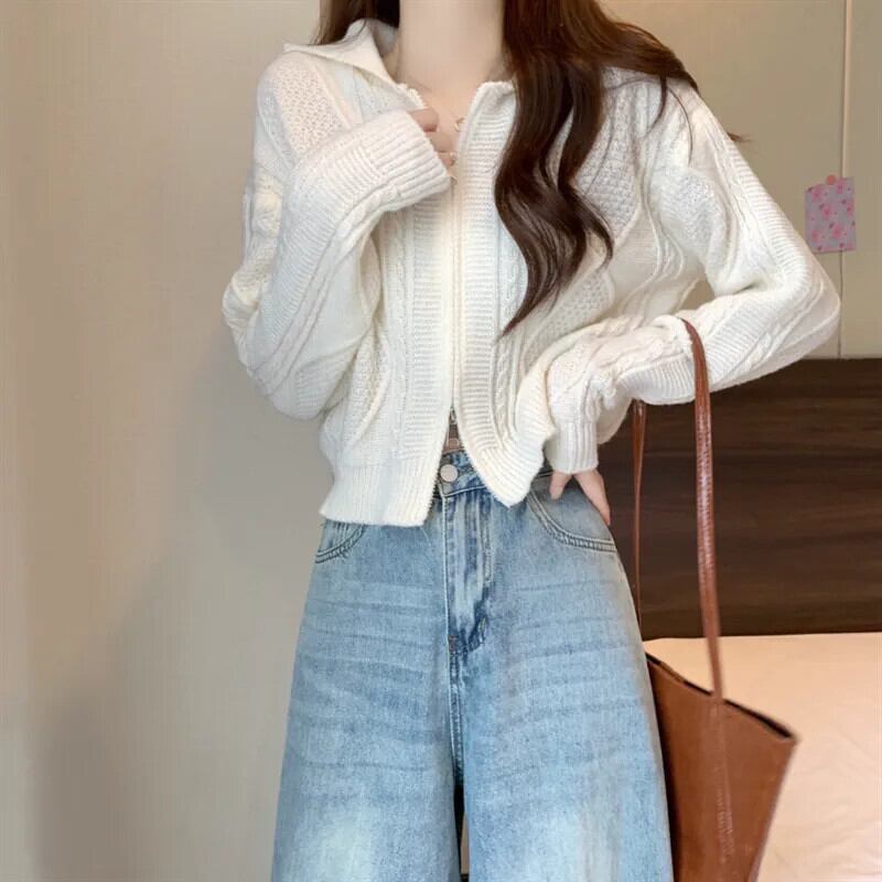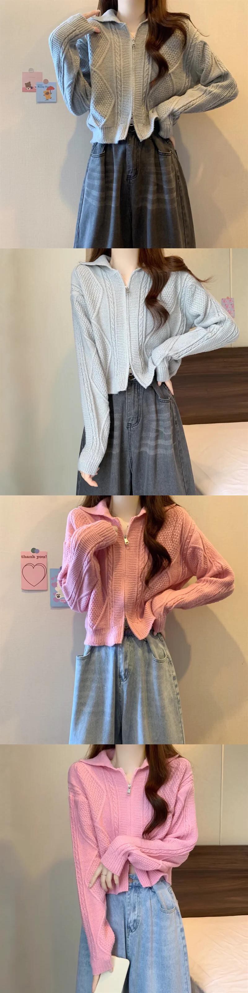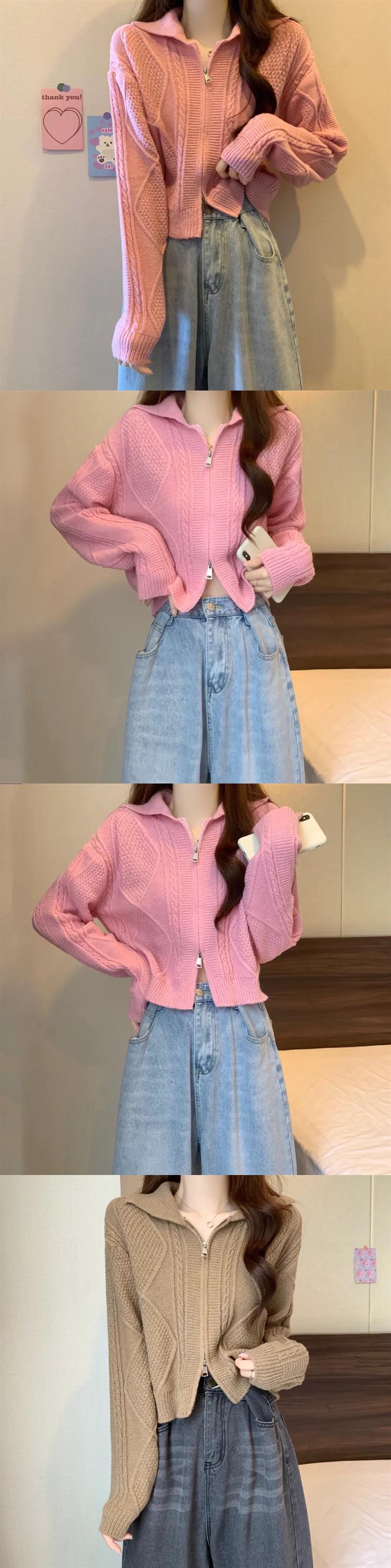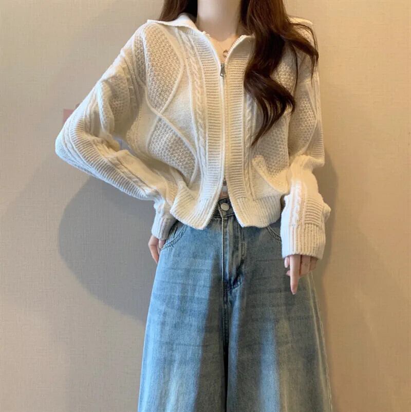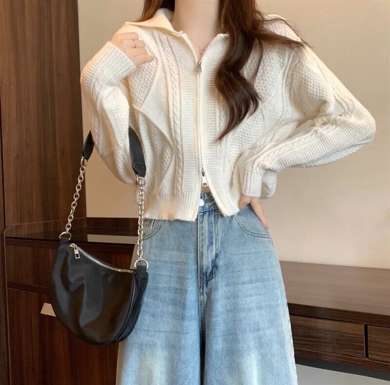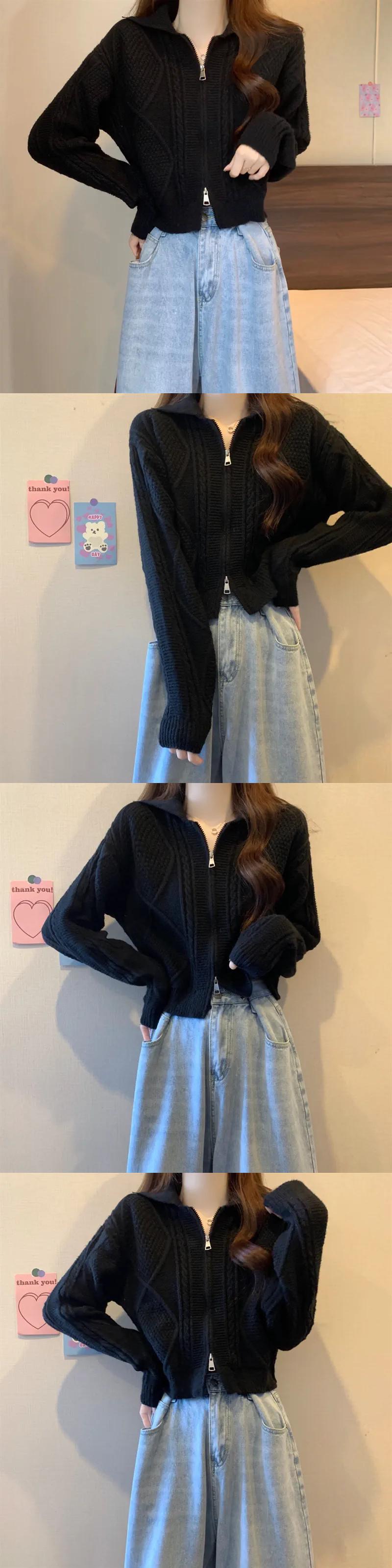 ジッパーショートポロカラーツイストセータージャケット女性の秋と冬のルーズアウターウェア痩身肥厚長袖ニットカーディガン ロング オータム 秋物 ウィンター 冬物 7460089673060543 | framboise21