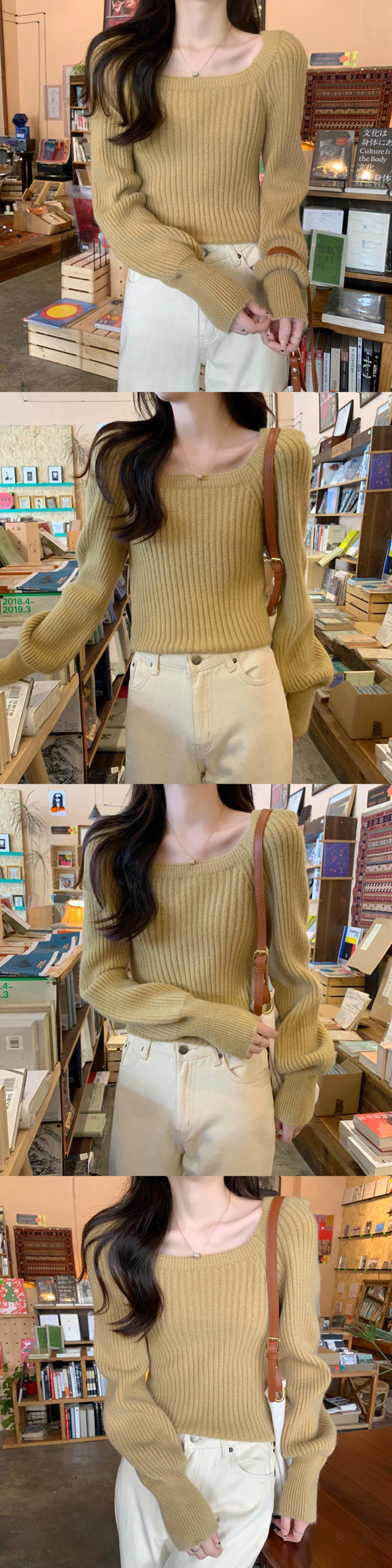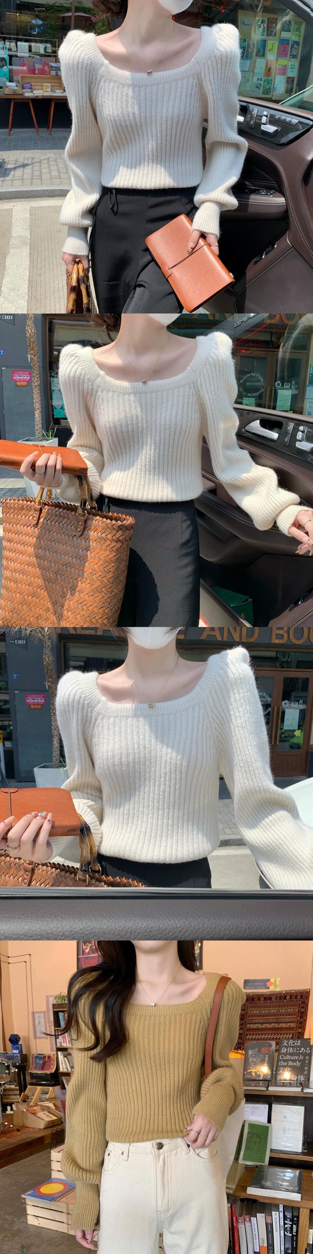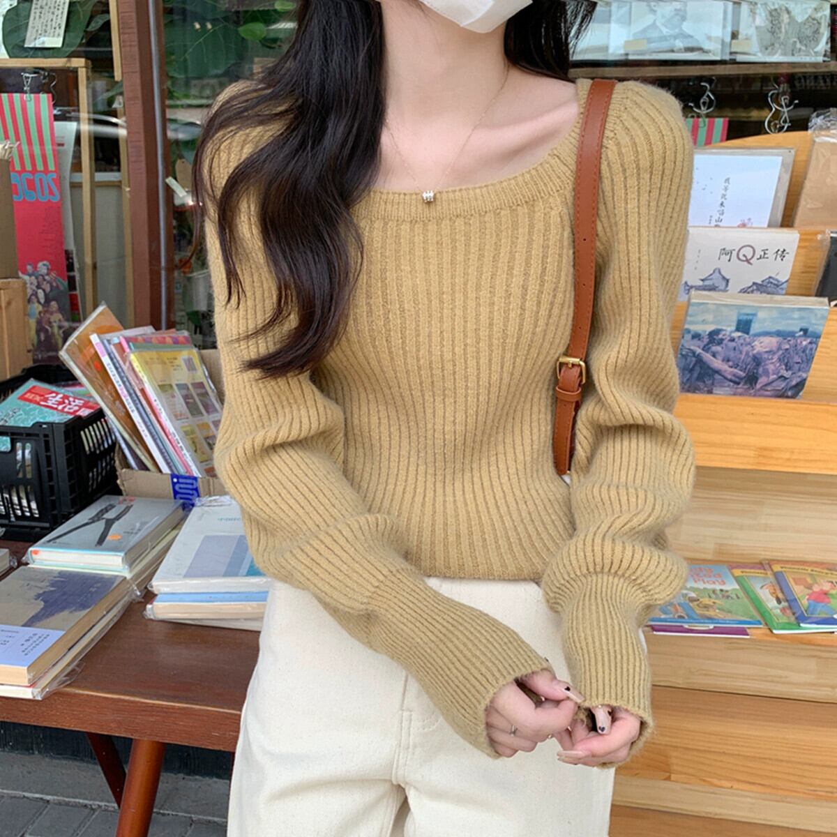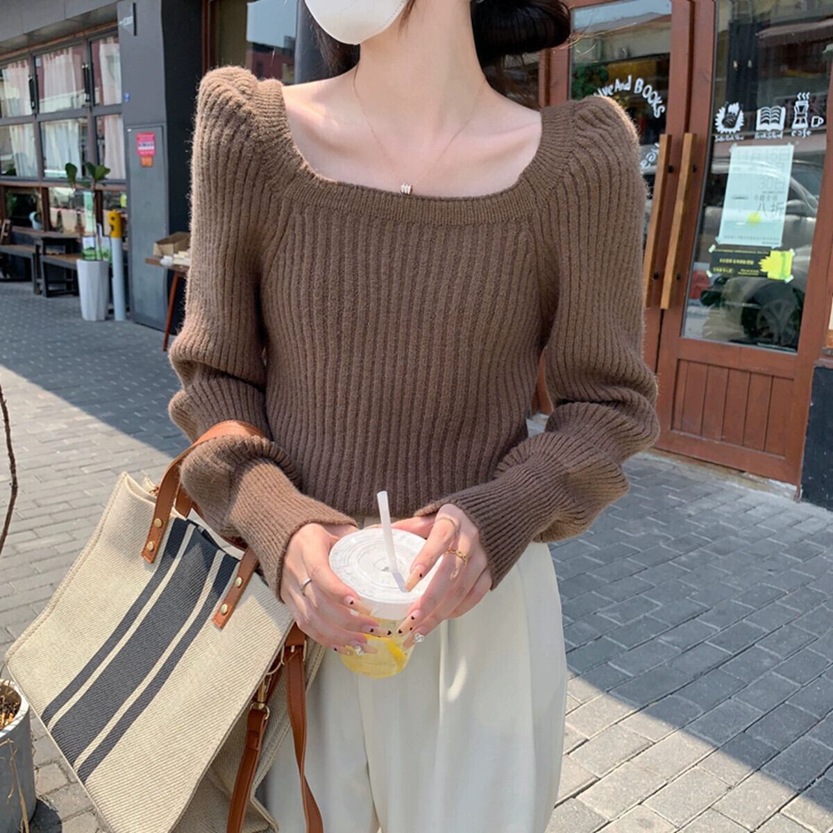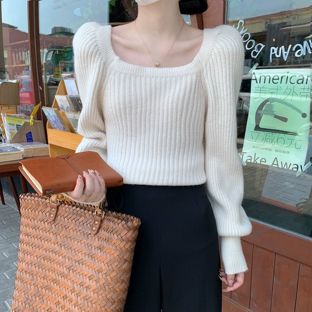 秋冬のソフトワックスランタンスリーブセーターレディース、ファッショナブルでスリム、外側と内側で着用可能、底付きスクエアネック長袖セーター ロング オータム 秋物 ウィンター 冬物 スクウェア 7460099704570046 | framboise21