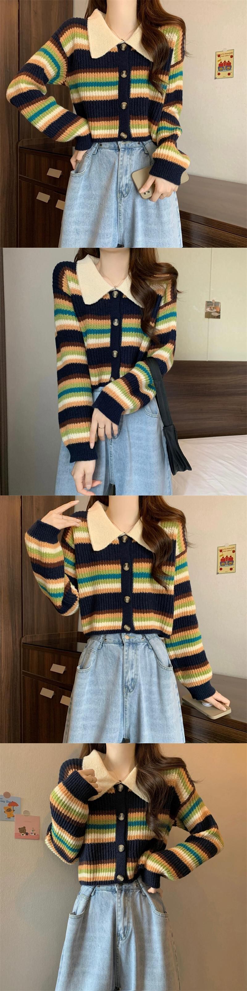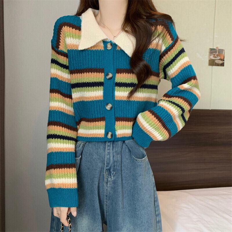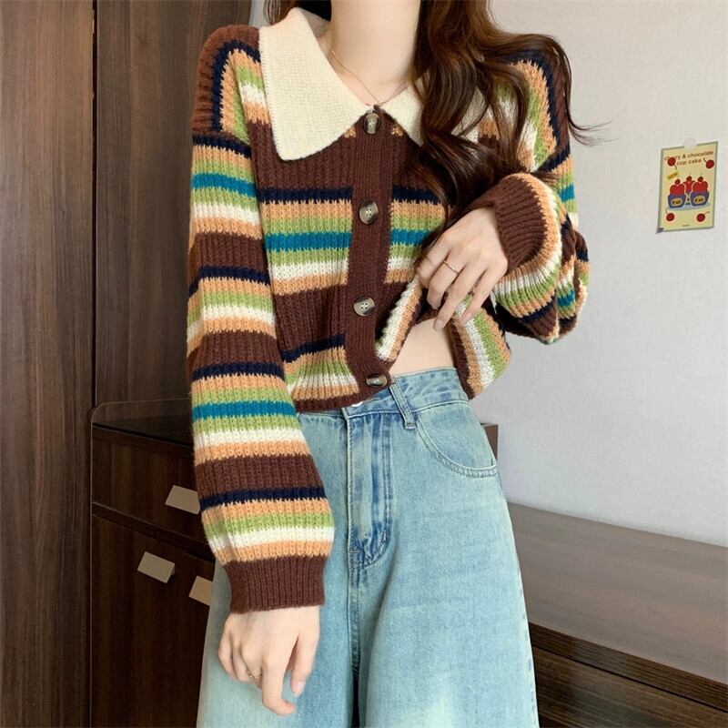 ストライプショートポロカラーセータージャケット女性の秋と冬のレトロなルーズアウターウェア痩身ソフトワックス長袖ニットカーディガン ロング オータム 秋物 ウィンター 冬物 7460047462772705 | framboise21