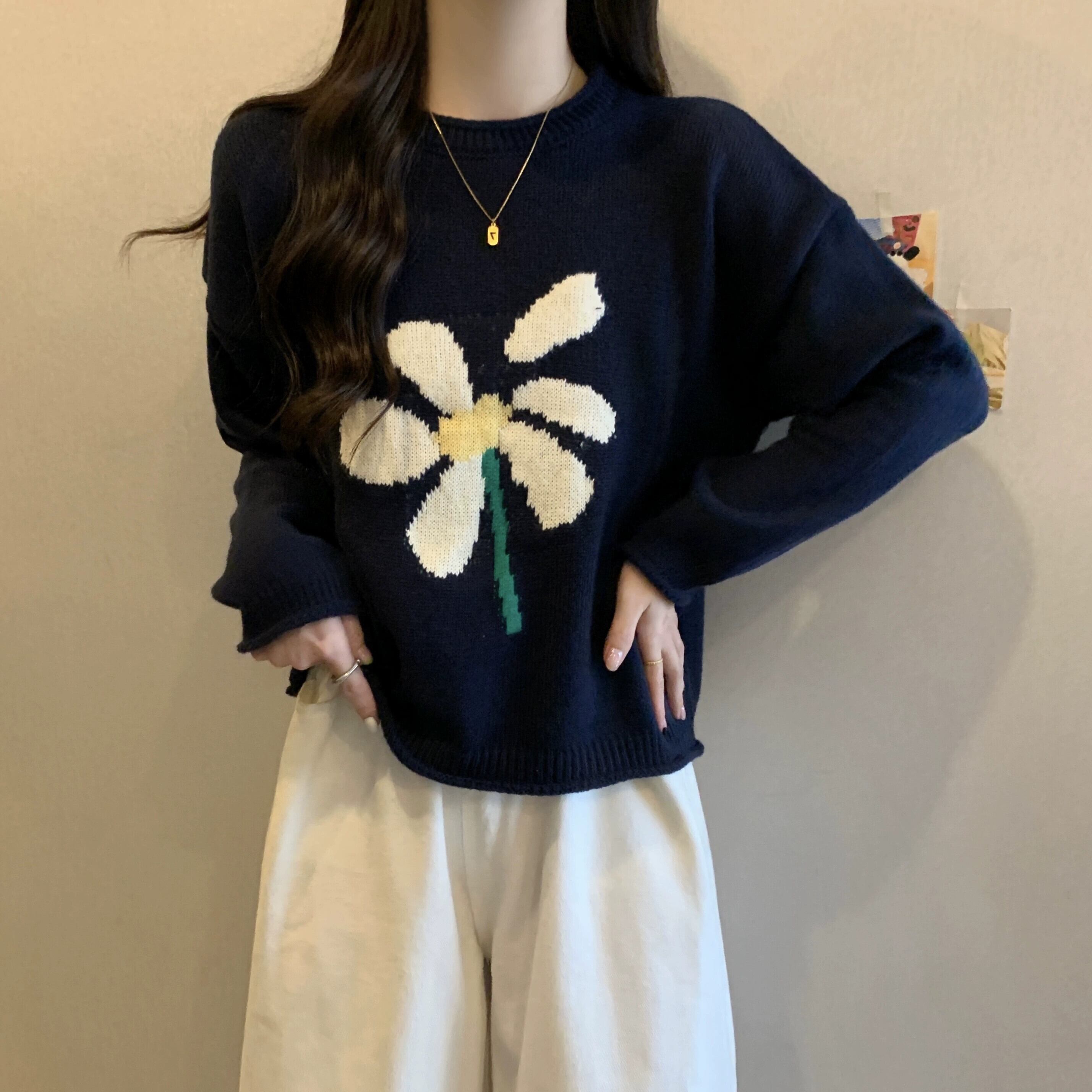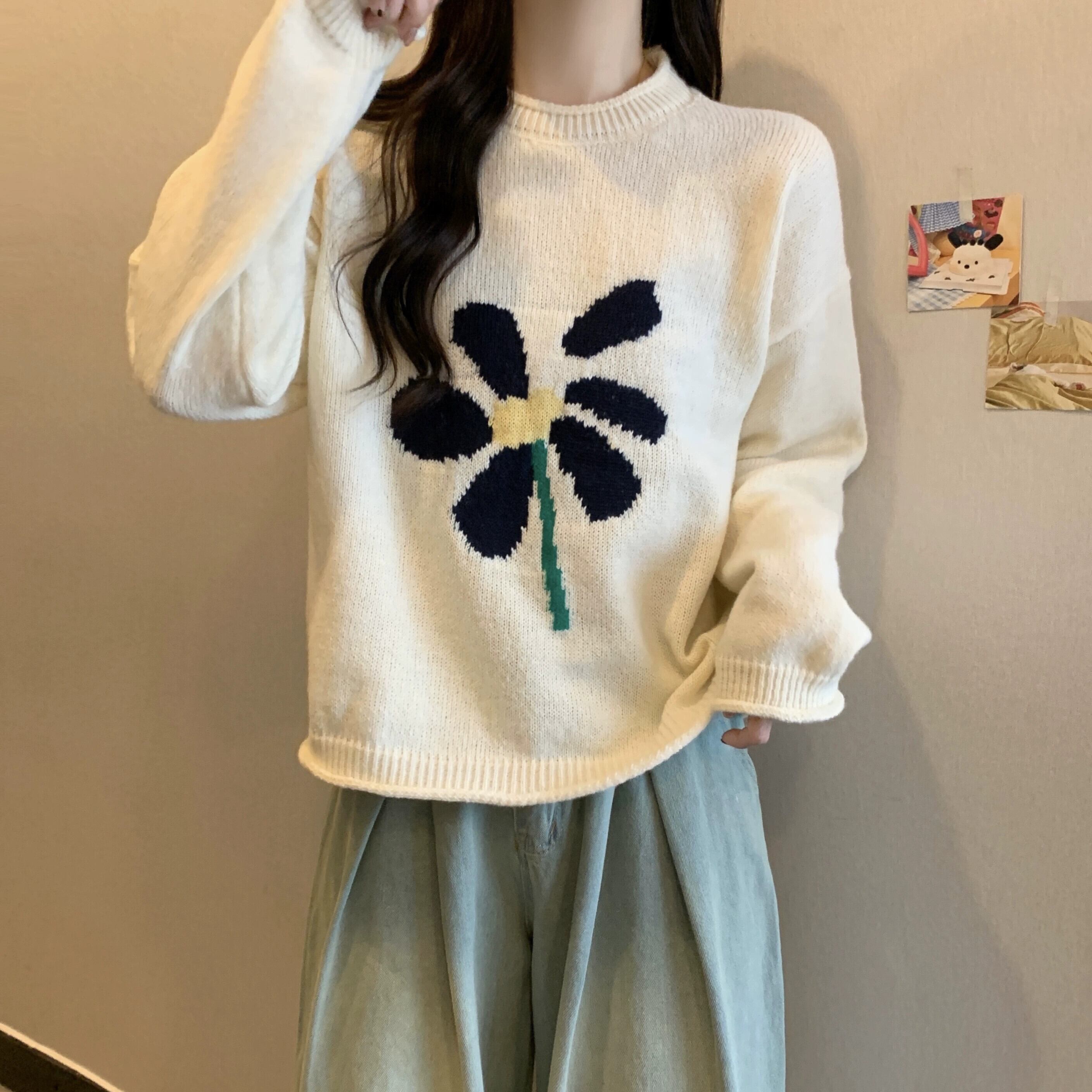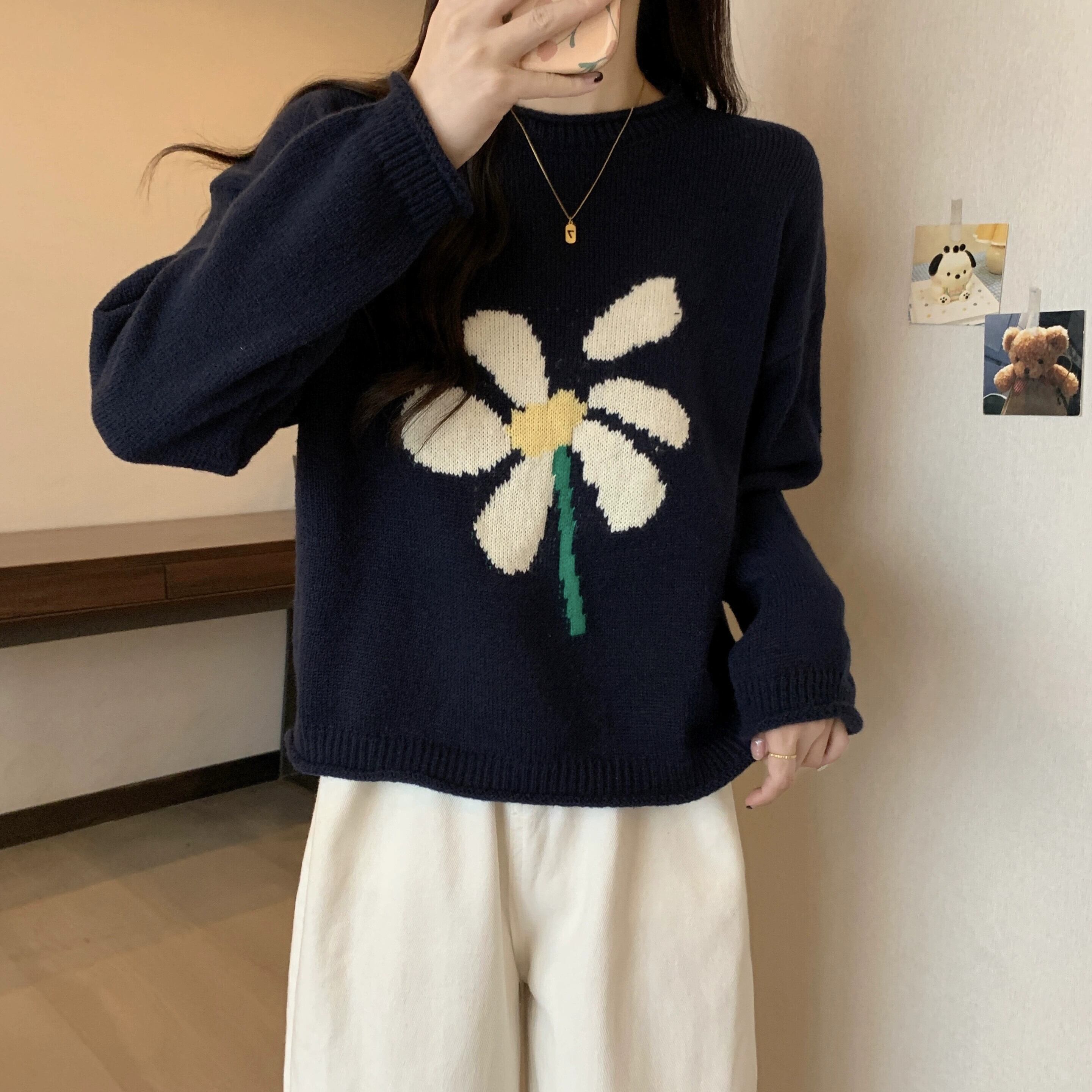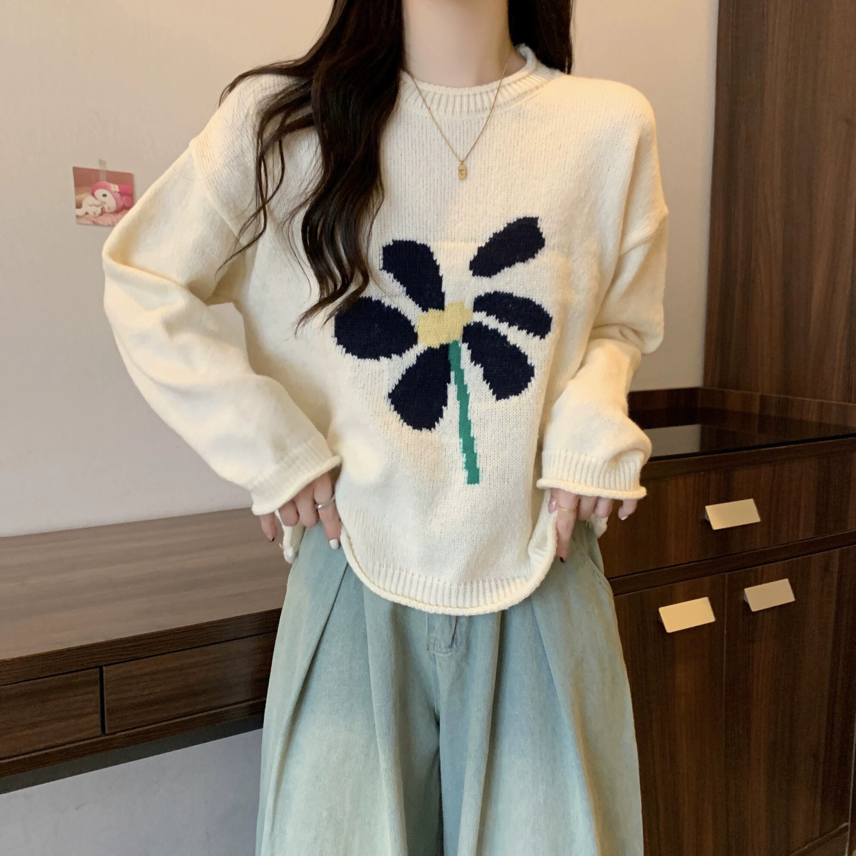 秋と冬の花のラウンドネックショートセーターレディース、ゆったりとしたアウターウェア、怠惰なスタイルのデザイン、長袖インナーボトリングセーター ロング オータム 秋物 ウィンター 冬物 Oネック フラワーデザイン 7460062595567242 | framboise21
