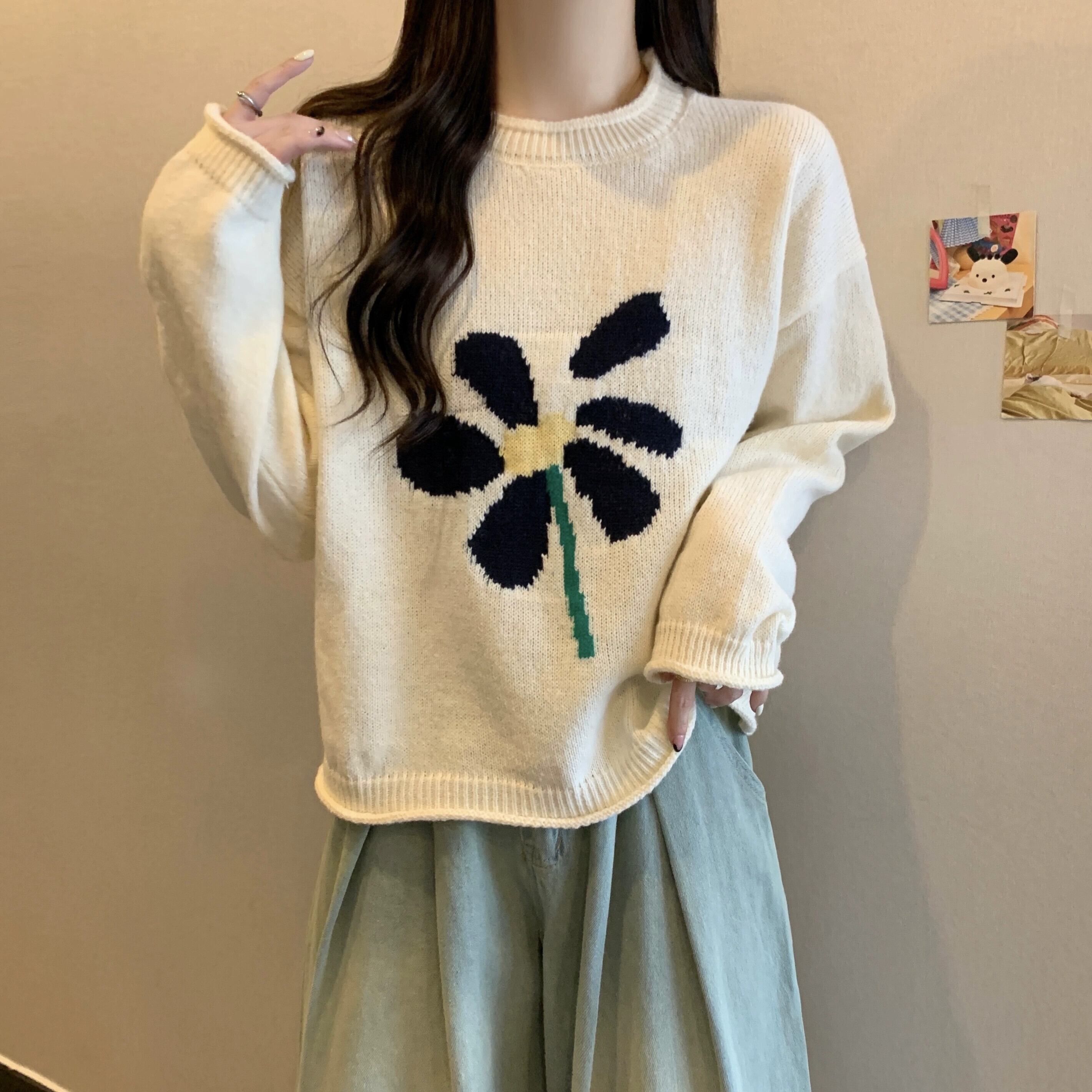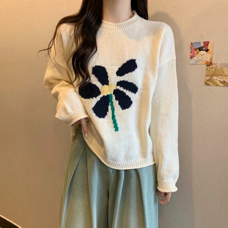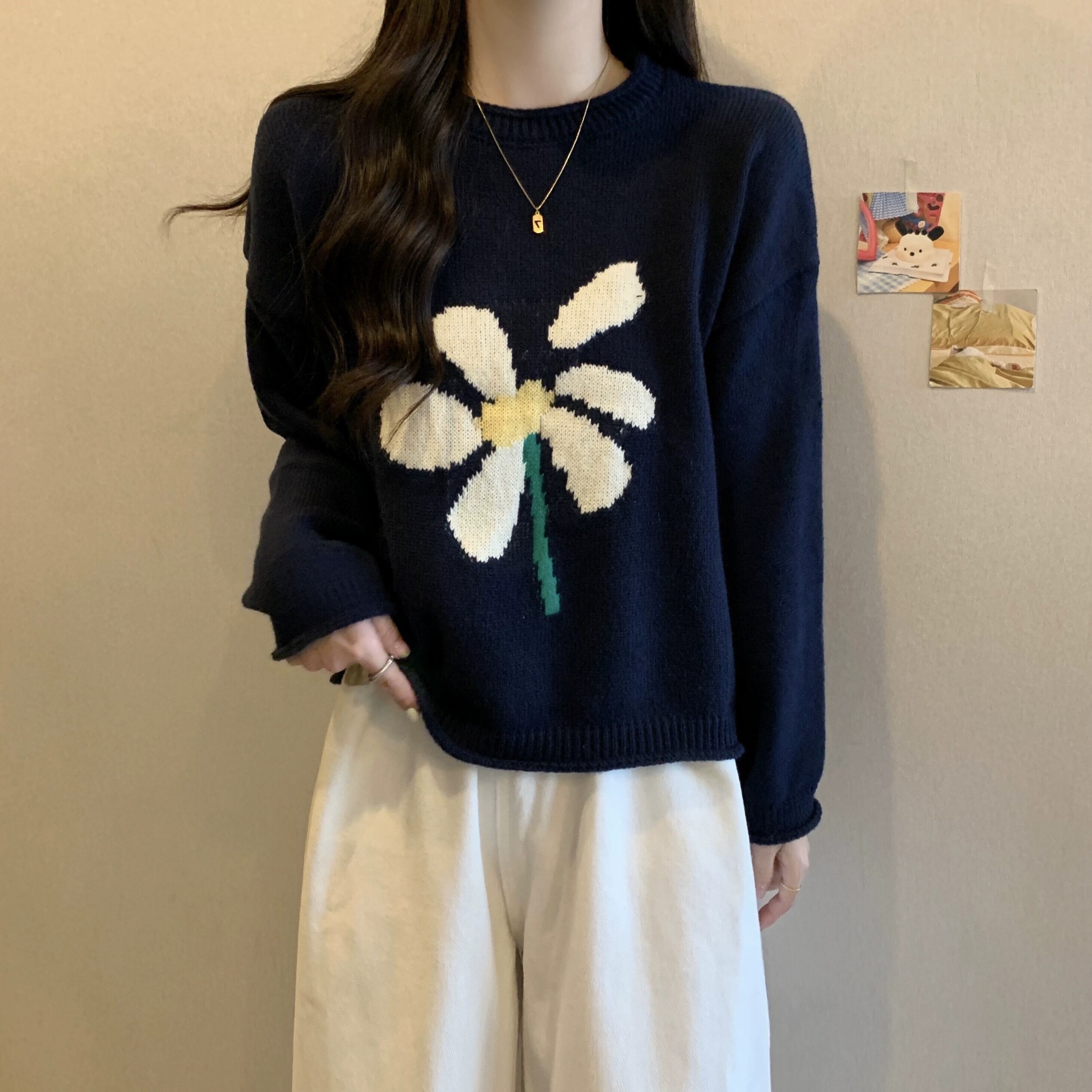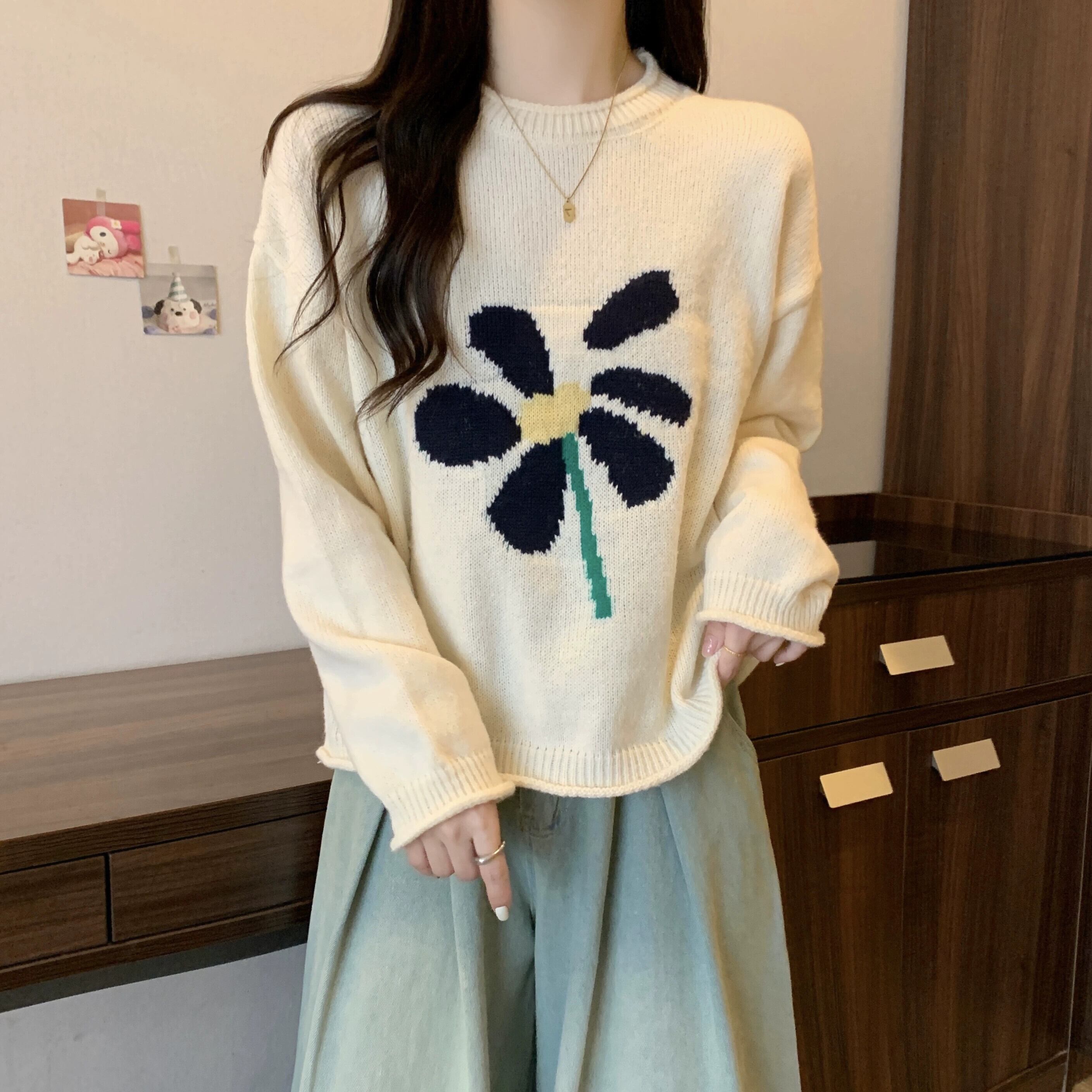 秋と冬の花のラウンドネックショートセーターレディース、ゆったりとしたアウターウェア、怠惰なスタイルのデザイン、長袖インナーボトリングセーター ロング オータム 秋物 ウィンター 冬物 Oネック フラワーデザイン 7460062595567242 | framboise21