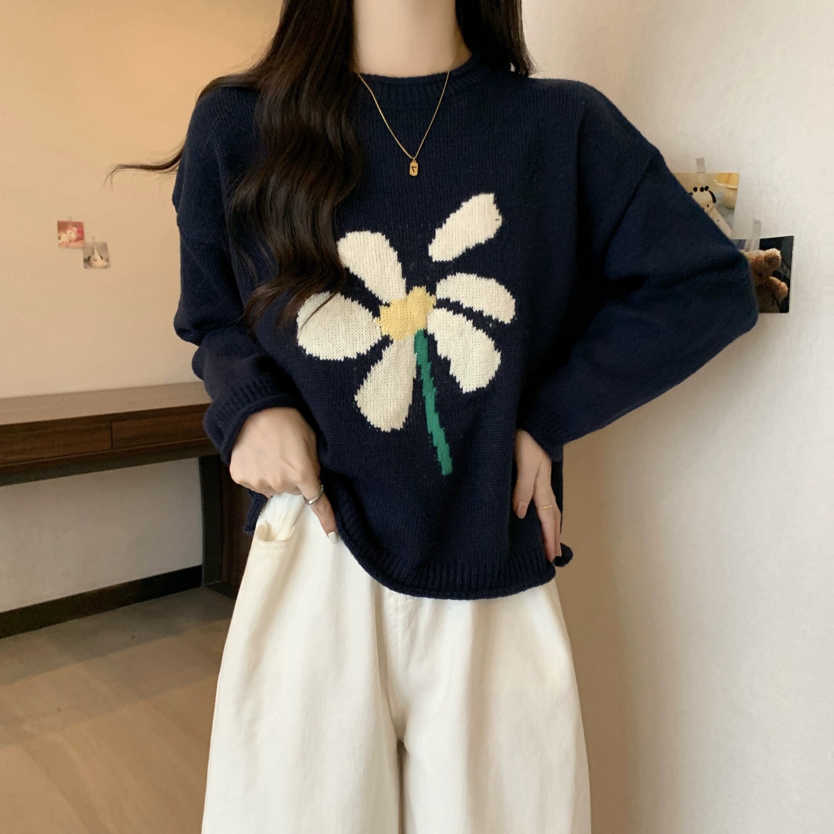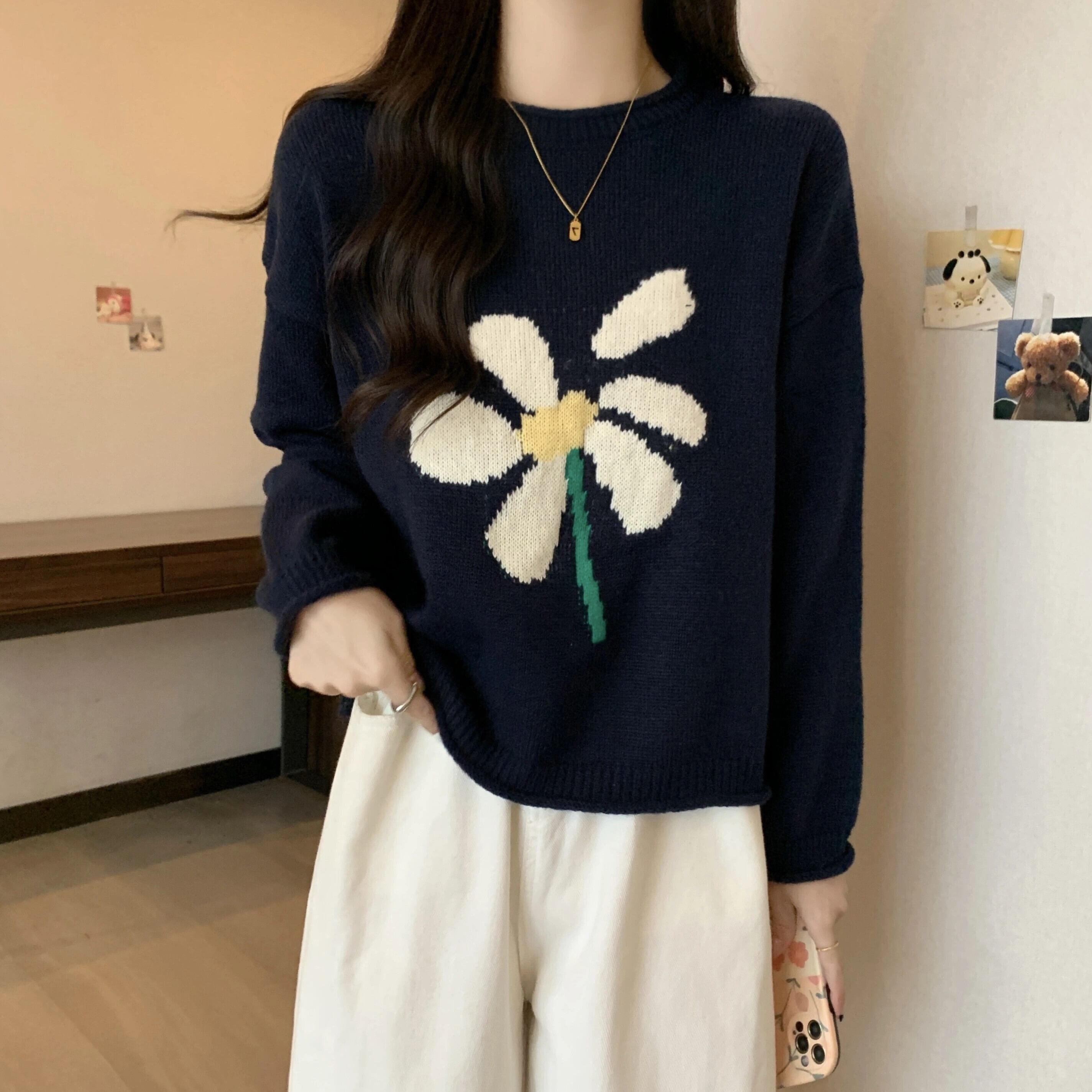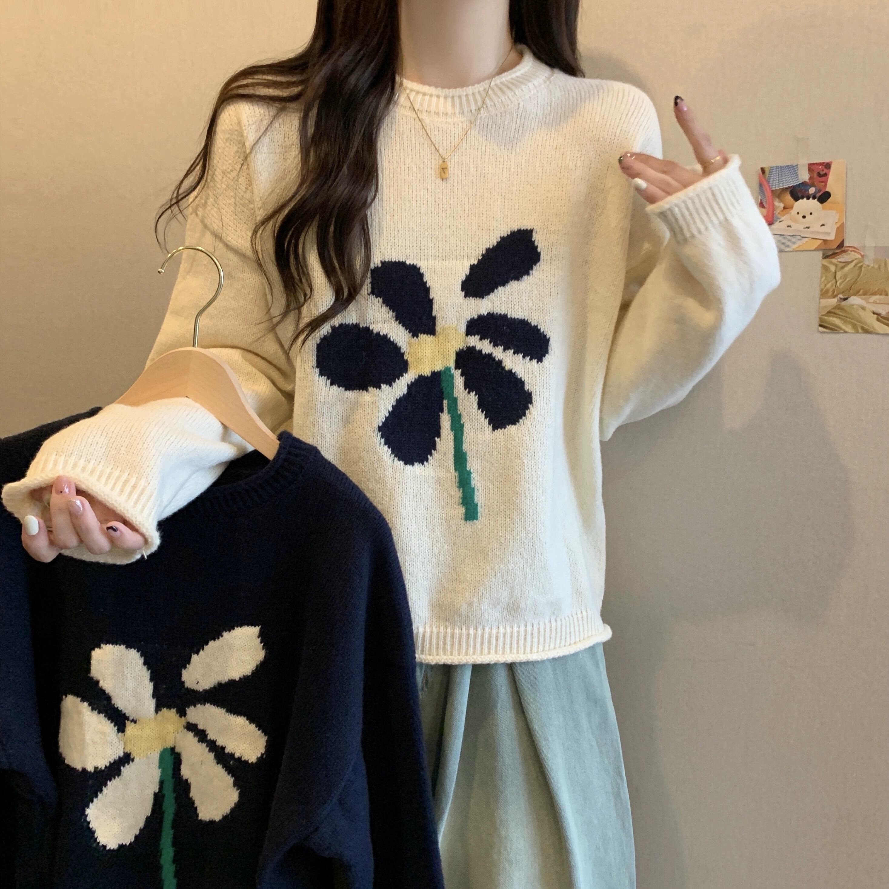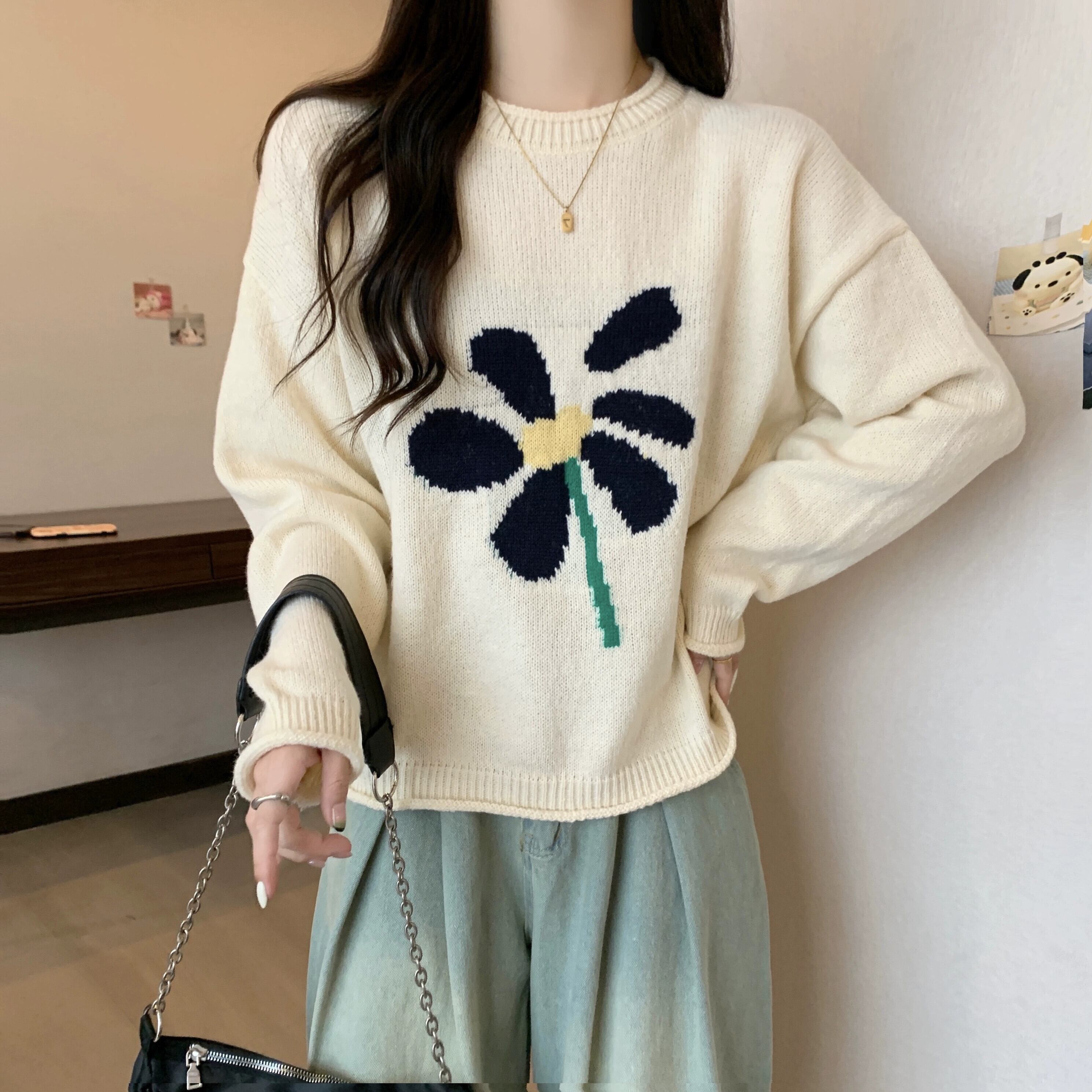 秋と冬の花のラウンドネックショートセーターレディース、ゆったりとしたアウターウェア、怠惰なスタイルのデザイン、長袖インナーボトリングセーター ロング オータム 秋物 ウィンター 冬物 Oネック フラワーデザイン 7460062595567242 | framboise21