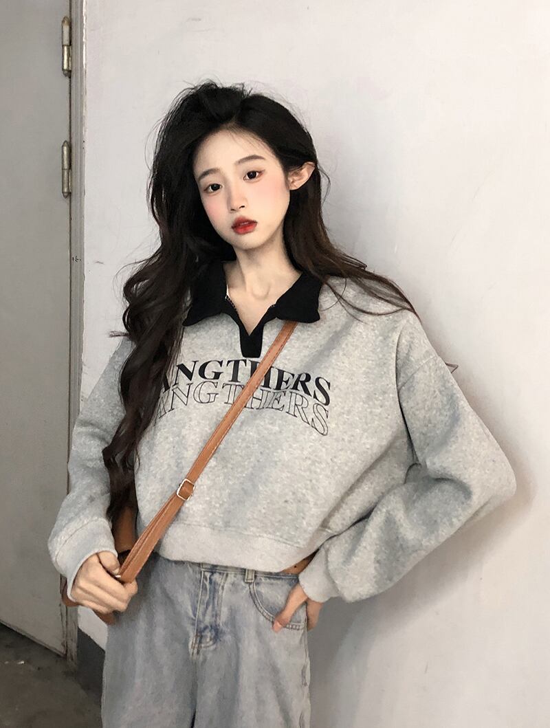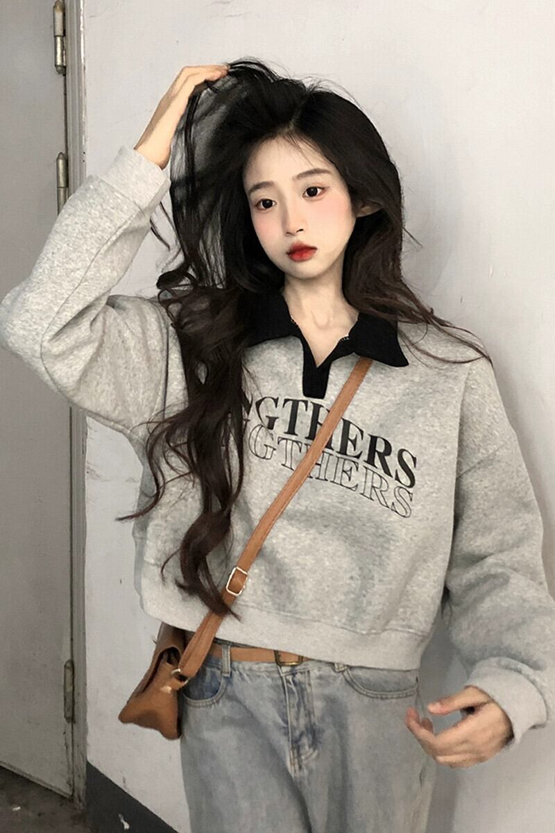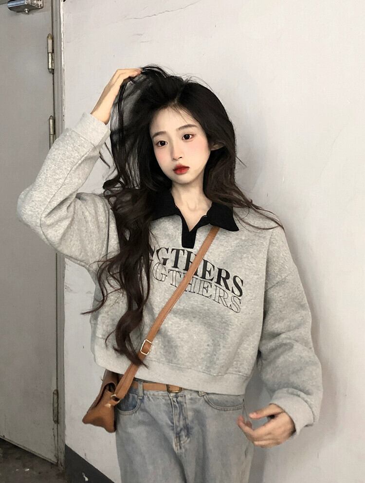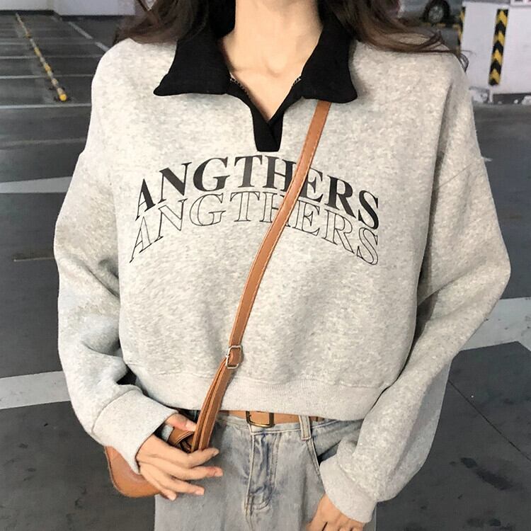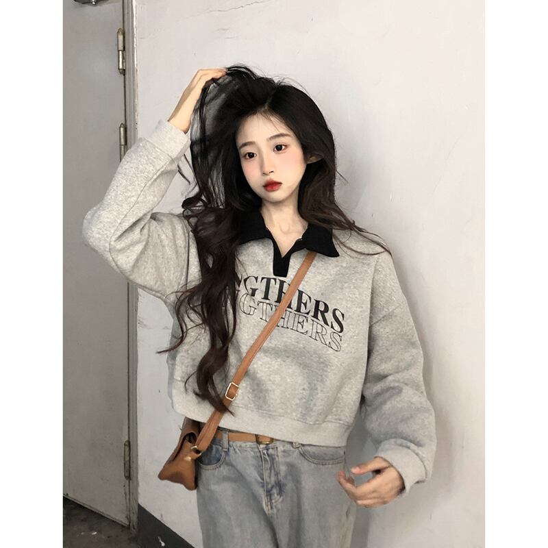 ベルベット肥厚ショートポロカラースウェットシャツ女性の秋と冬アメリカンルーズスタイル多用途プルオーバープリント長袖トップ ロング オータム 秋物 ウィンター 冬物 7460061605344566 | framboise21