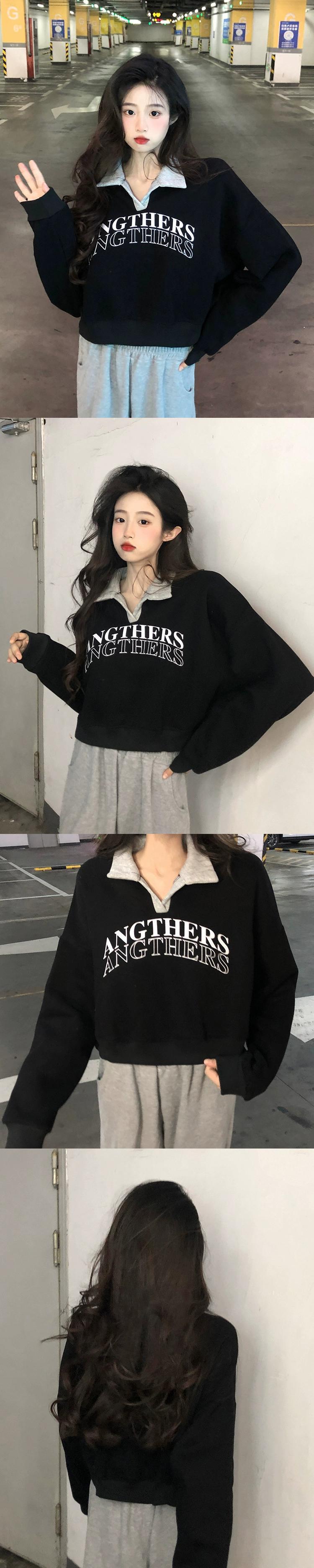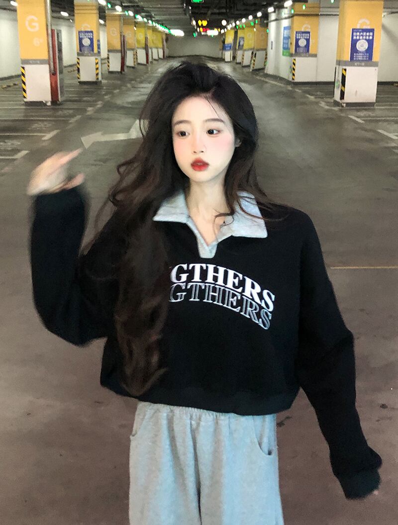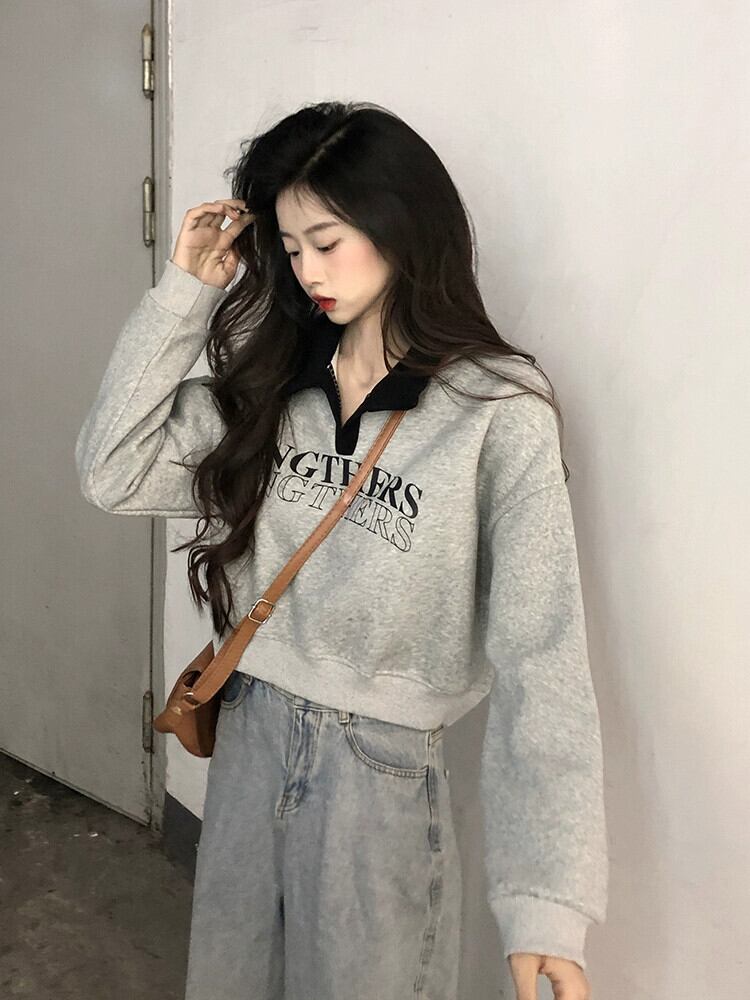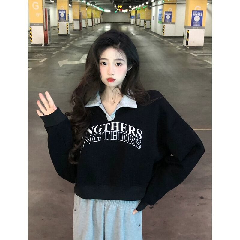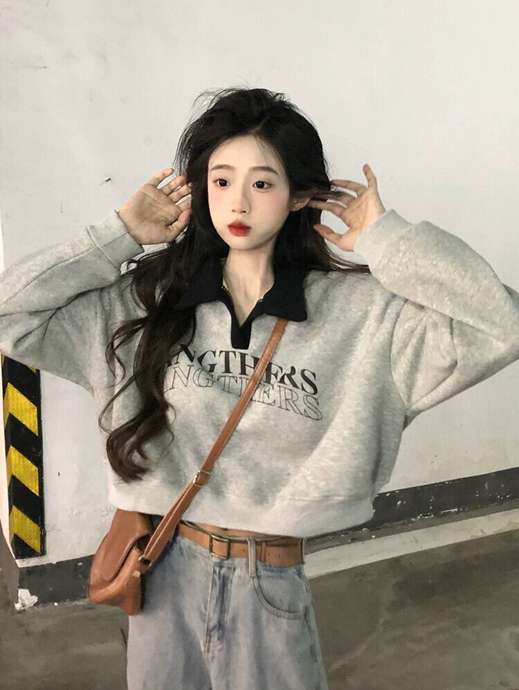ベルベット肥厚ショートポロカラースウェットシャツ女性の秋と冬アメリカンルーズスタイル多用途プルオーバープリント長袖トップ ロング オータム 秋物 ウィンター 冬物 7460061605344566 | framboise21