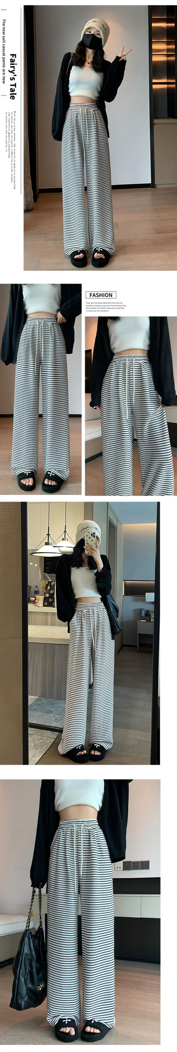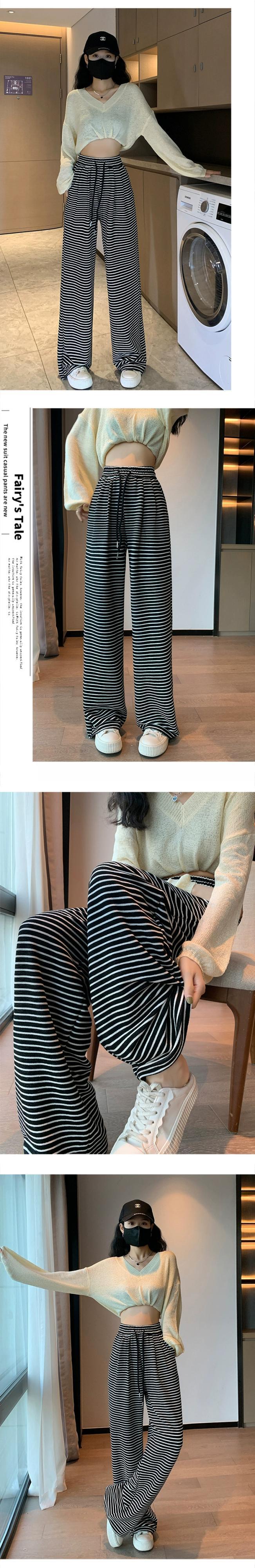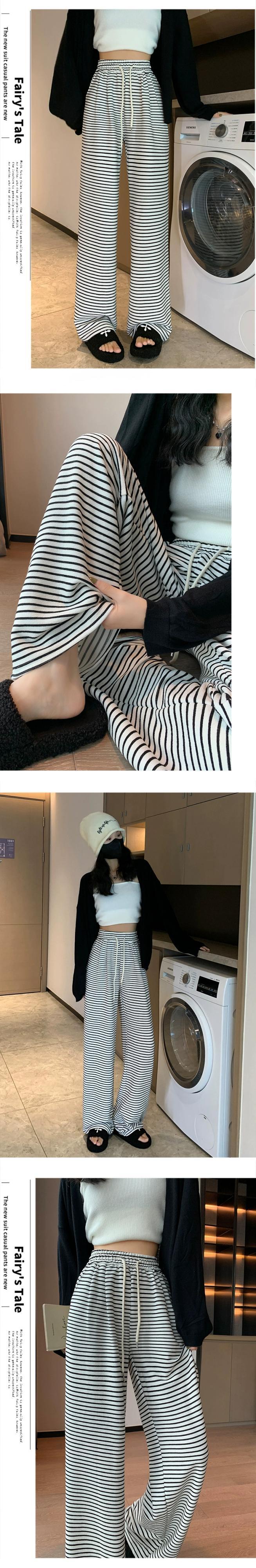 黒と白のストライプの狭いワイドレッグパンツの女性の秋冬 2023 新しいハイウエストドレープウォーキングパンツルーズストレートカジュアルパンツ ホワイト ブラック オータム 秋物 ウィンター 冬物 7460018987867053 | framboise21