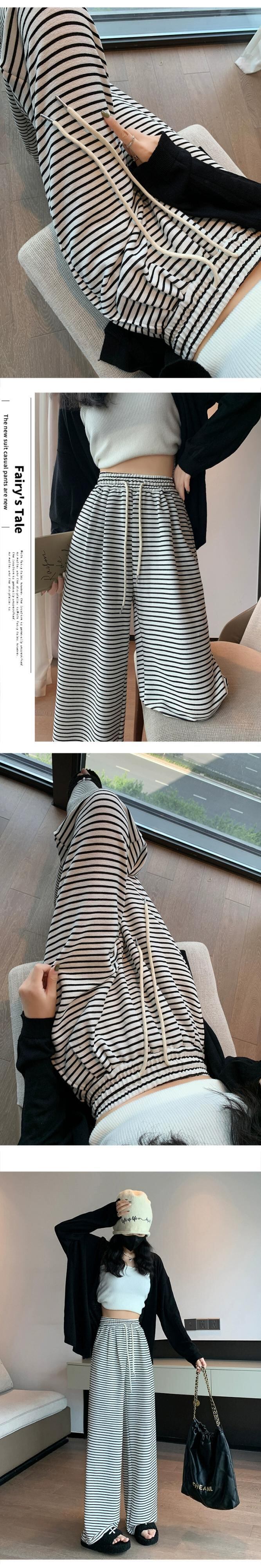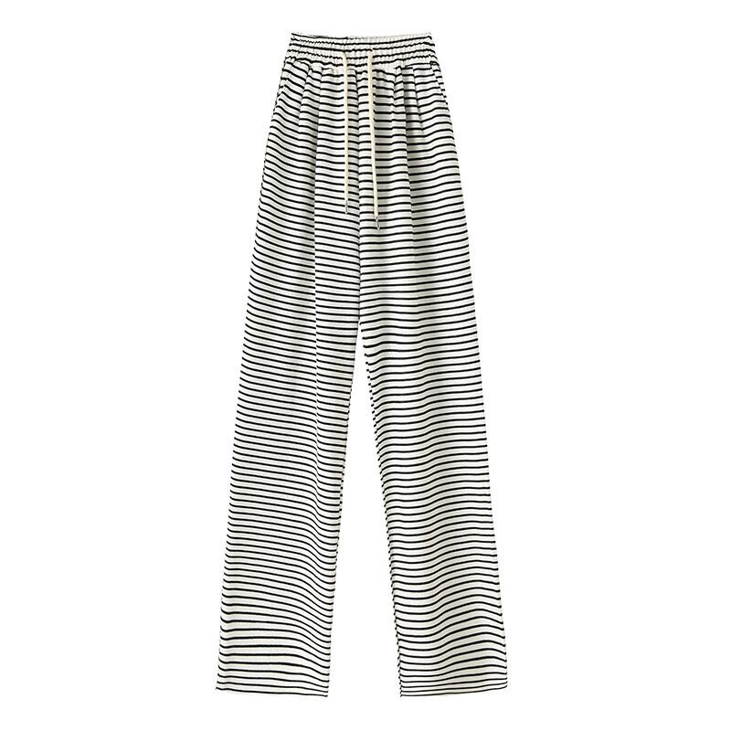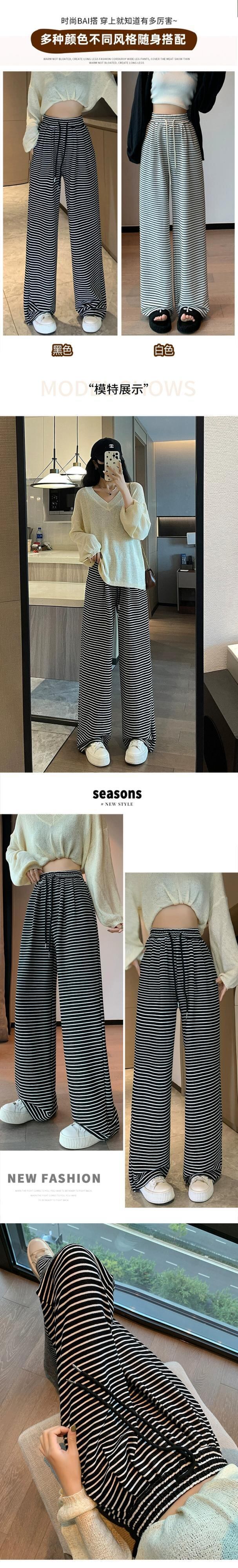 黒と白のストライプの狭いワイドレッグパンツの女性の秋冬 2023 新しいハイウエストドレープウォーキングパンツルーズストレートカジュアルパンツ ホワイト ブラック オータム 秋物 ウィンター 冬物 7460018987867053 | framboise21