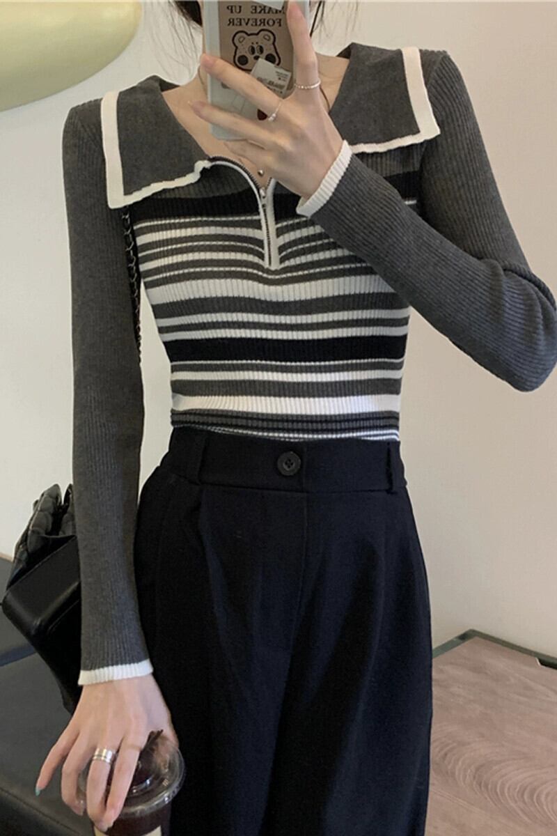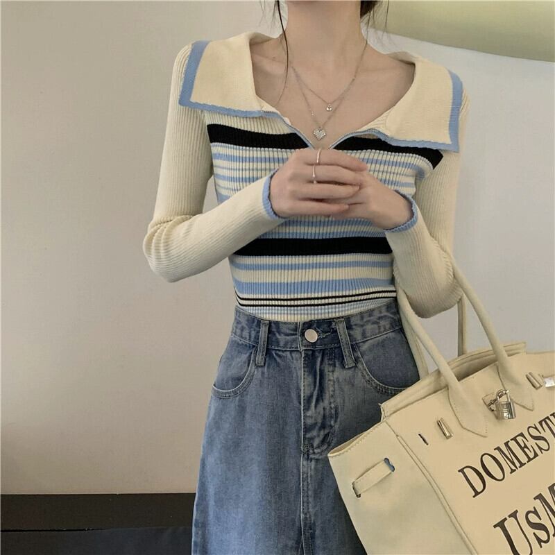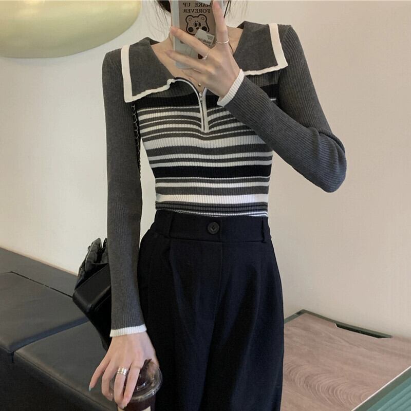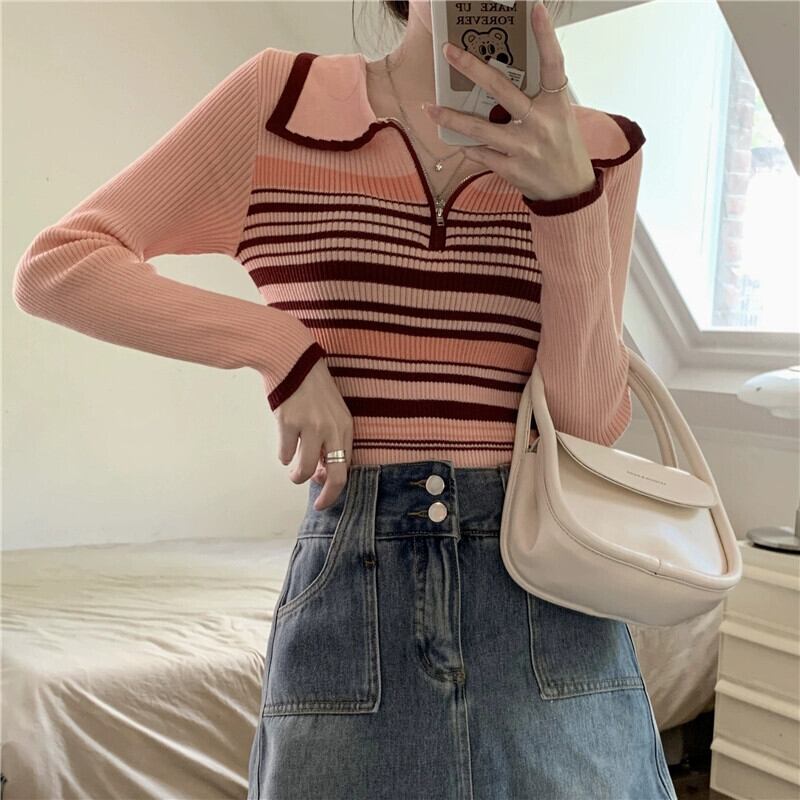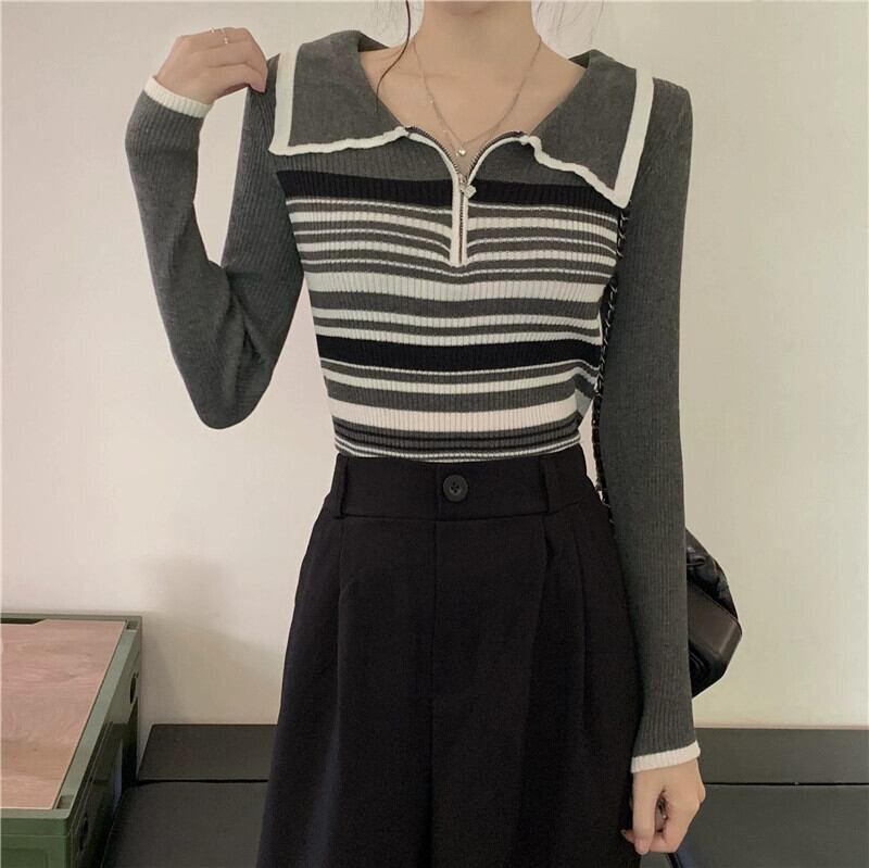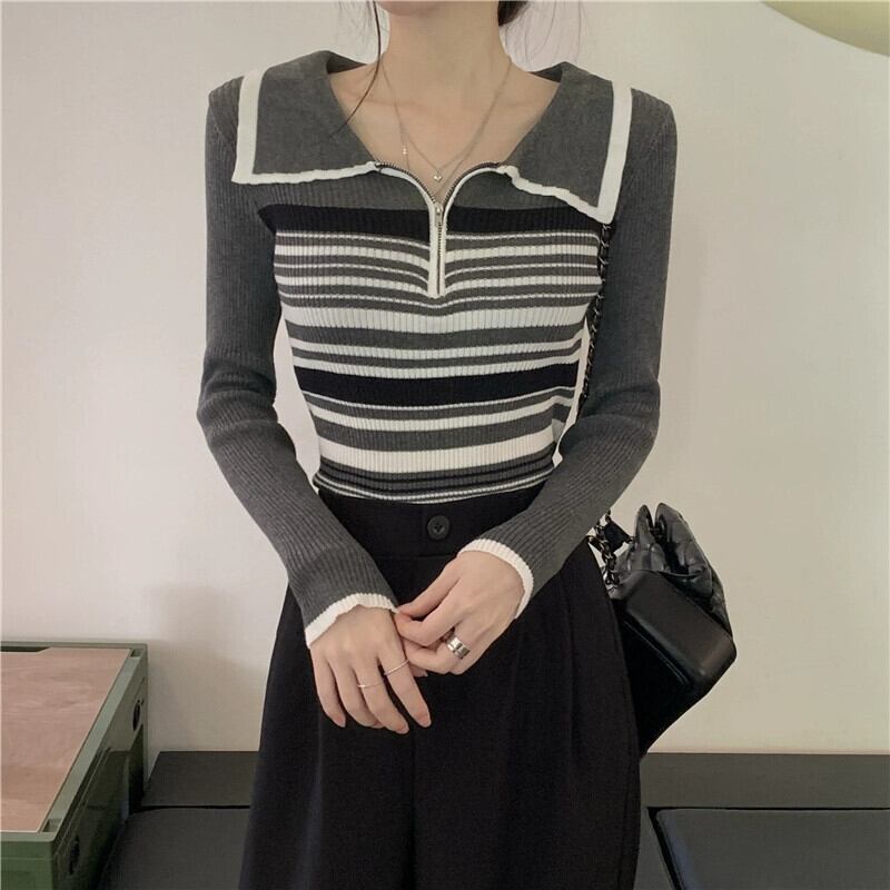 秋冬のストライプのポロカラーボトリングシャツレディース。ウエスタンスタイルの長袖セーターを備えたスリムショートセーター。 ロング オータム 秋物 ウィンター 冬物 7460027029333776 | framboise21