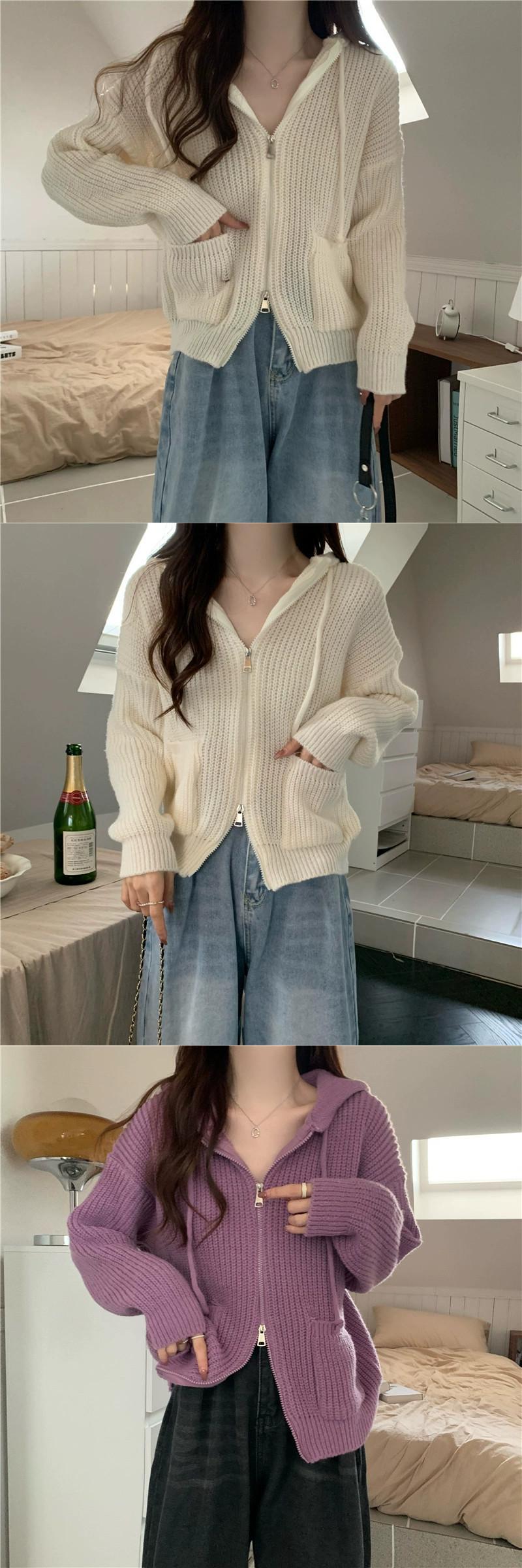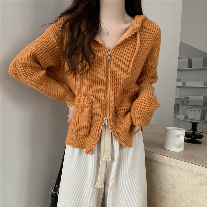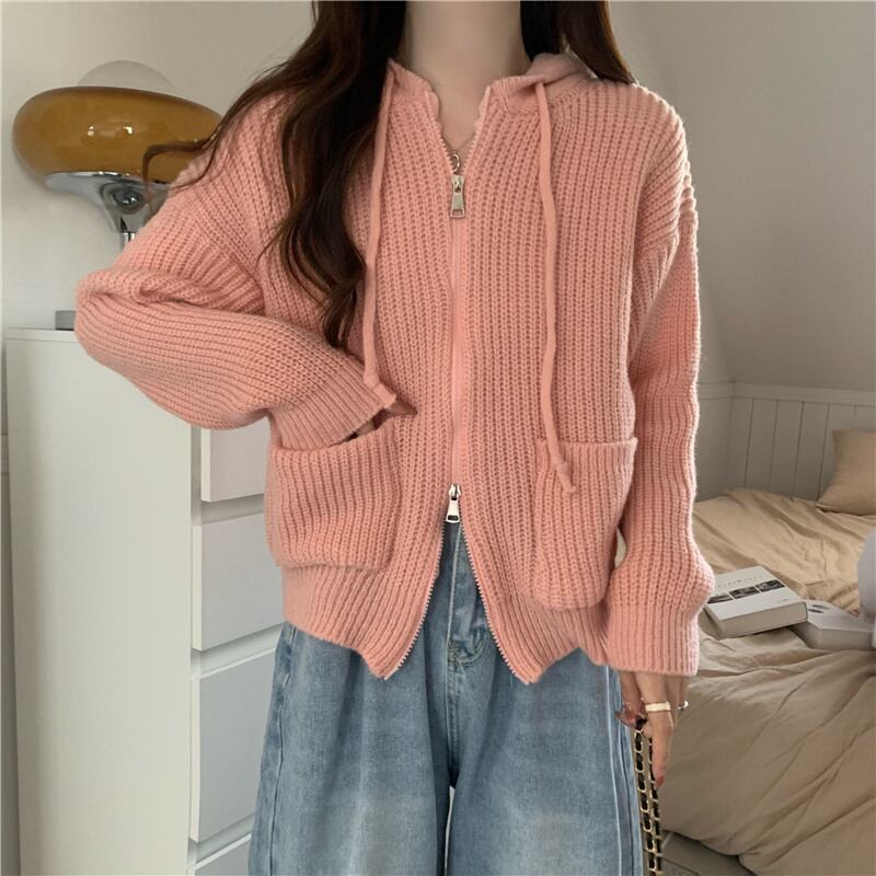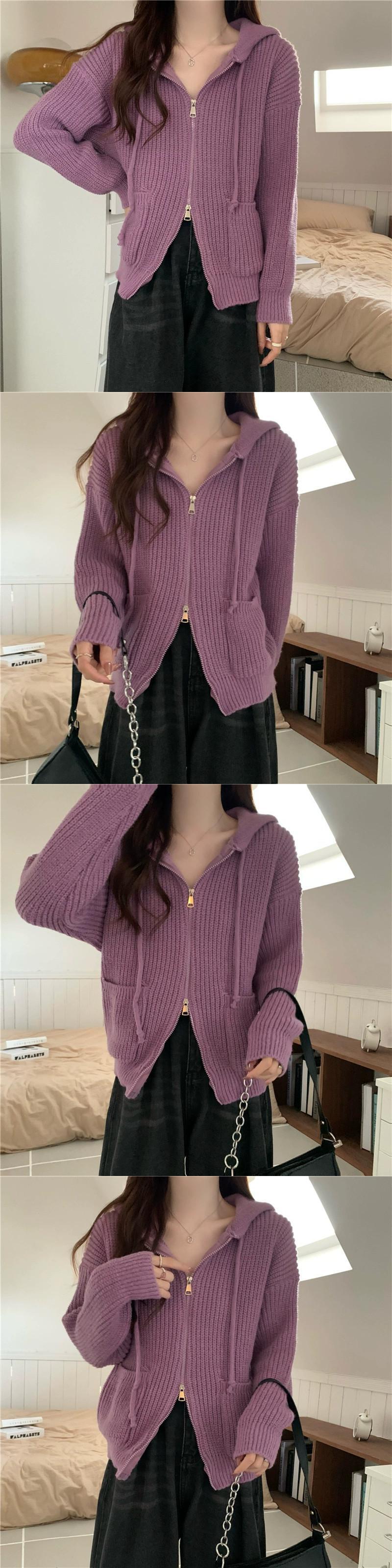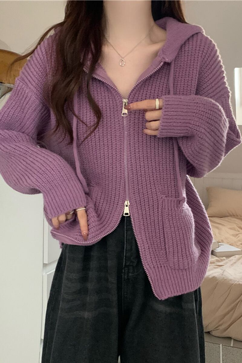 紫色のジッパーフード付きカーディガンセータージャケット女性秋と冬のレトロな優しいルーズアウターウェア怠惰なスタイルニットセーター オータム 秋物 ウィンター 冬物 パープル 7460068409403976 | framboise21