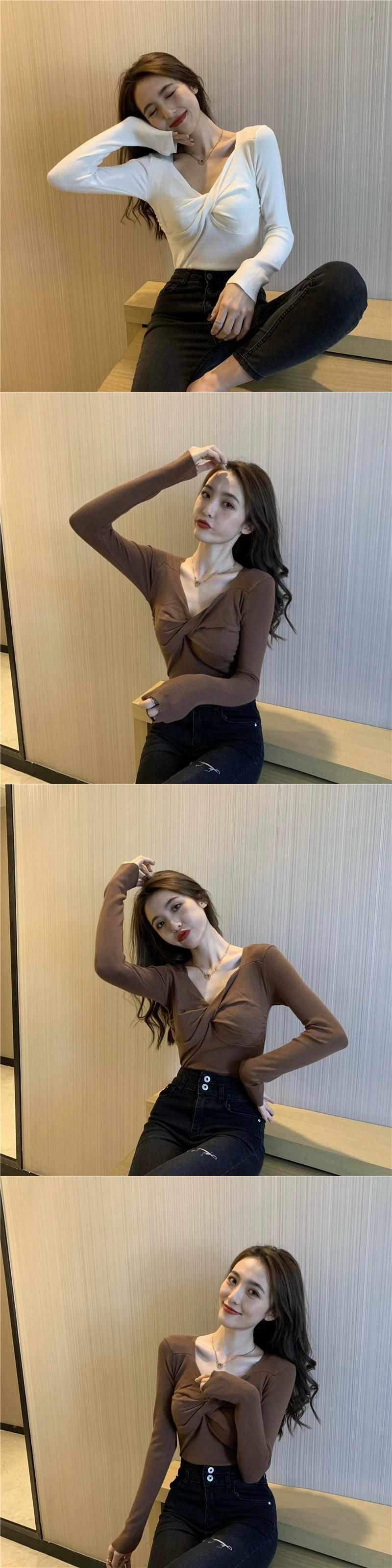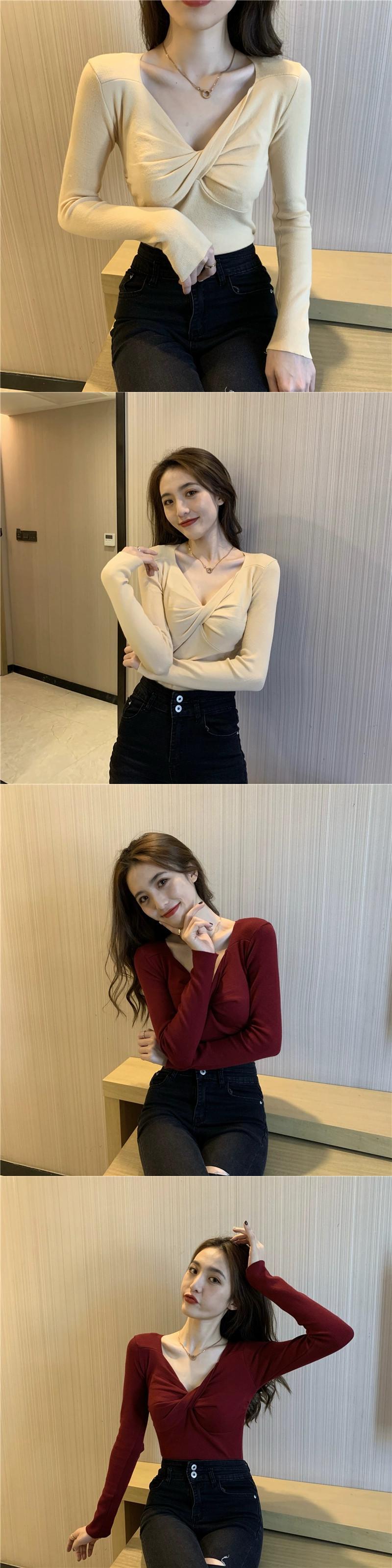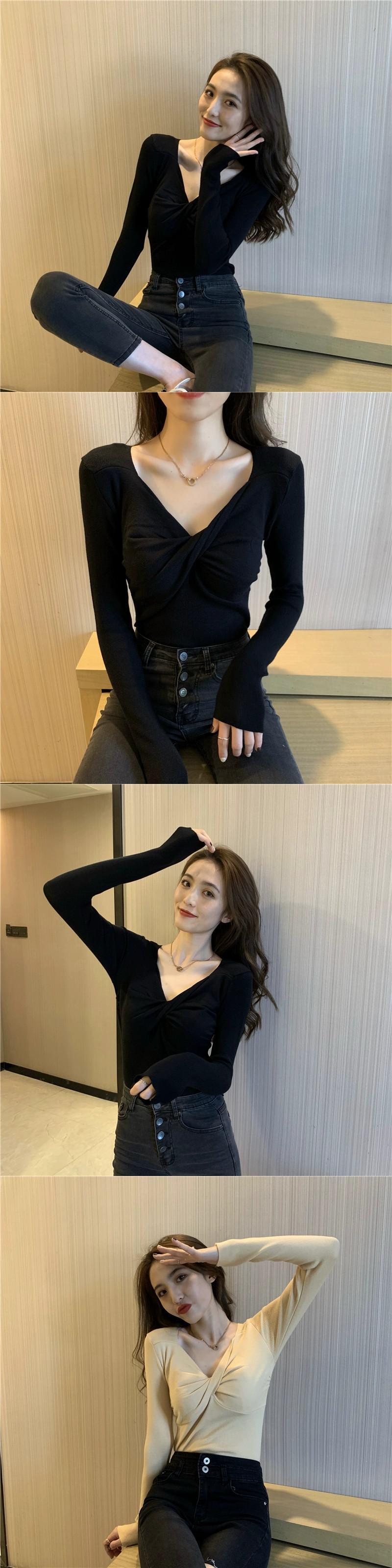 ブラウンセクシーなクロス v ネックニットボトミングシャツ 2023 新しい女性の秋と冬のタイトフィットインナー長袖ローネックセーター ロング オータム 秋物 ウィンター 冬物 Vネック 7460039151173701 | framboise21