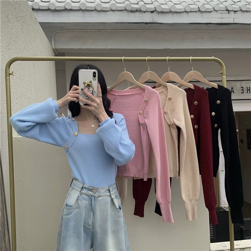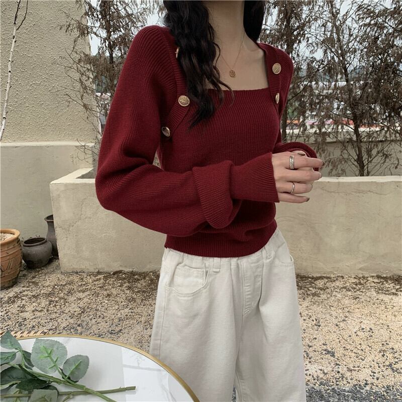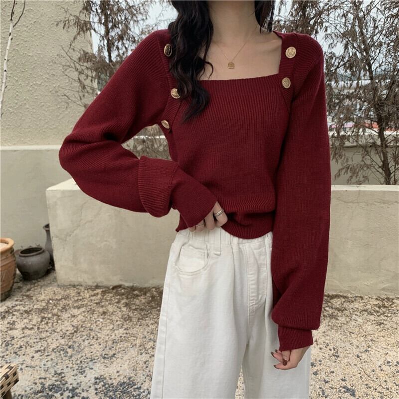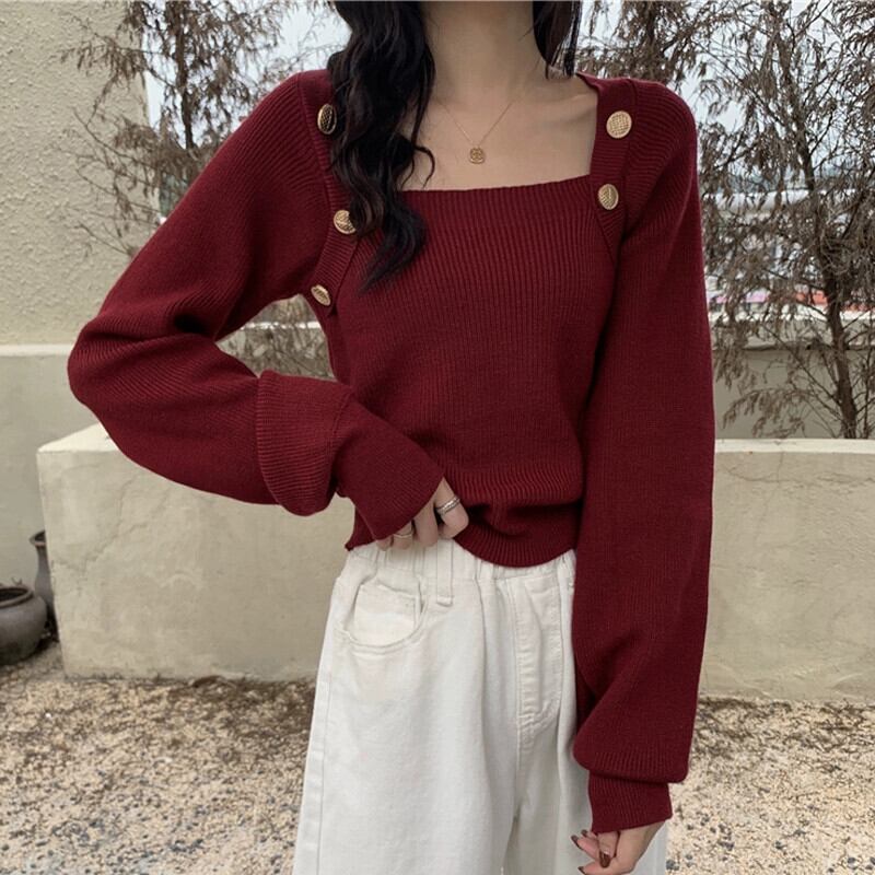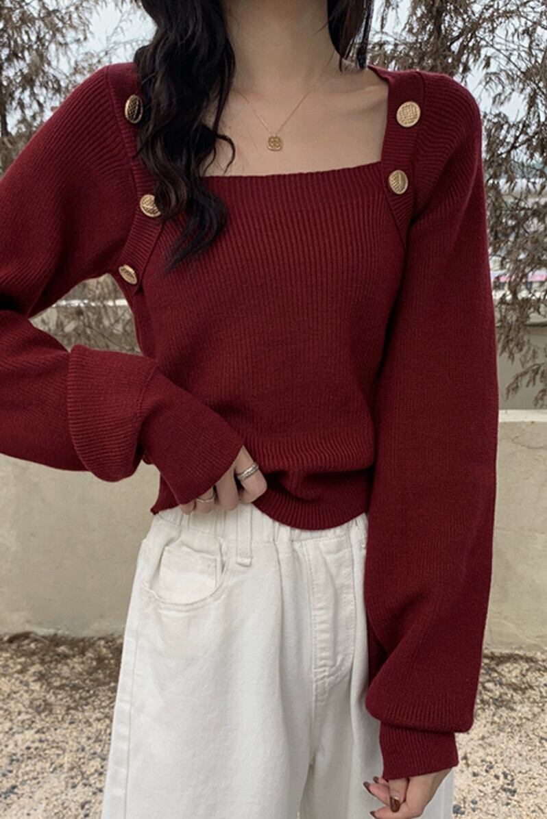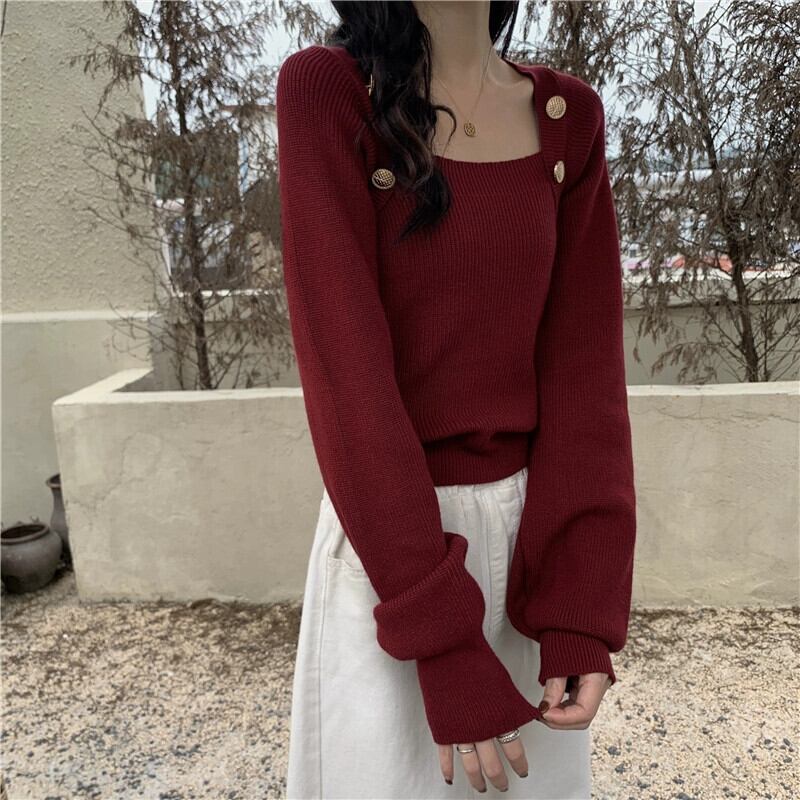 秋冬のブルゴーニュのスクエアネックボトリングシャツレディース、スリムなショートニットセーター付きのハイエンドランタンスリーブセーター オータム 秋物 ウィンター 冬物 スクウェア 7460078836217847 | framboise21