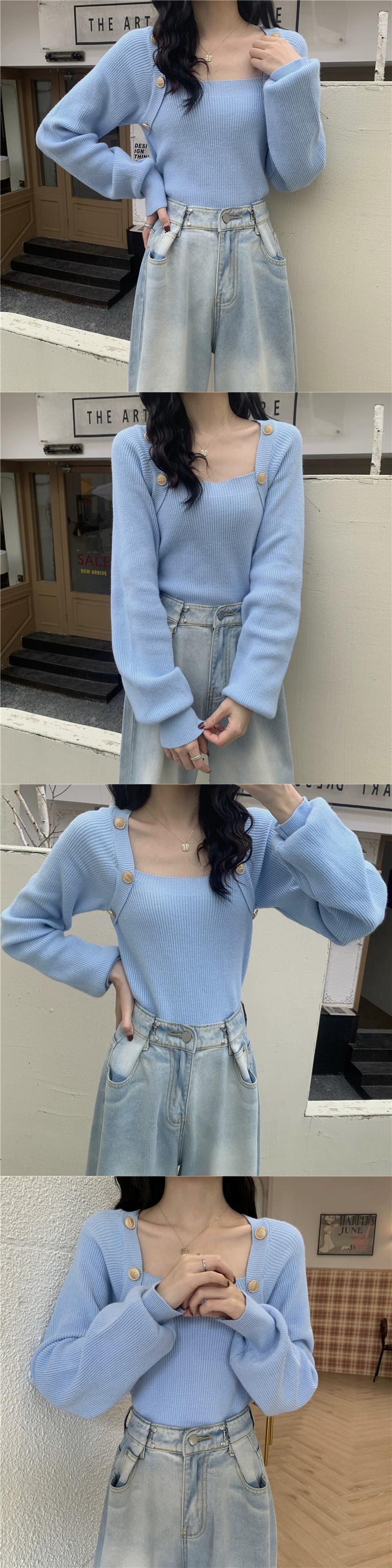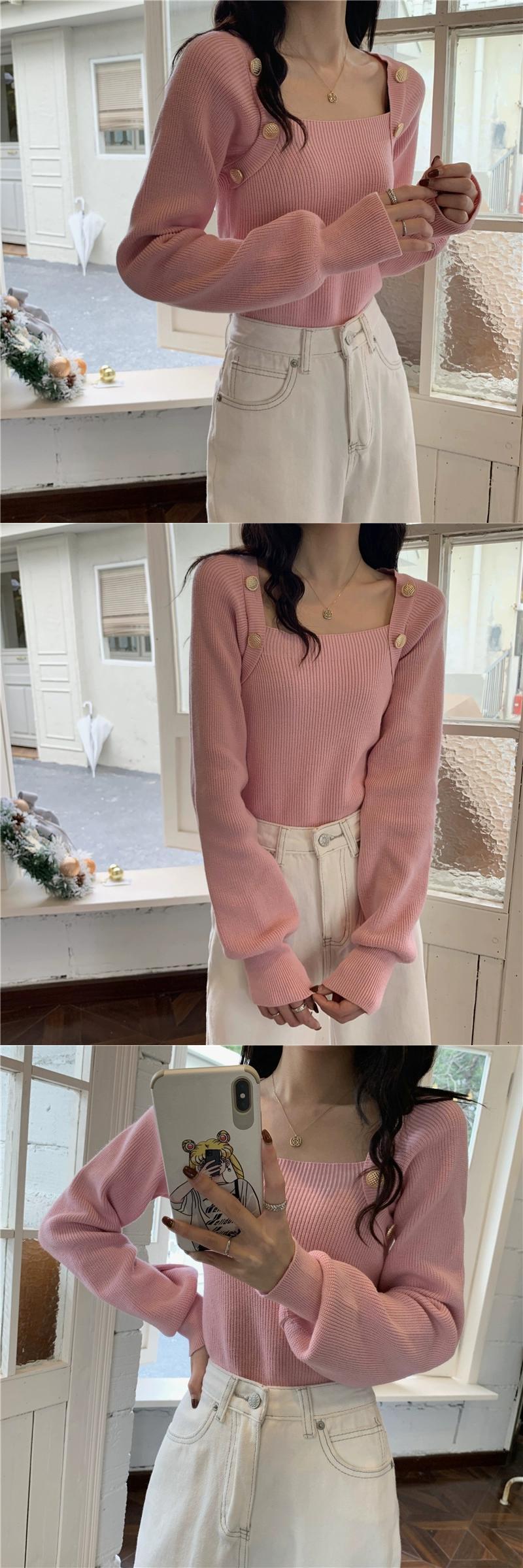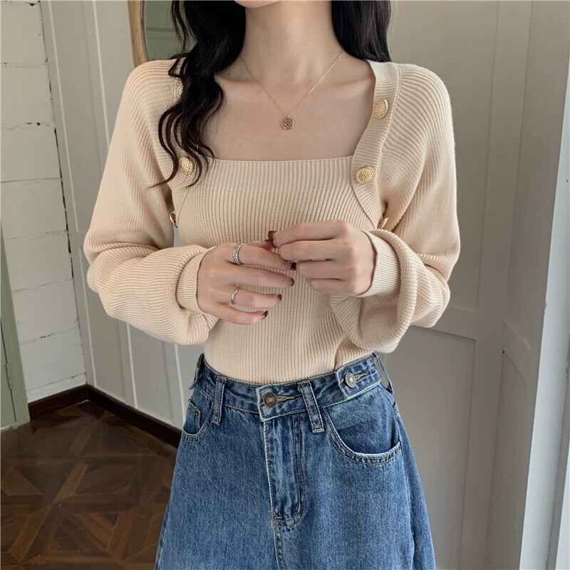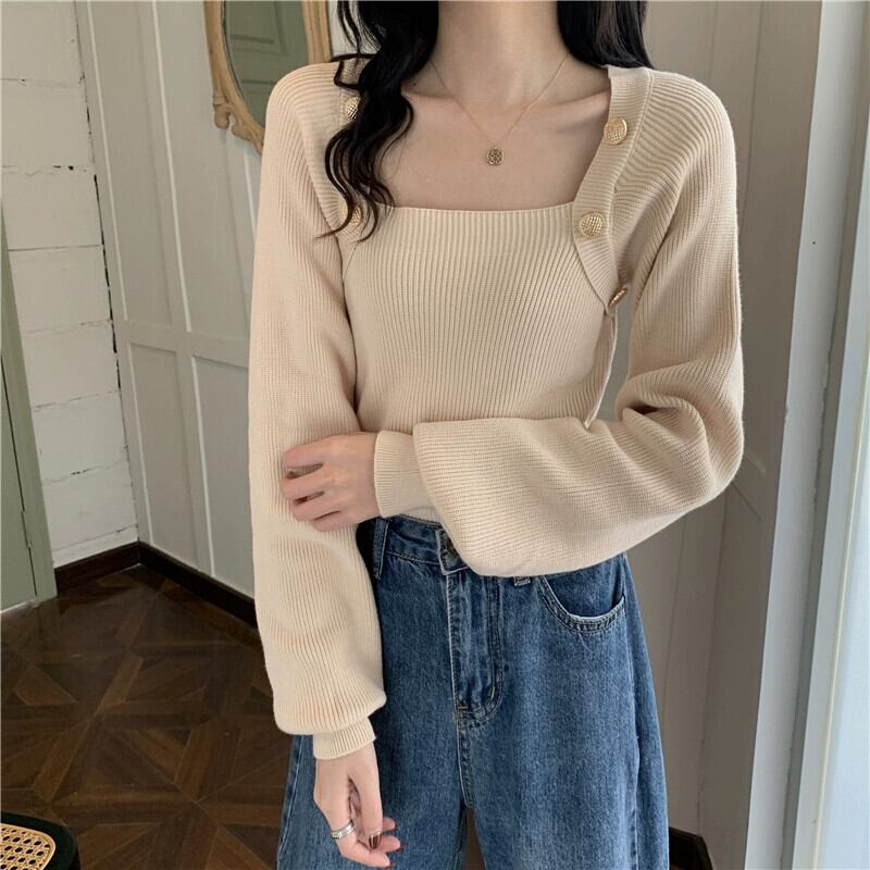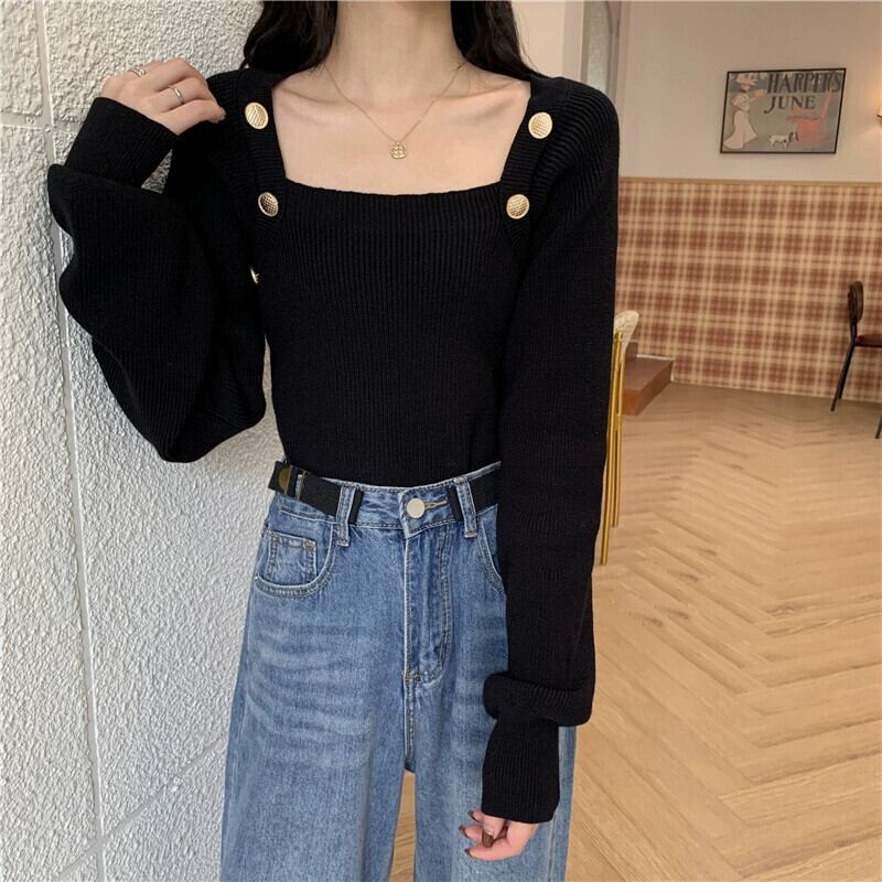 秋冬のブルゴーニュのスクエアネックボトリングシャツレディース、スリムなショートニットセーター付きのハイエンドランタンスリーブセーター オータム 秋物 ウィンター 冬物 スクウェア 7460078836217847 | framboise21