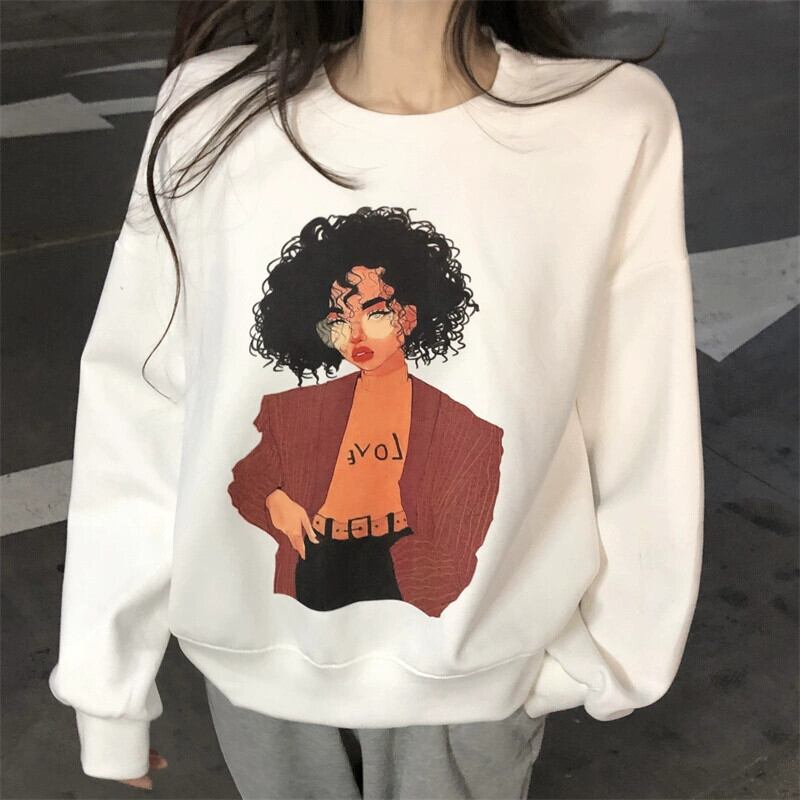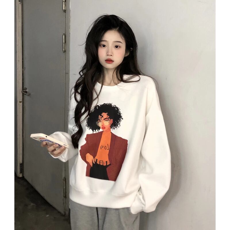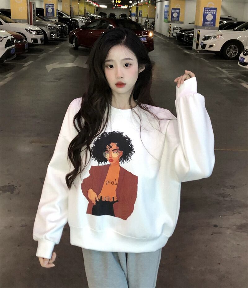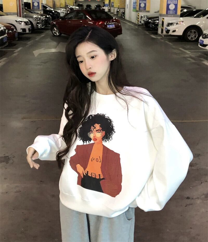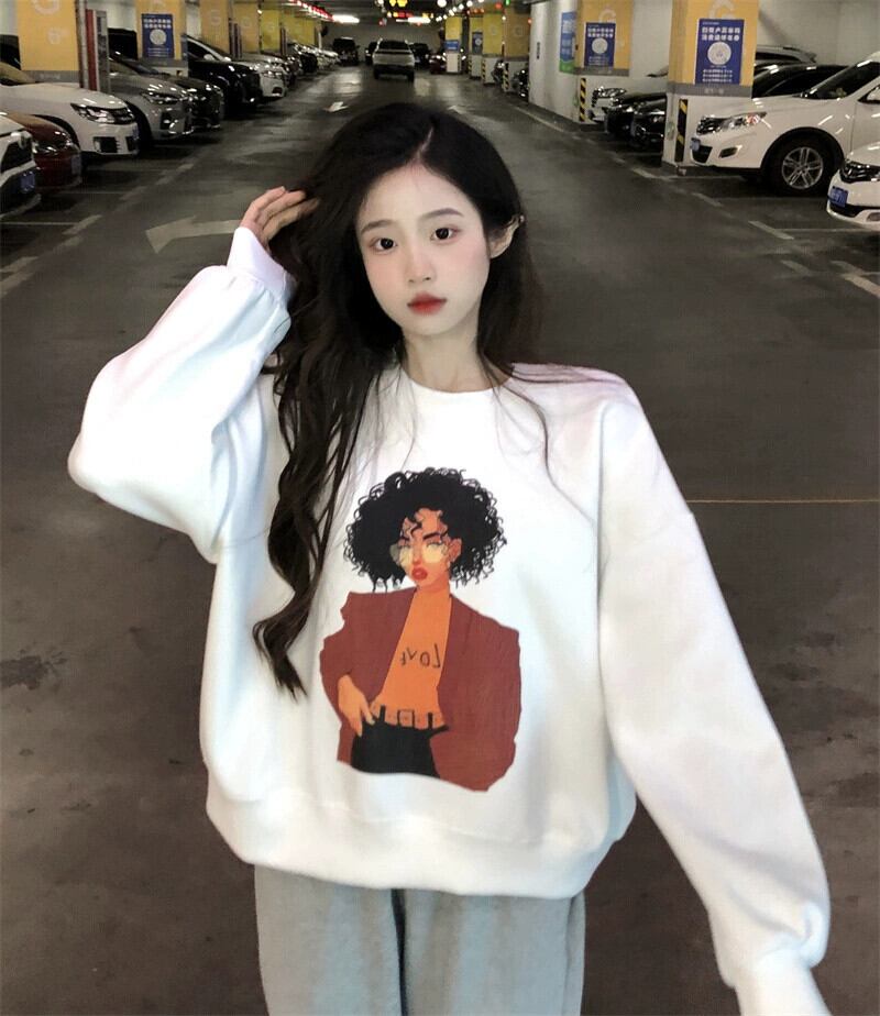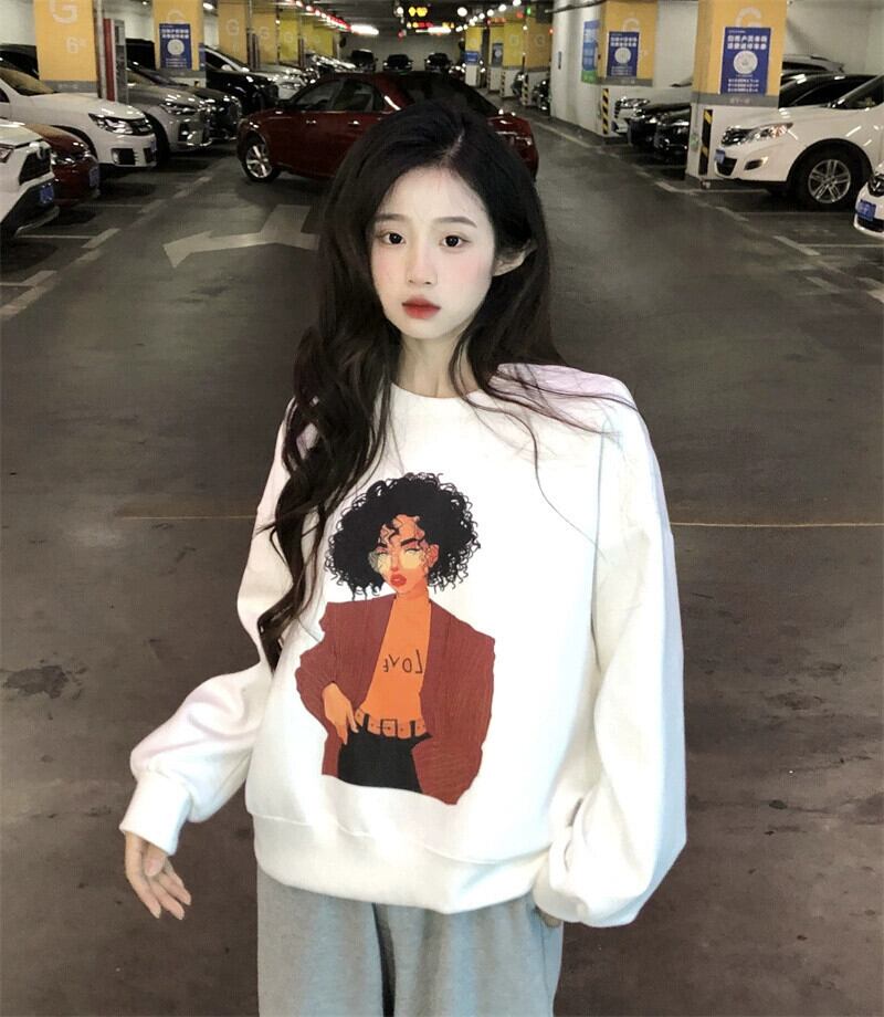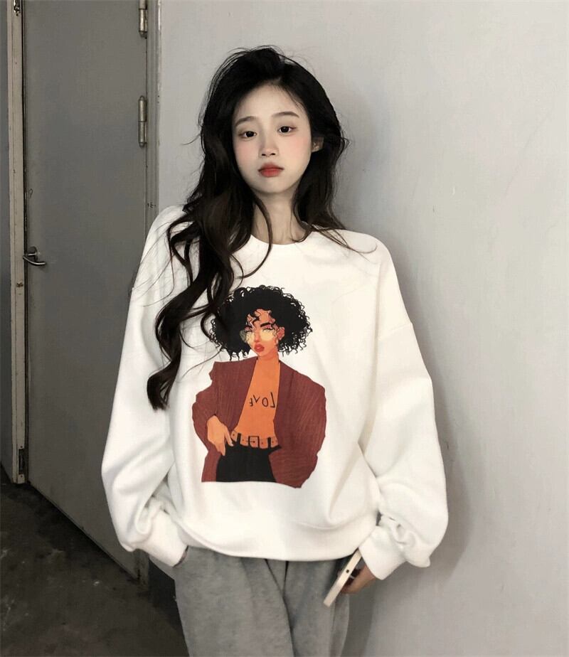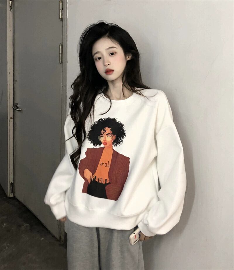 秋と冬のオーバーサイズのミッドレングスのピュアコットンスウェットシャツの女性、ルーズで怠惰なスタイル、多用途のプルオーバー、フードレスプリントトップ オータム 秋物 ウィンター 冬物 7460049042370501 | framboise21