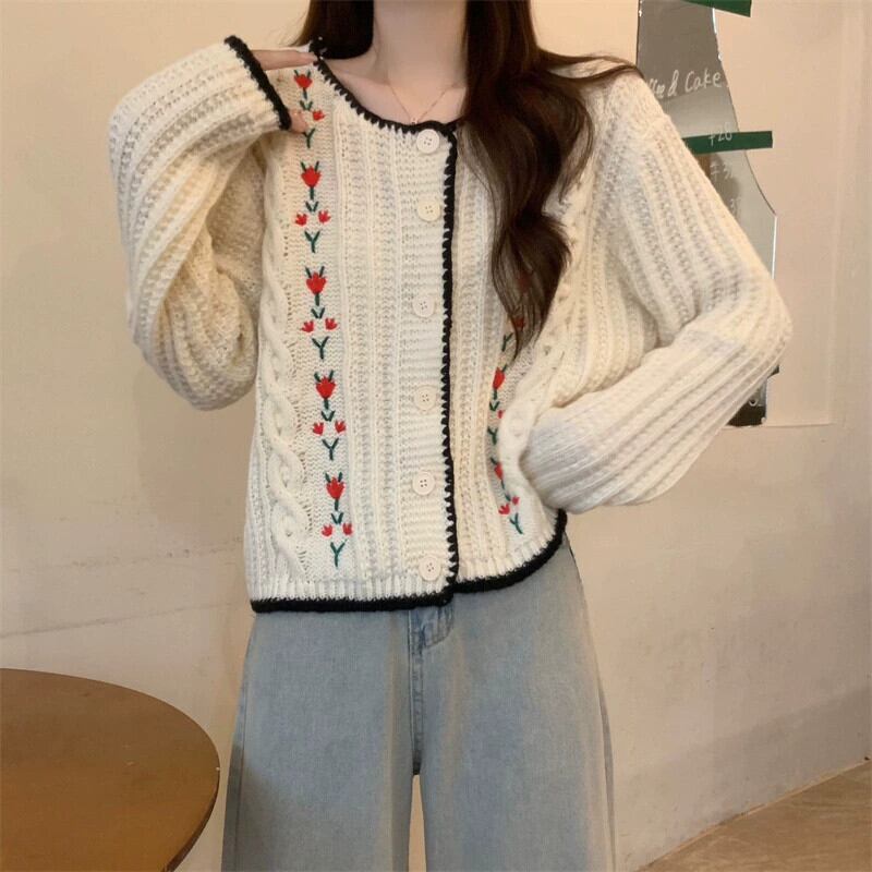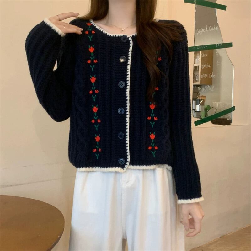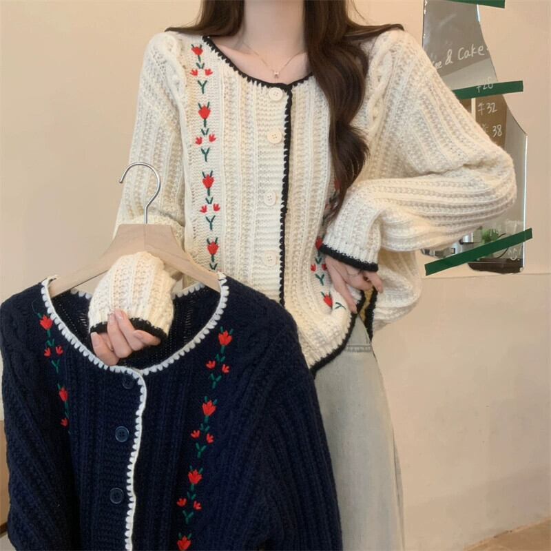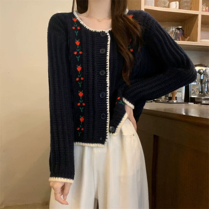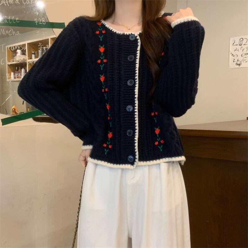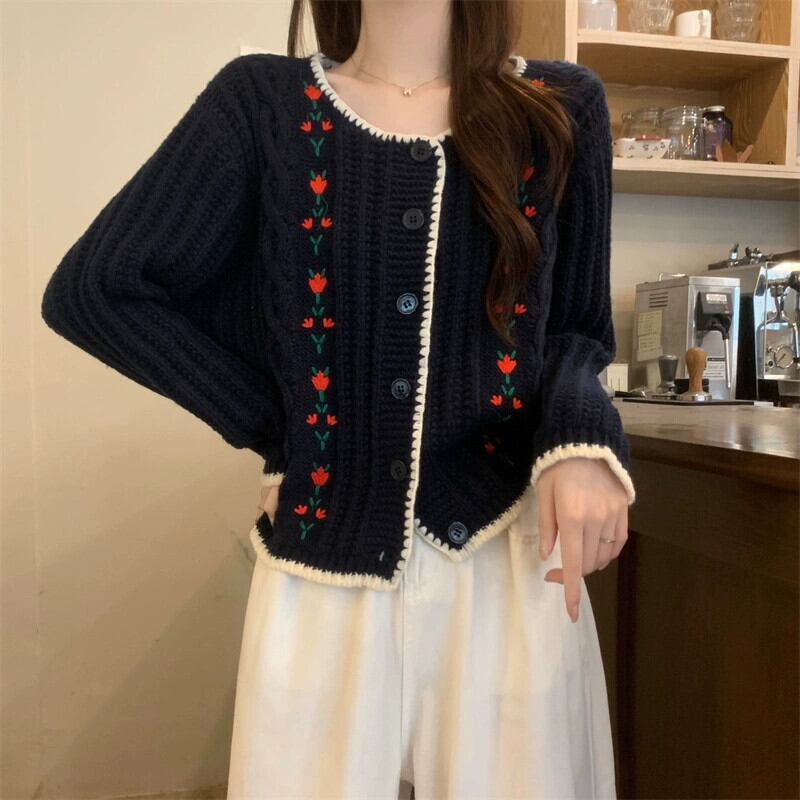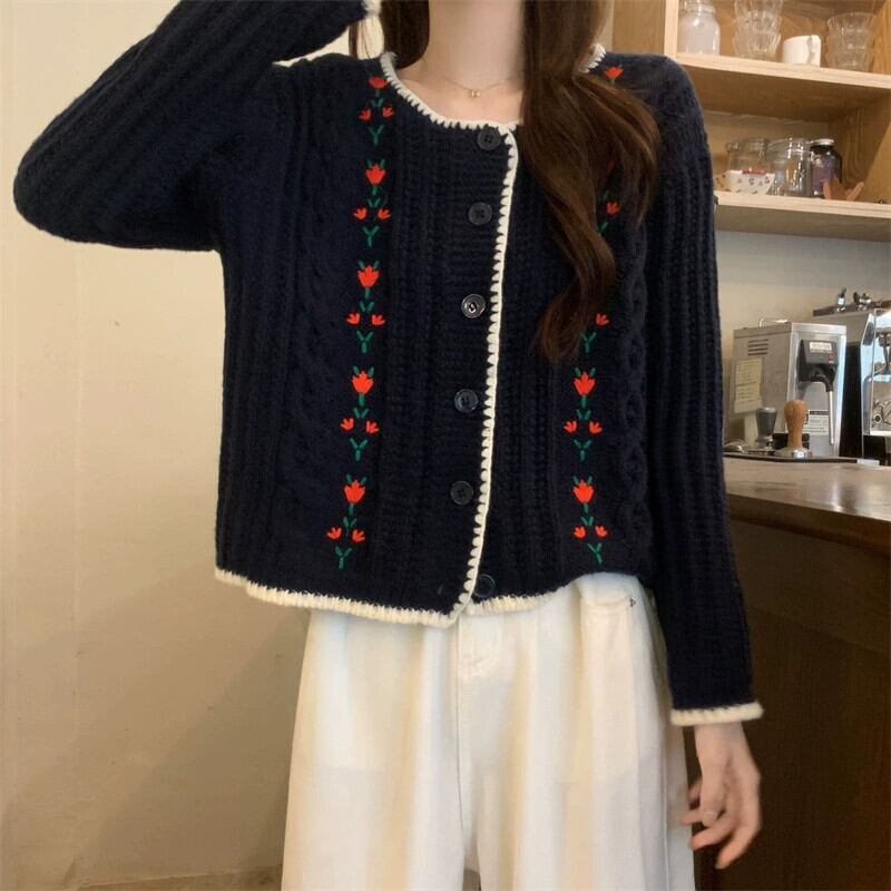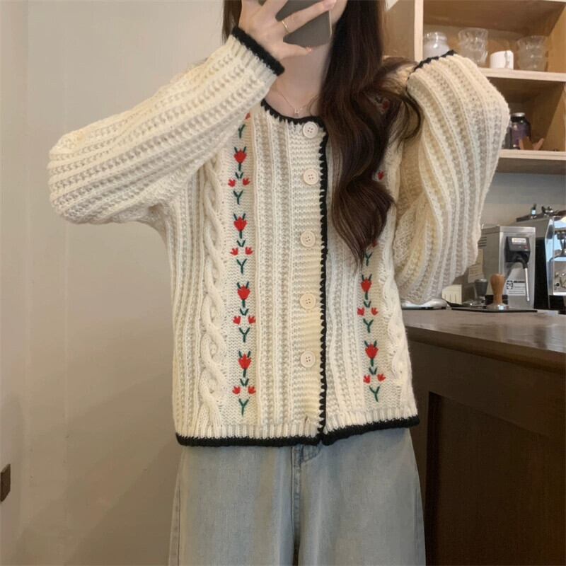 刺繍ショートツイストカーディガンセータージャケット女性の秋と冬のアウタールーズレイジースタイルラウンドネック長袖ニットセーター ロング レッド オータム 秋物 ウィンター 冬物 Oネック 7460057802381564 | framboise21
