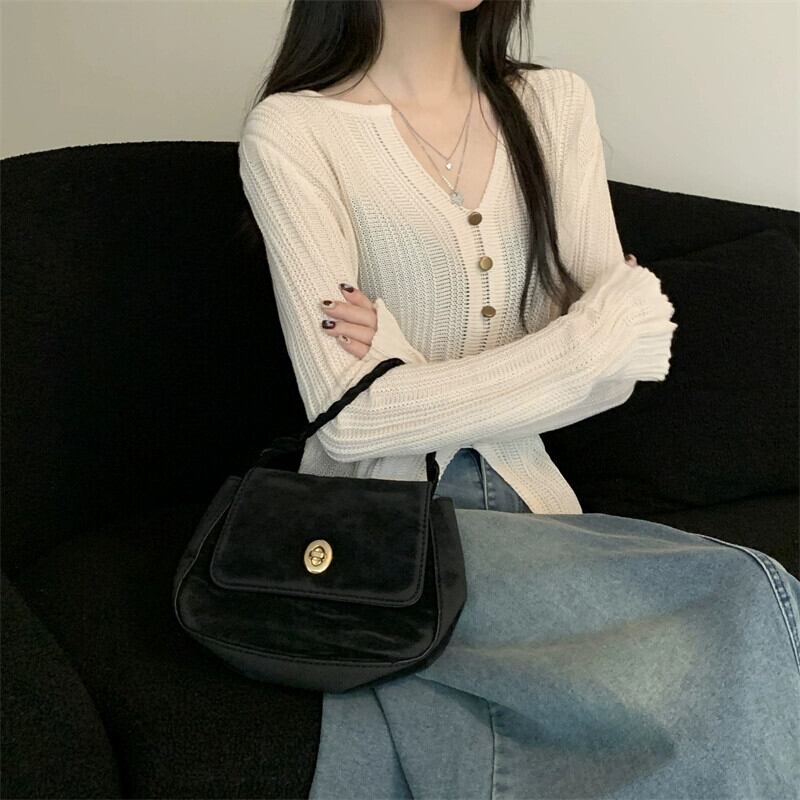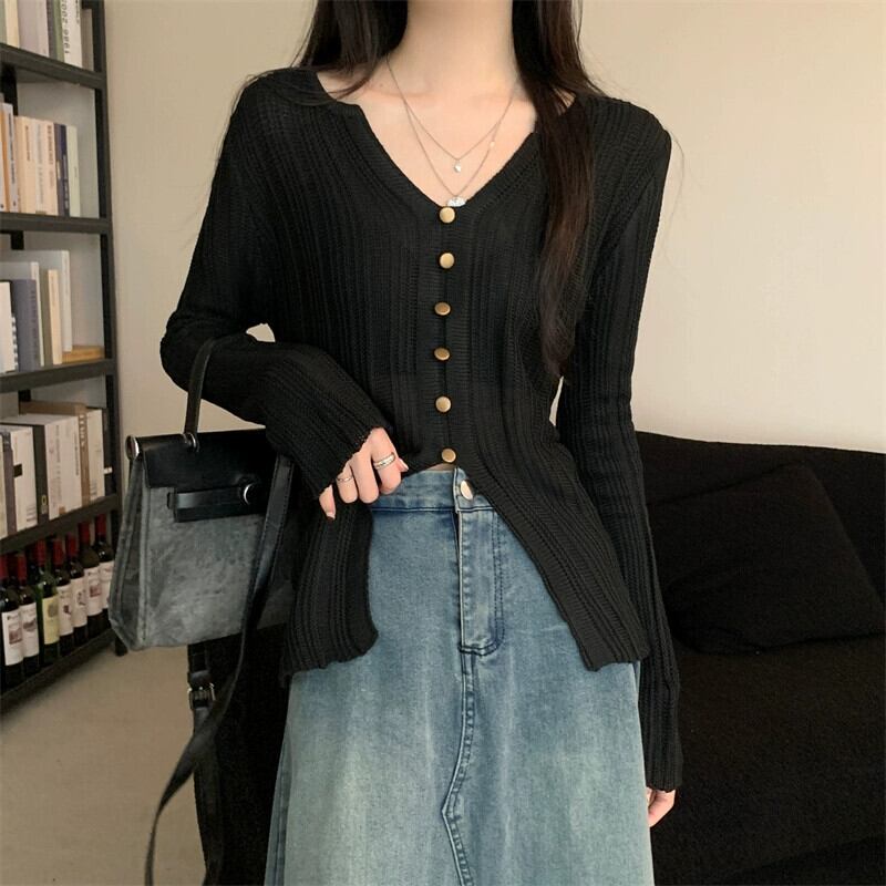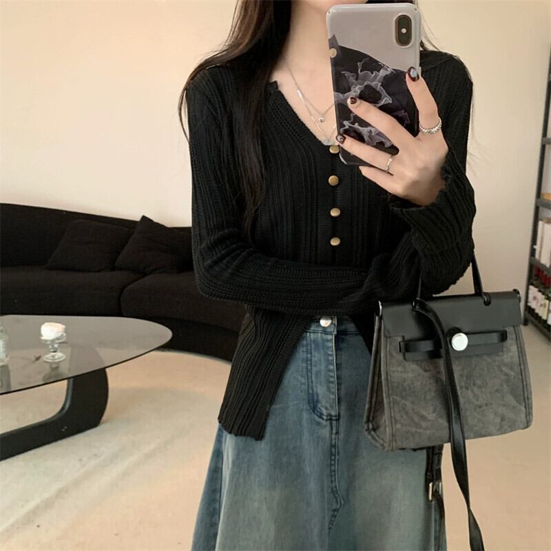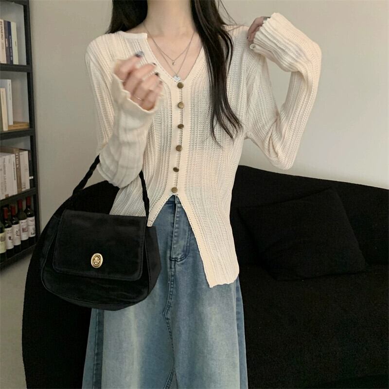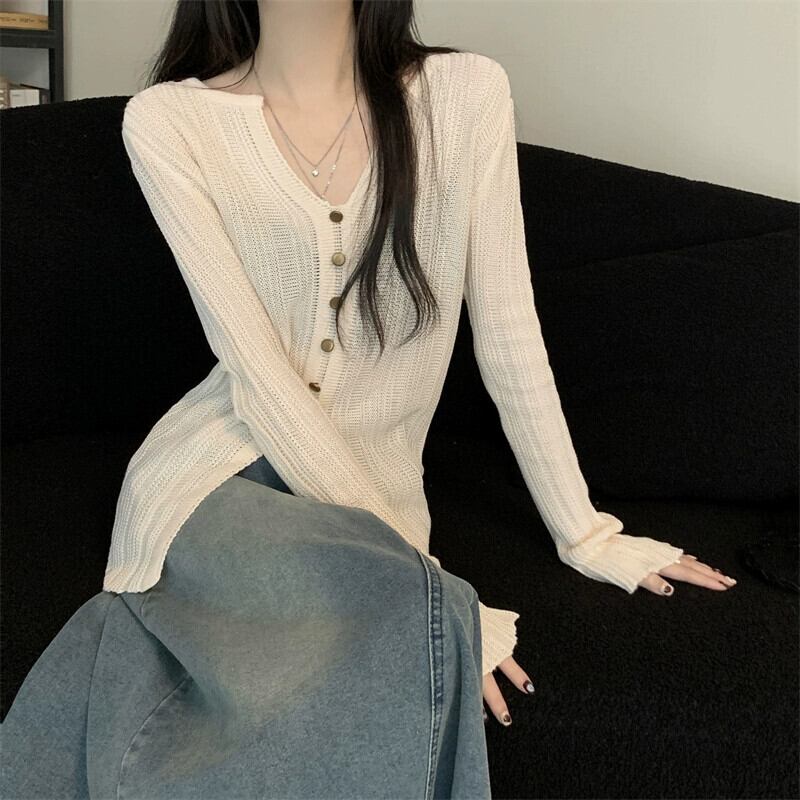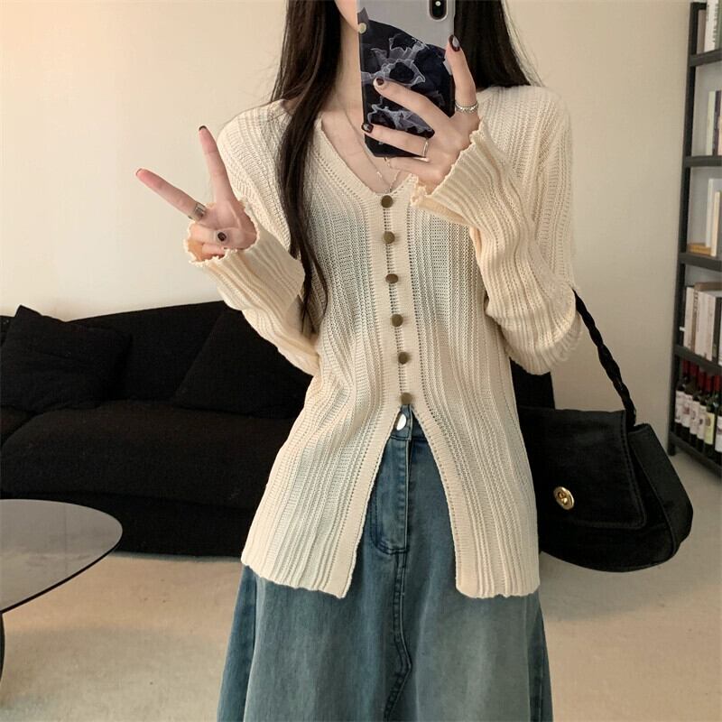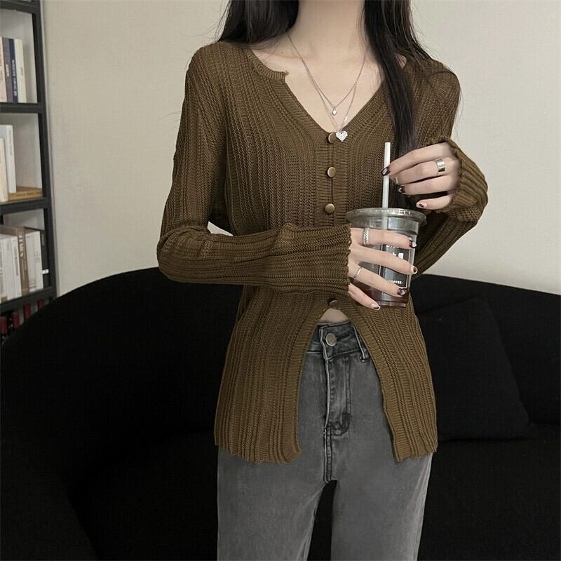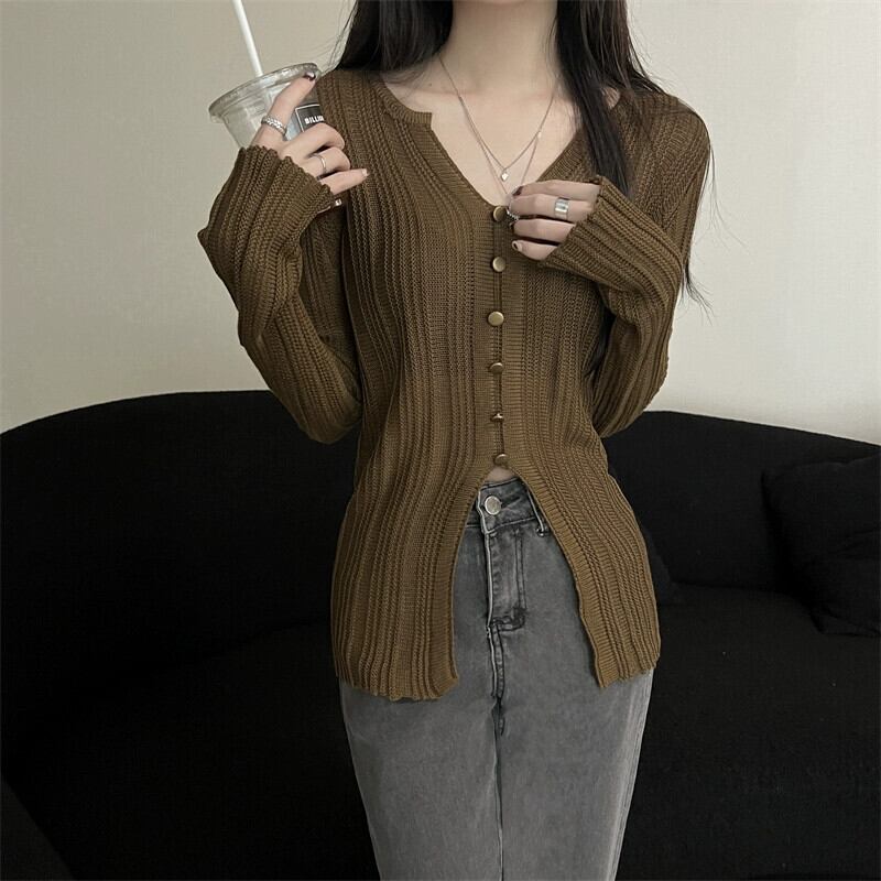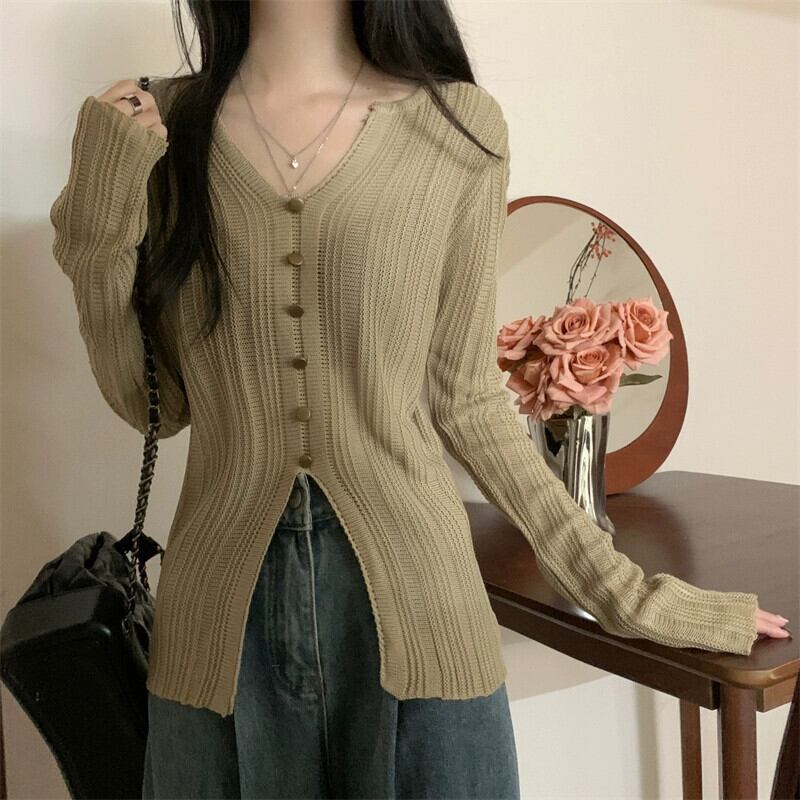 秋冬の不規則なVネックニットカーディガンレディース、ファッショナブルでスリムフィットのインナーレイヤード長袖スリットトップス ロング レッド オータム 秋物 ウィンター 冬物 7460013279066846 | framboise21