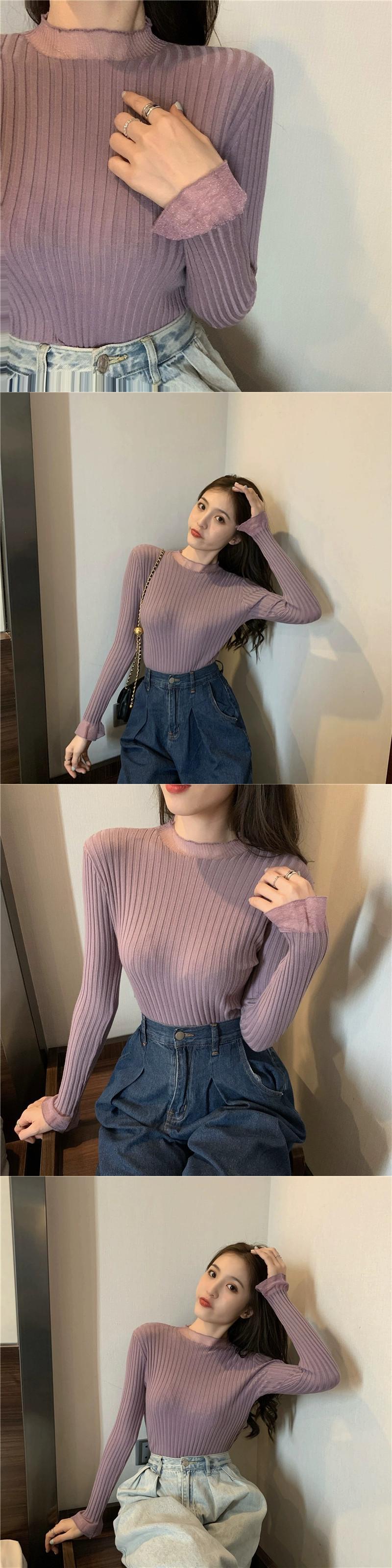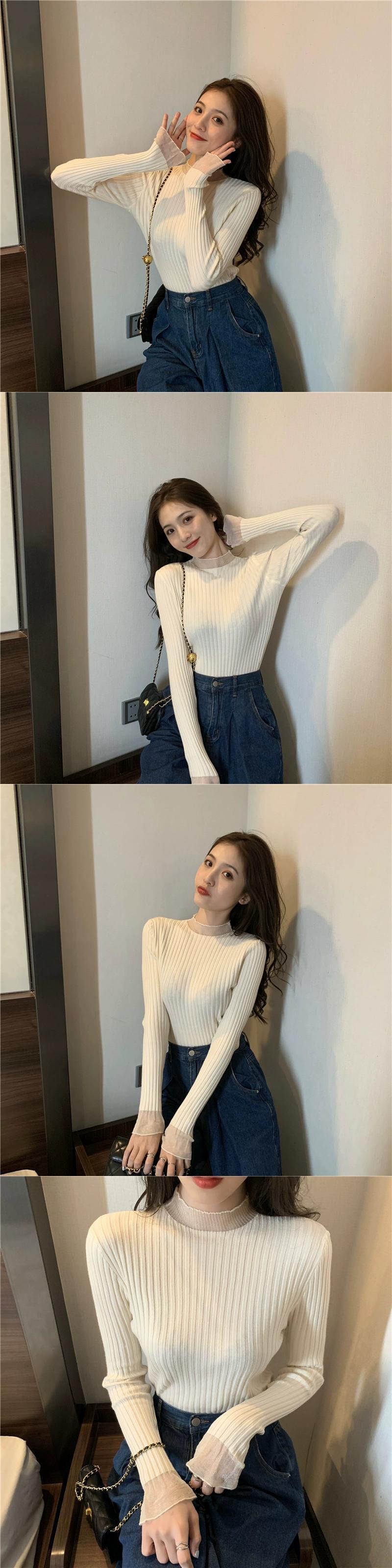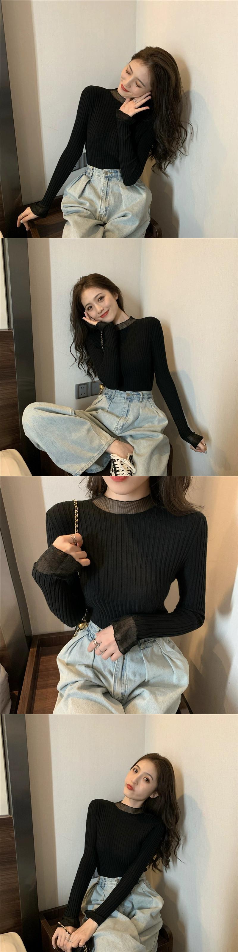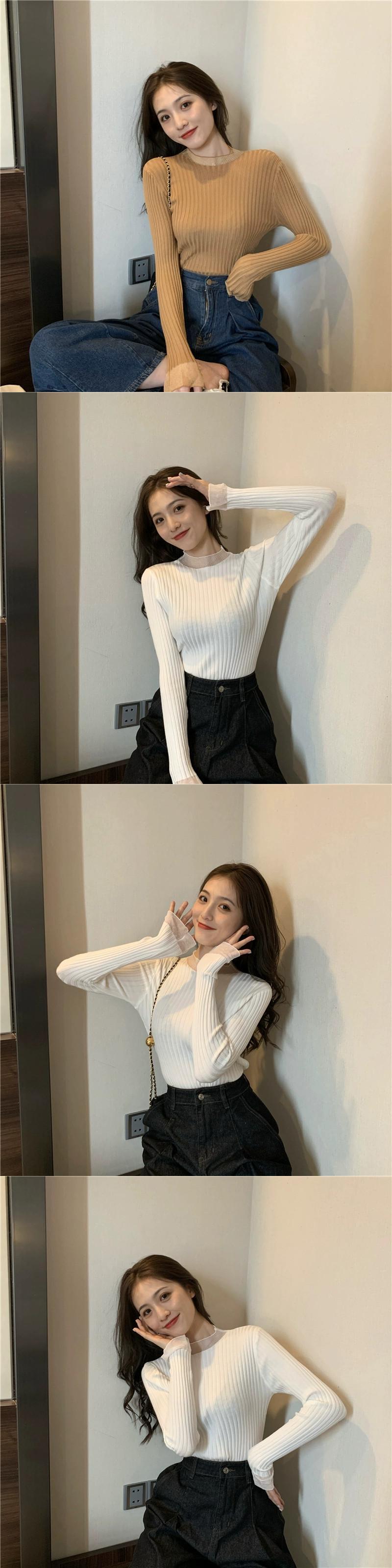 ハーフタートルネックニットボトムシャツレディース、2023年秋冬の新しいスタイル、スリムフィット、メッシュ長袖セーター ロング オータム 秋物 ウィンター 冬物 7460058001637259 | framboise21