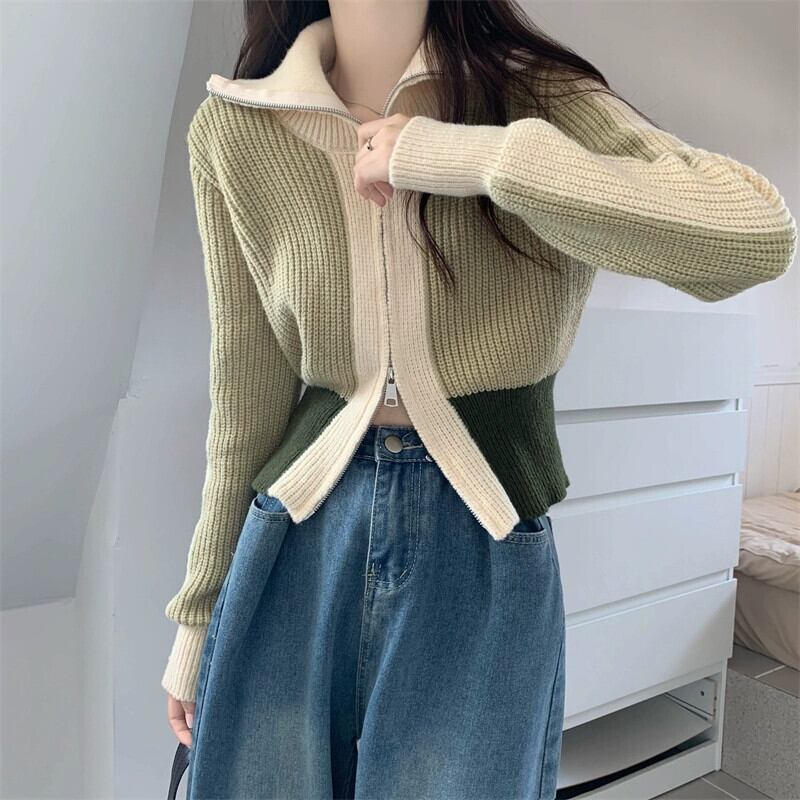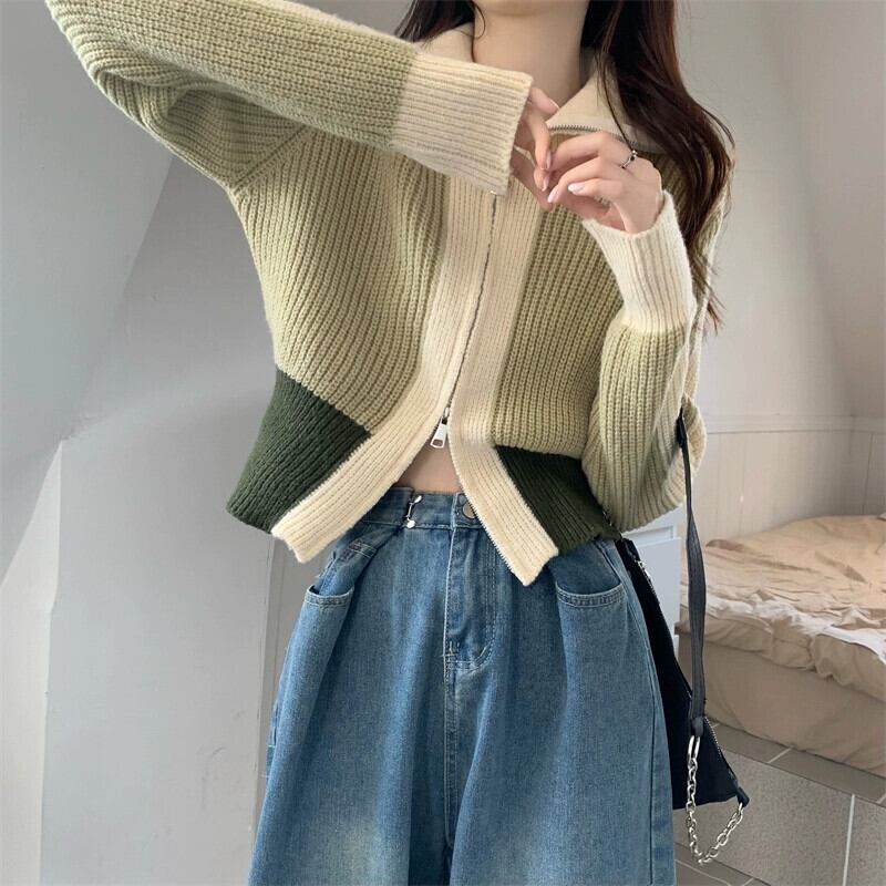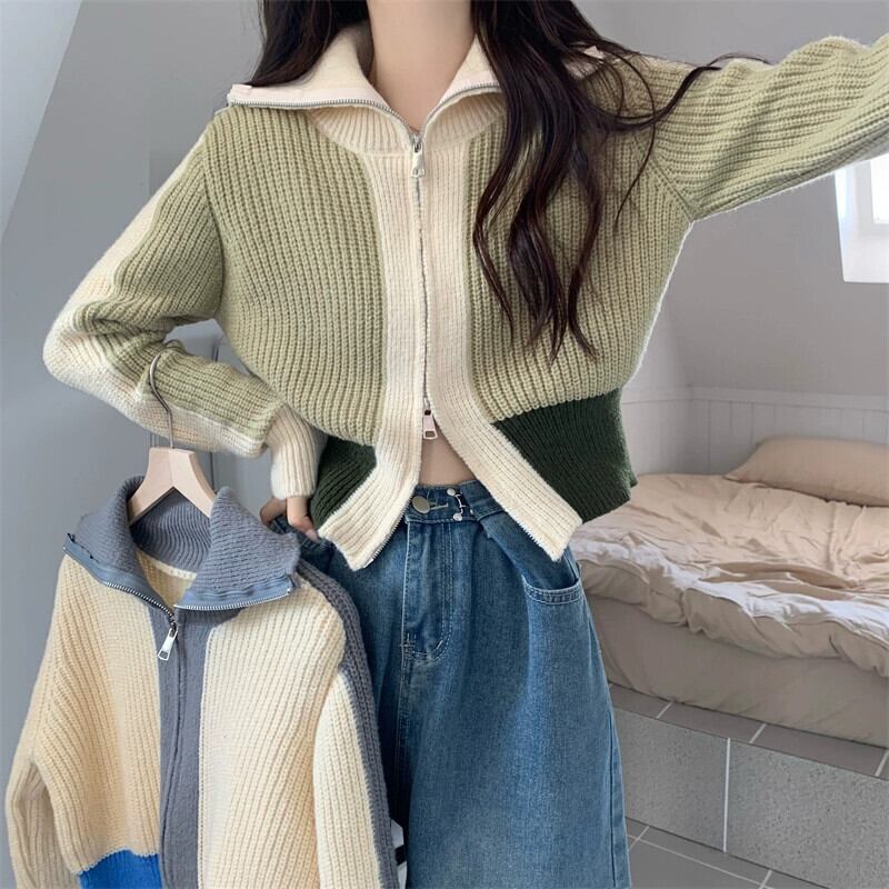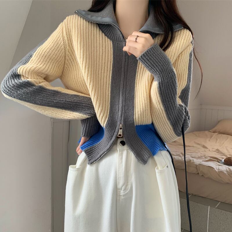 秋と冬のジッパーラペルショートカーディガンセータージャケット女性、ゆったりとしたアウターウェアの小さな人、厚く対照的な色のニットセーター オータム 秋物 ウィンター 冬物 7460096261578964 | framboise21