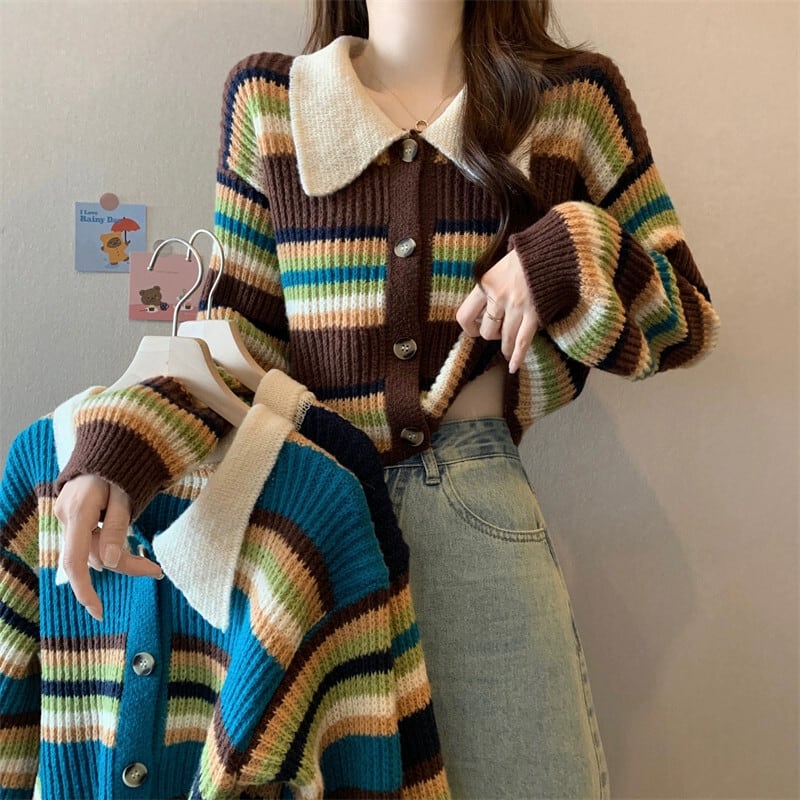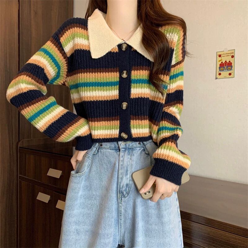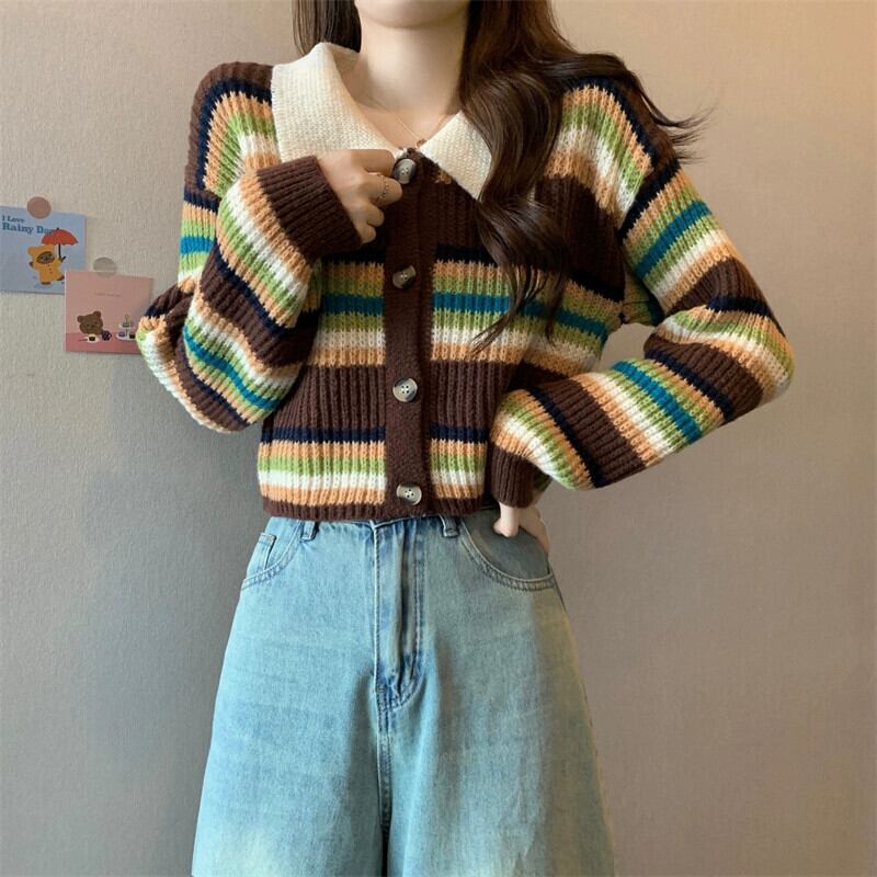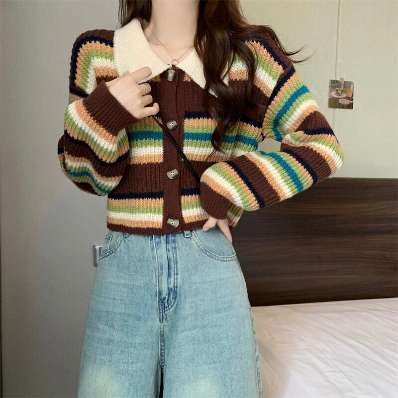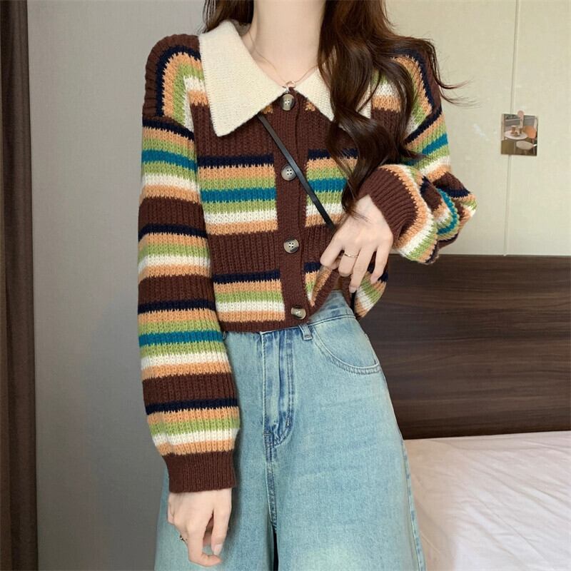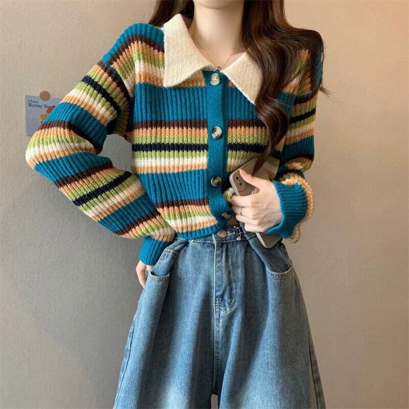 カラーブロックストライプのポロカラーセータージャケット、秋冬の女性、ゆったり、スリムで多用途のショート長袖ニットカーディガン ロング オータム 秋物 ウィンター 冬物 7460077944113309 | framboise21