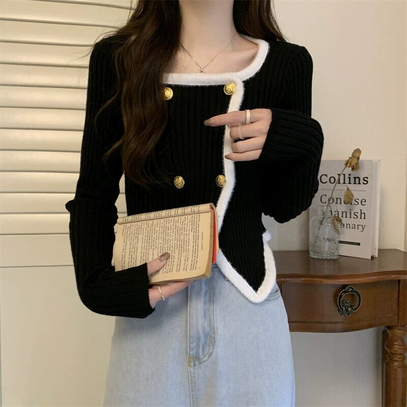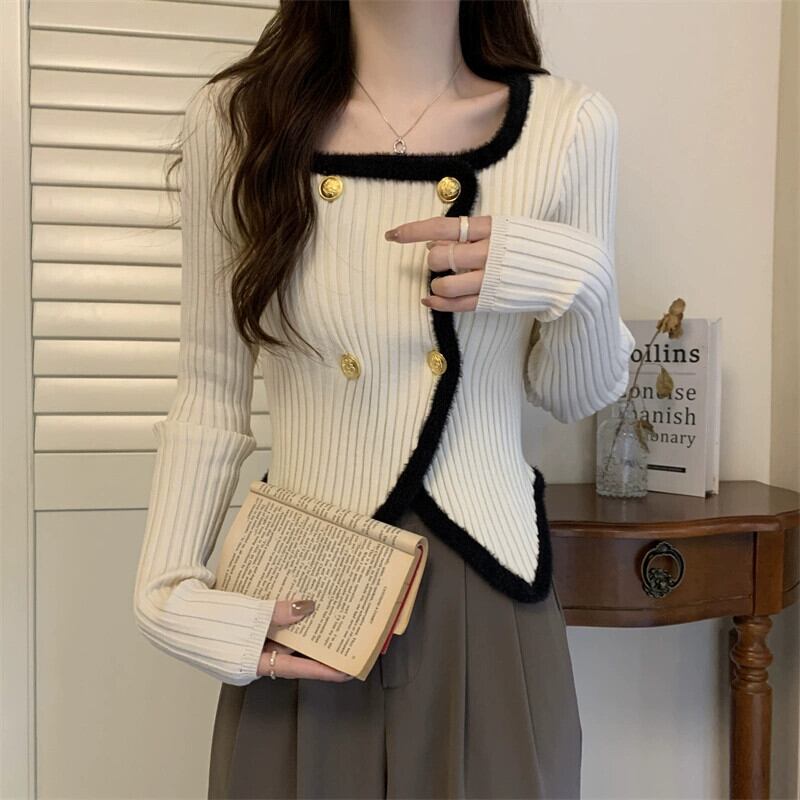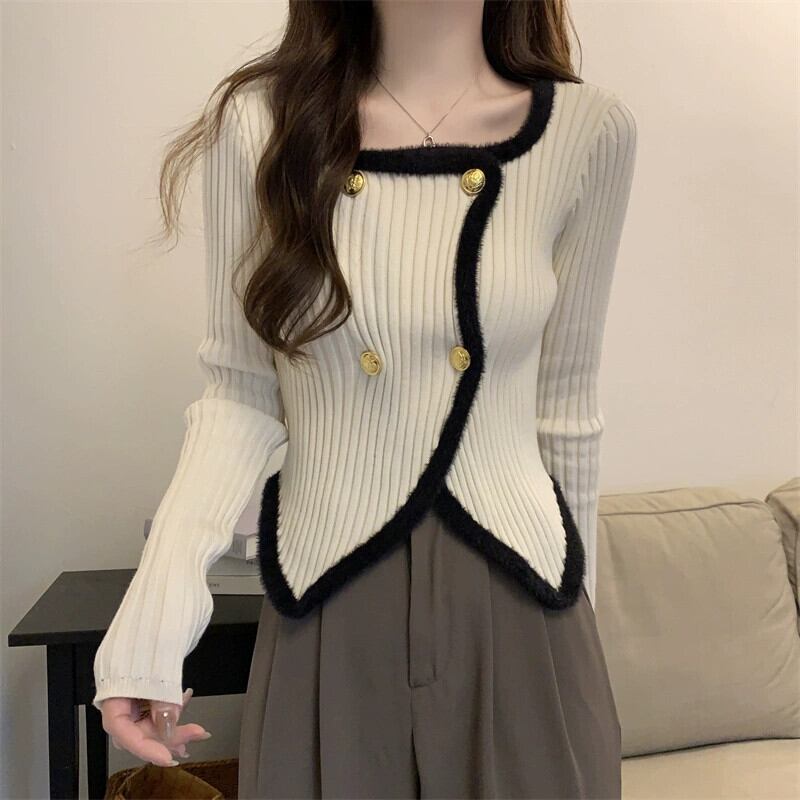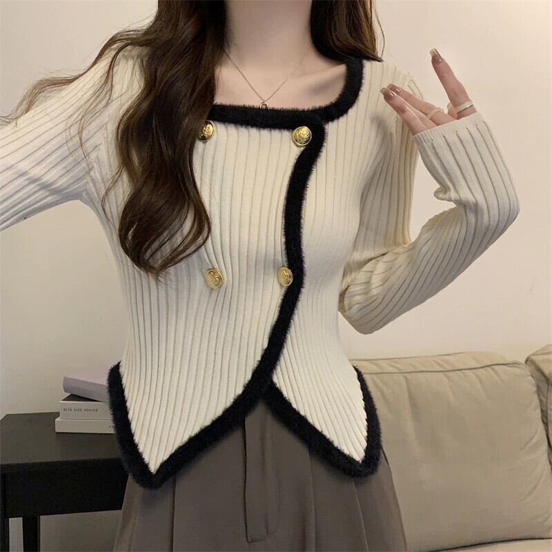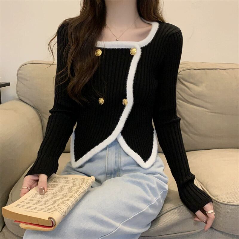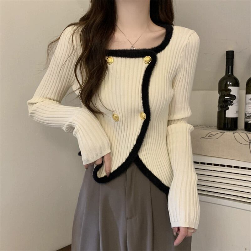 秋冬の不規則なスクエアカラーのボトリングシャツの女性、ファッショナブルでスリム、短い長袖ニットセーター、小柄な人。 ショート ロング オータム 秋物 ウィンター 冬物 スクウェア 746007589410196 | framboise21