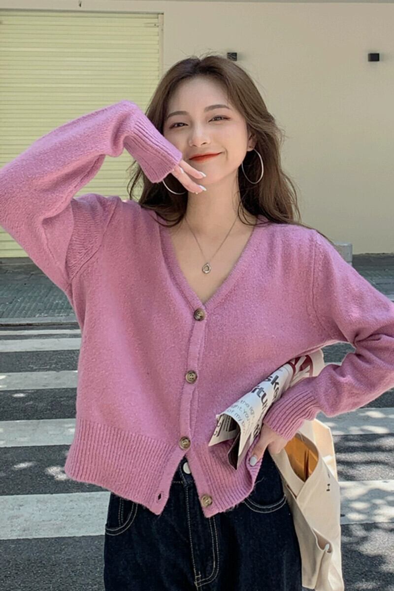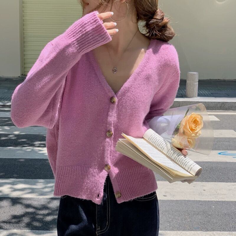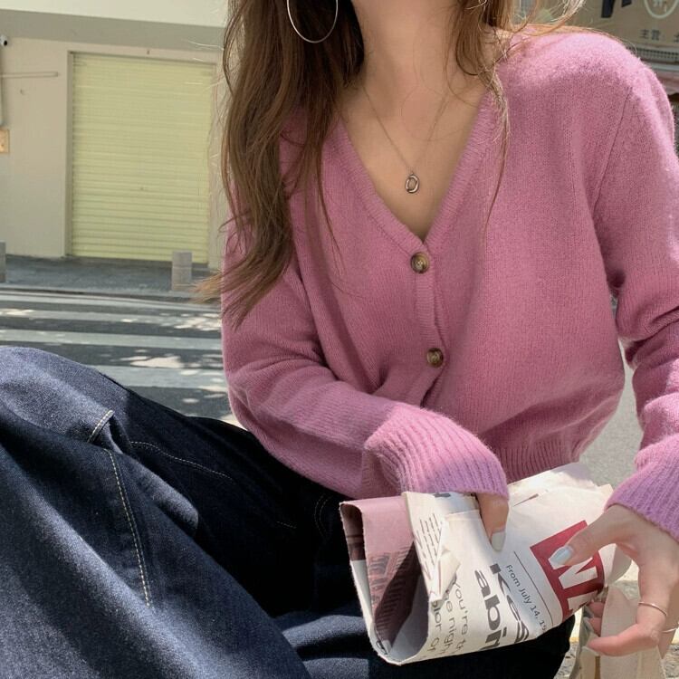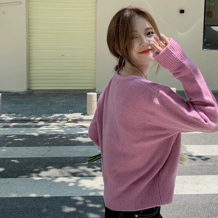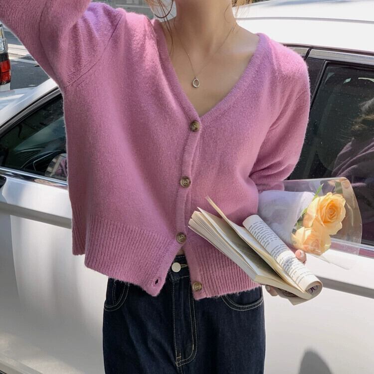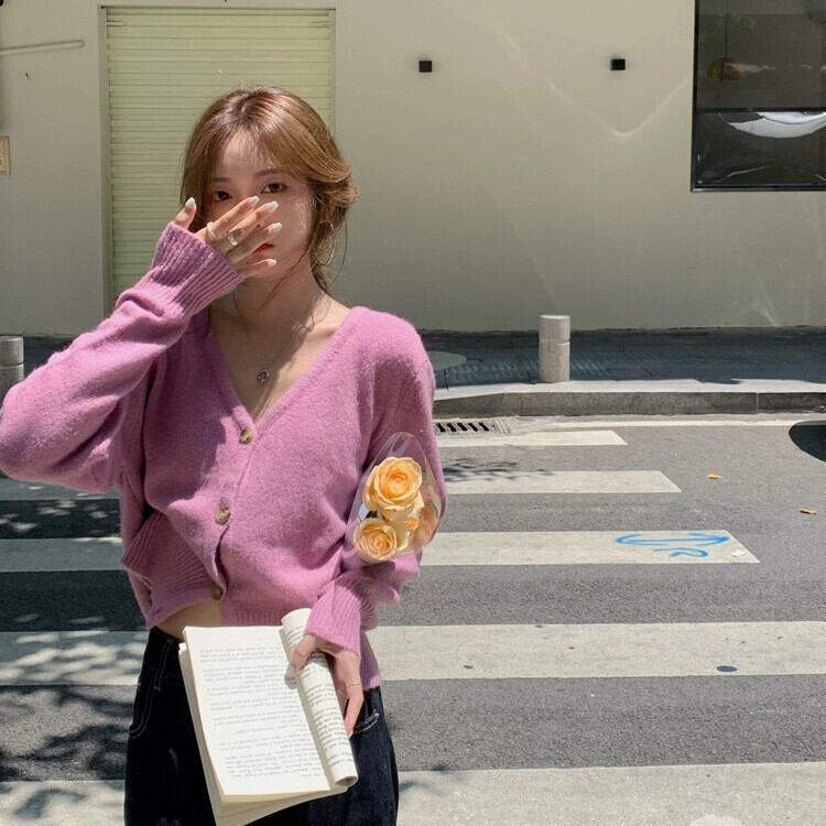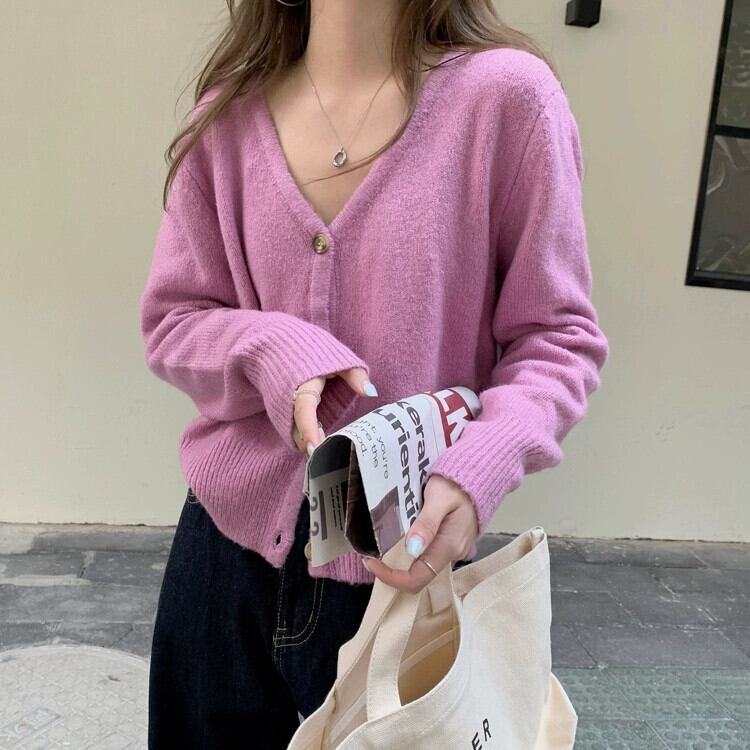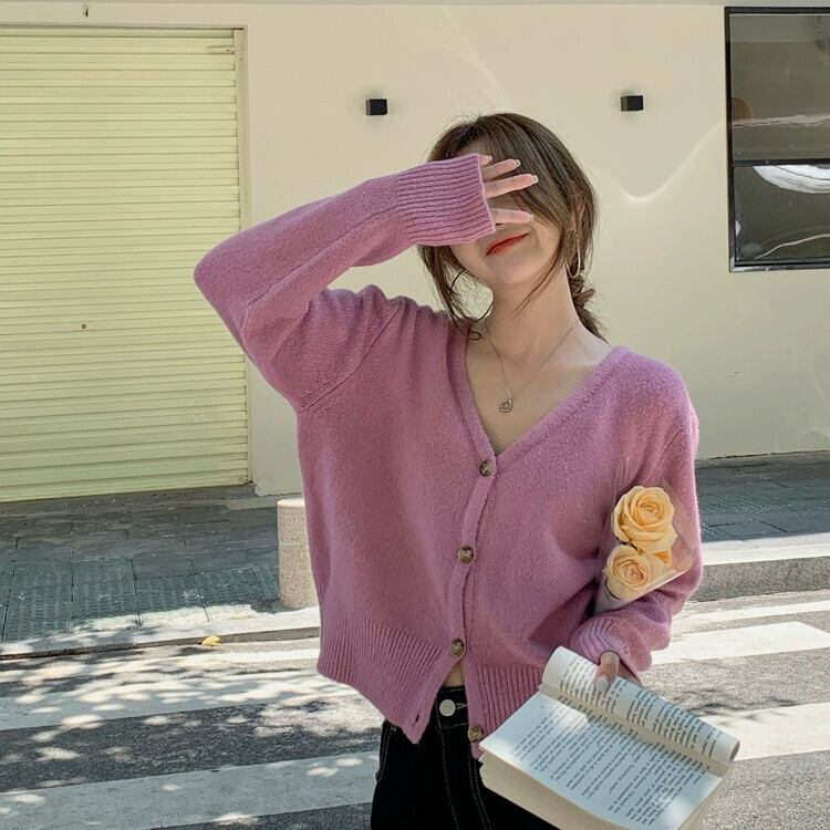 紫色のショート V ネックカーディガンセータージャケット女性秋と冬のソフトスタイルルーズアウターウェアスリム長袖セーター ロング オータム 秋物 ウィンター 冬物 Vネック パープル 7460098059417343 | framboise21